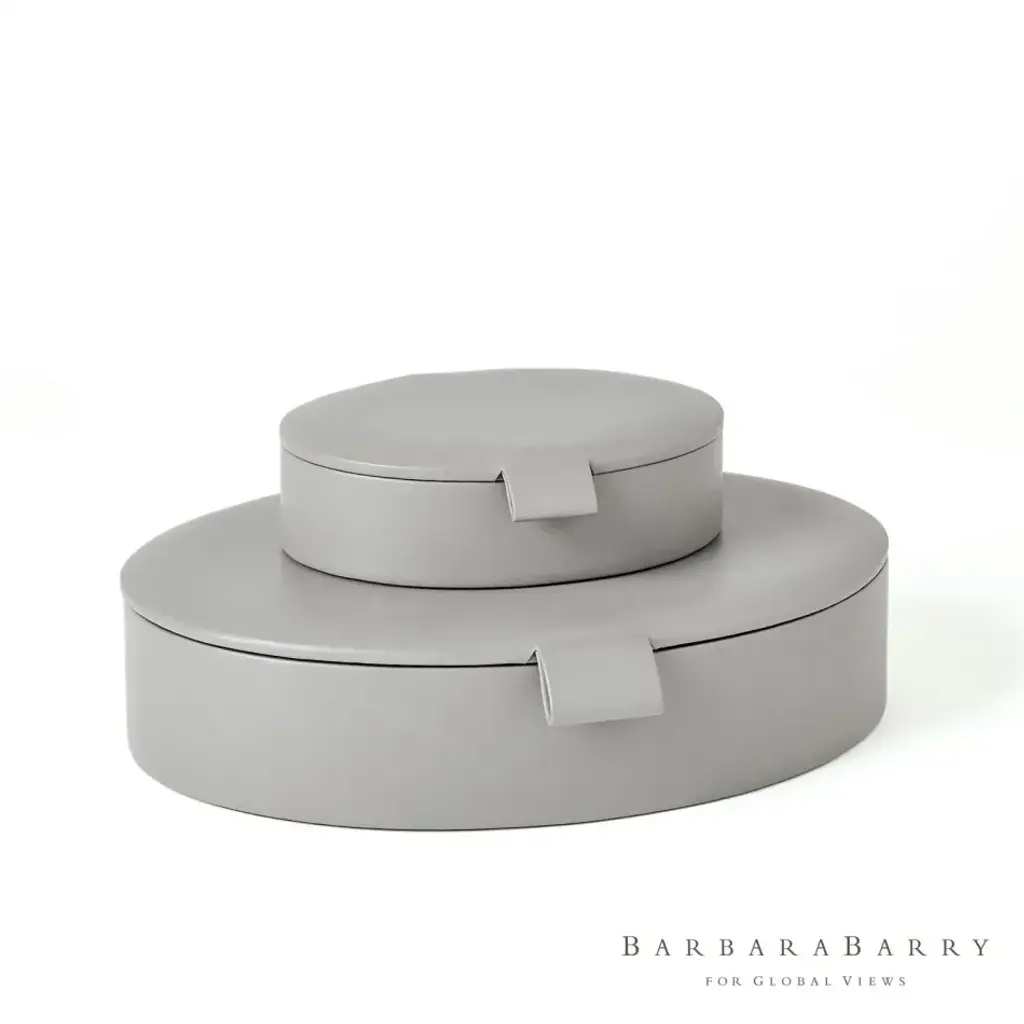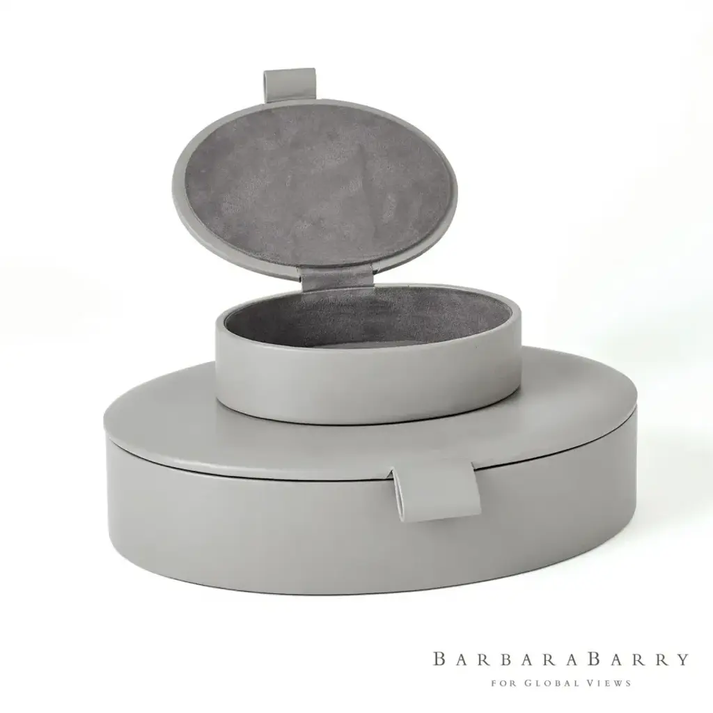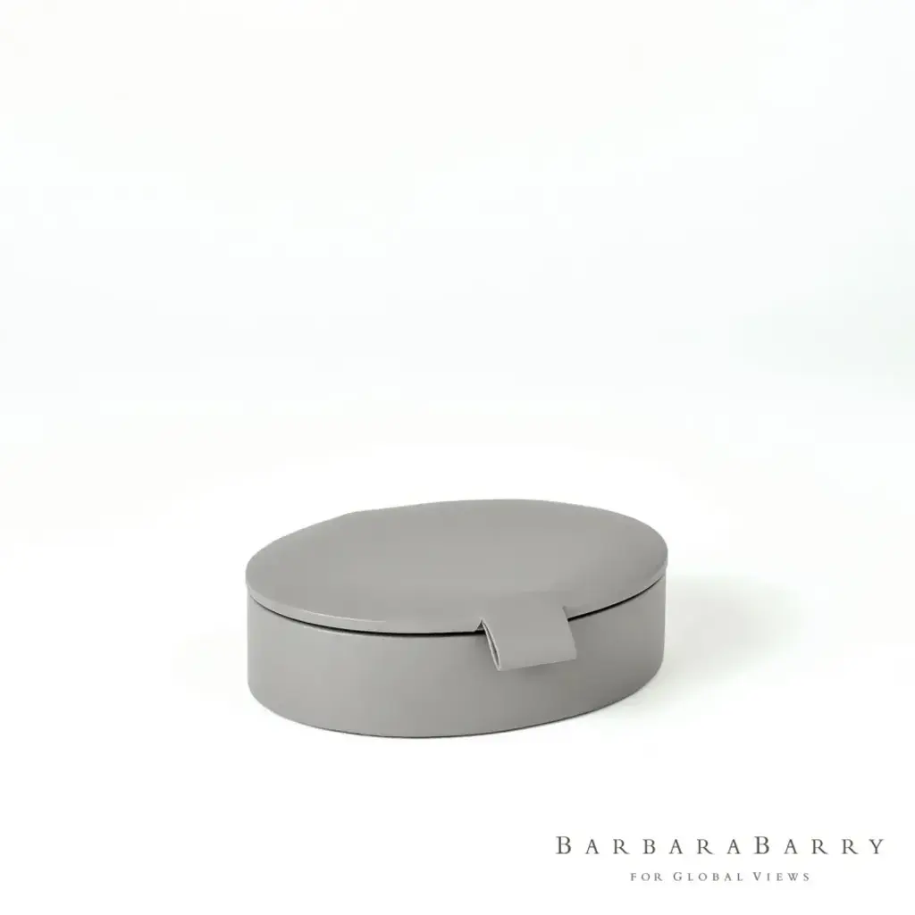Bring a Barbara Barry classic to your home with the Signature Oval Leather Boxes. These boxes are offered in a soft ivory or rich grey with leather pulls and lined in suede. From a fashion forward perspective, Global Views offers accessories, furniture, statement lighting, and an assortment of rugs and mirrors to add beauty and joy to your home.