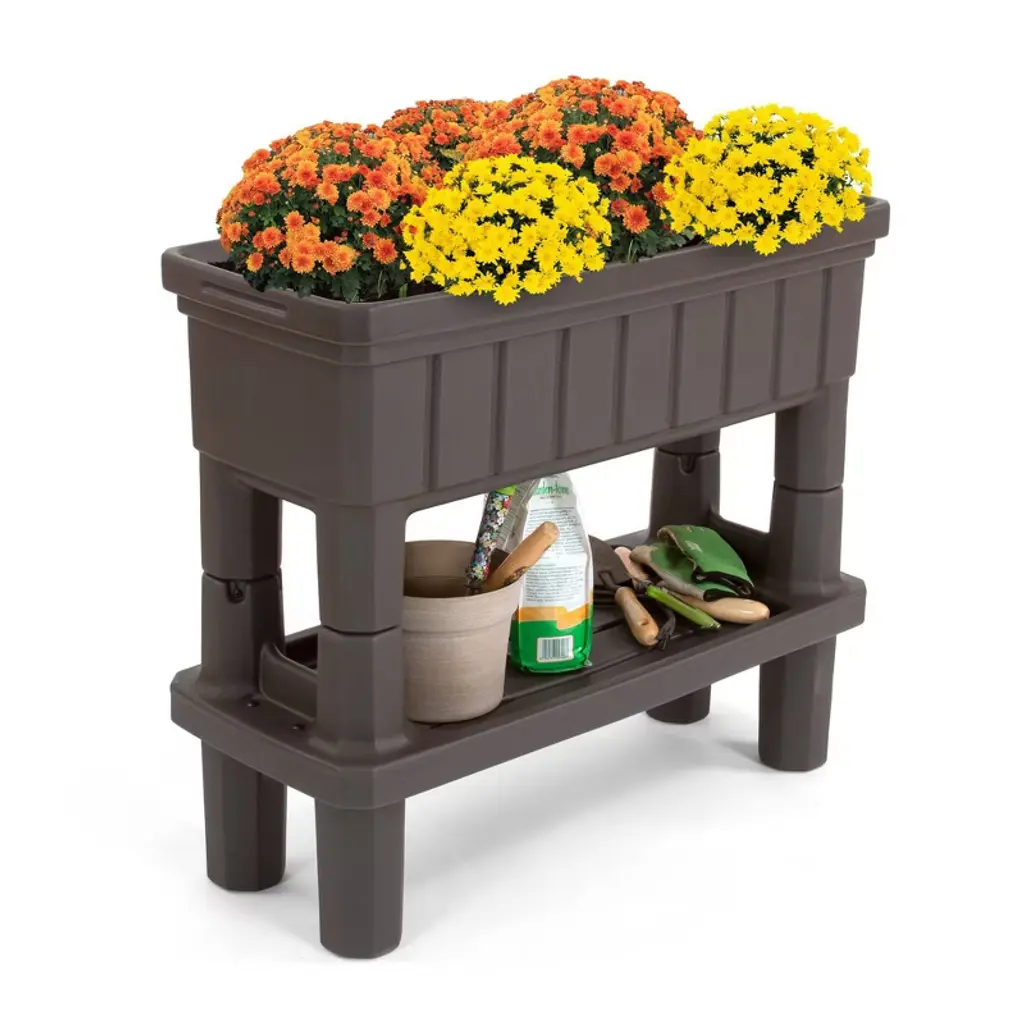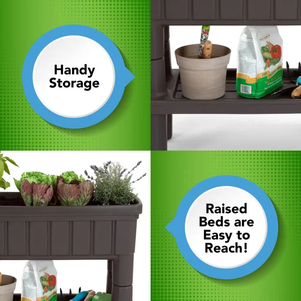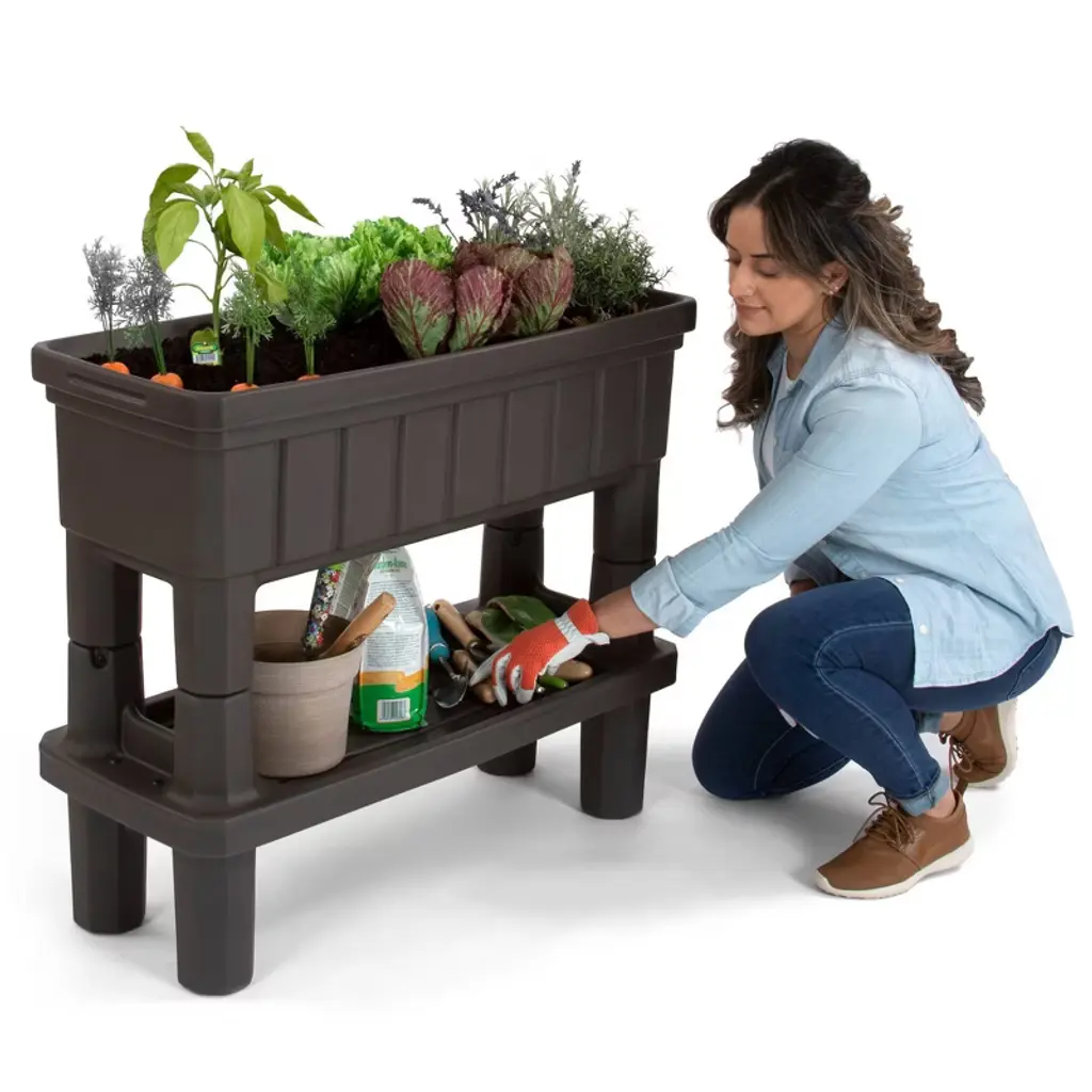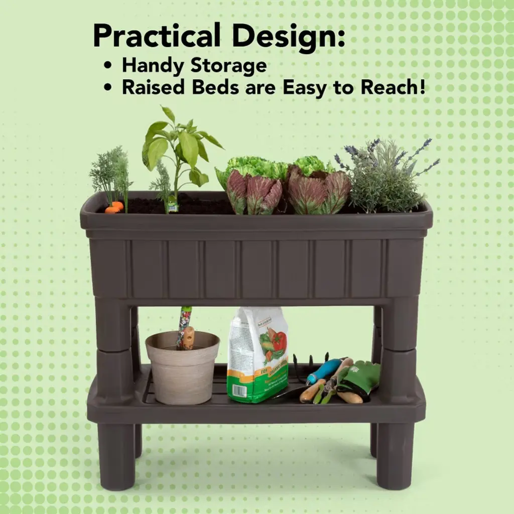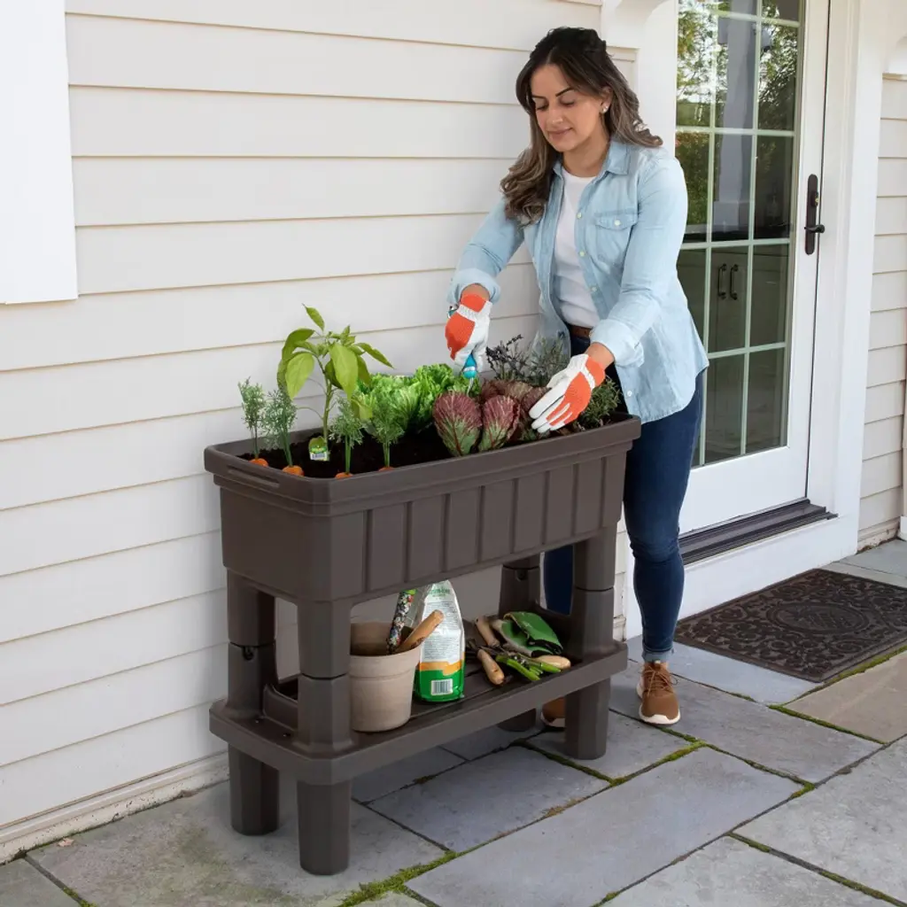 The Raised Patio Garden with Storage by American Home is the easy care solution to grow vegetables, herbs and flowers without kneeling or bending and easily access your garden from a comfortable standing or sitting position. Similar to the height of a countertop, the American Home Raised Patio Garden from Simplay3 is perfect for urban spaces or patio gardens and requires minimal assembly. Store useful gardening supplies, tools, or flower pots on the handy planter shelf below.