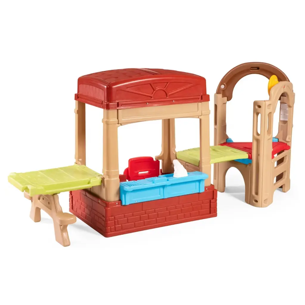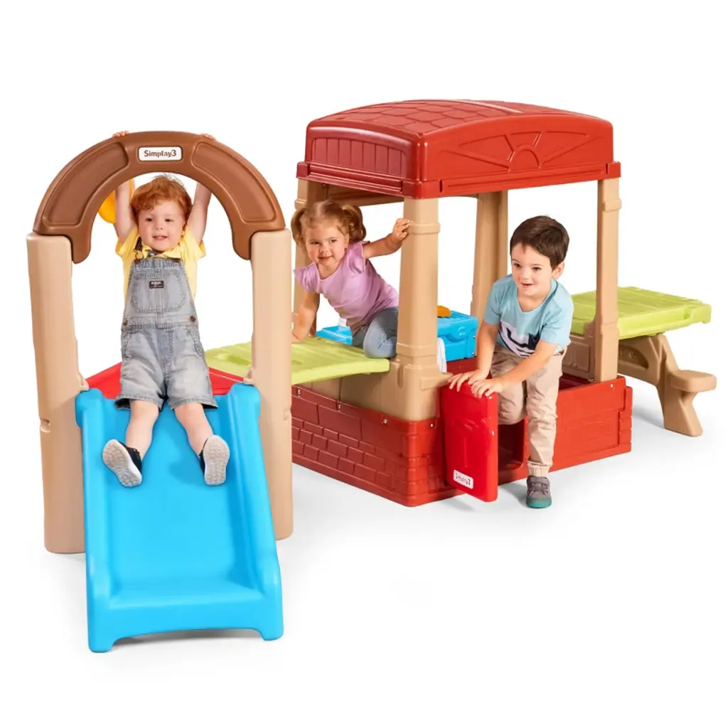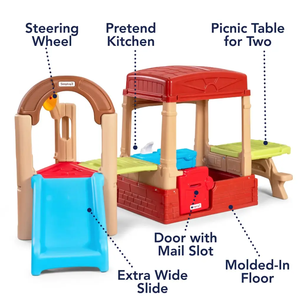 Spark and fuel your little one's imagination with the Simplay3 Sunny Slide and Climb Picnic Playhouse! Kids and toddlers will love this cozy 2-in-1 playhouse with picnic table and an active play slide, climb and drive platform! This indoor or outdoor kids playhouse and activity climber has a working Dutch door with mailbox slot, a UV and weather-resistant roof for sun and rain protection, a floor with a secret treasure map, a molded-in shelf for small toys, and a full make-believe kitchenette. The attached crawling rampleads to an extra wide slide, climbing wall with hand holds and fun pretend driving steering wheel.