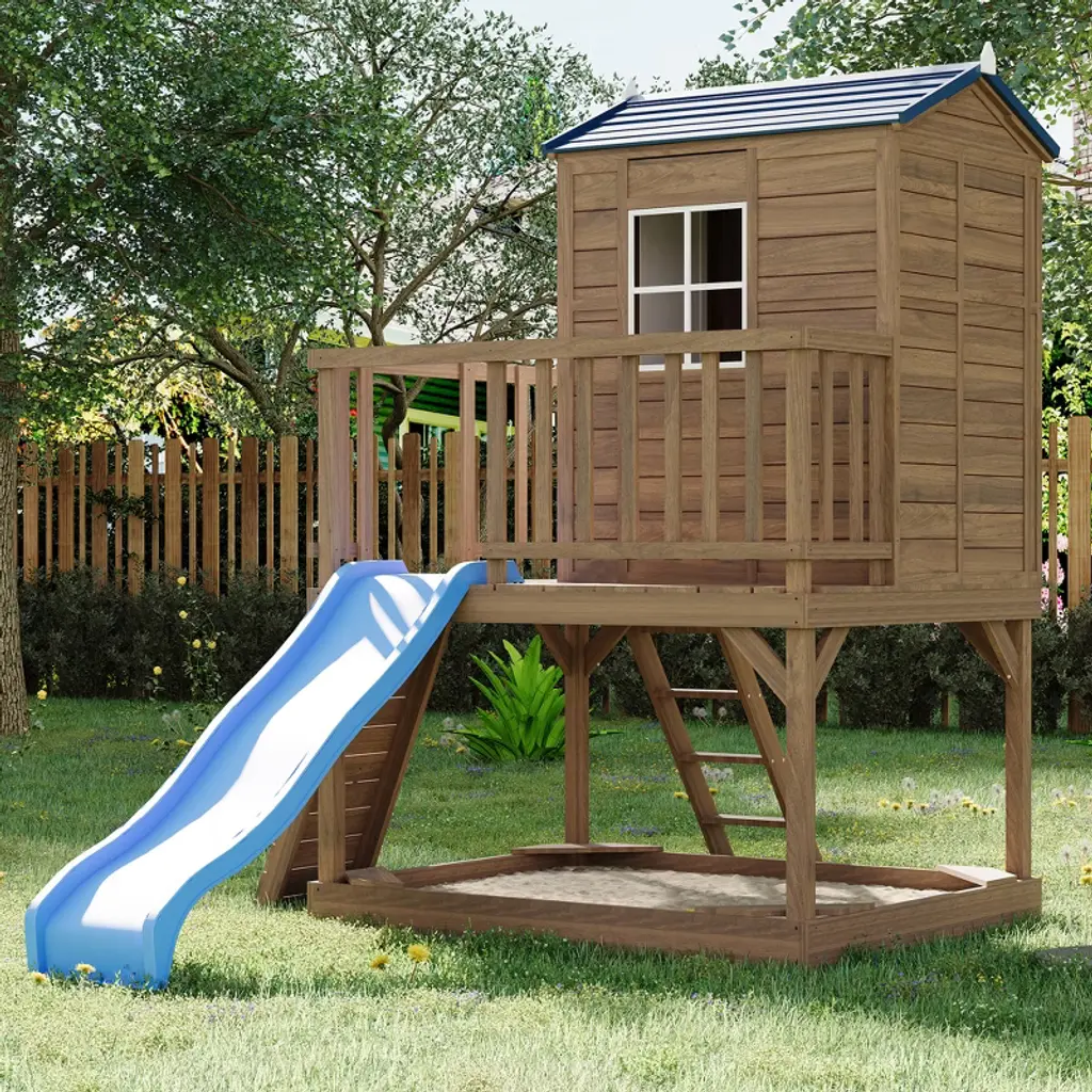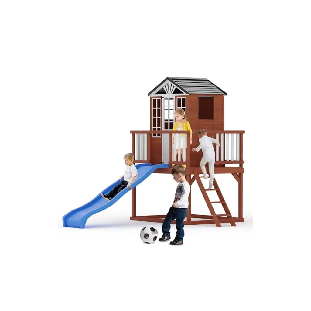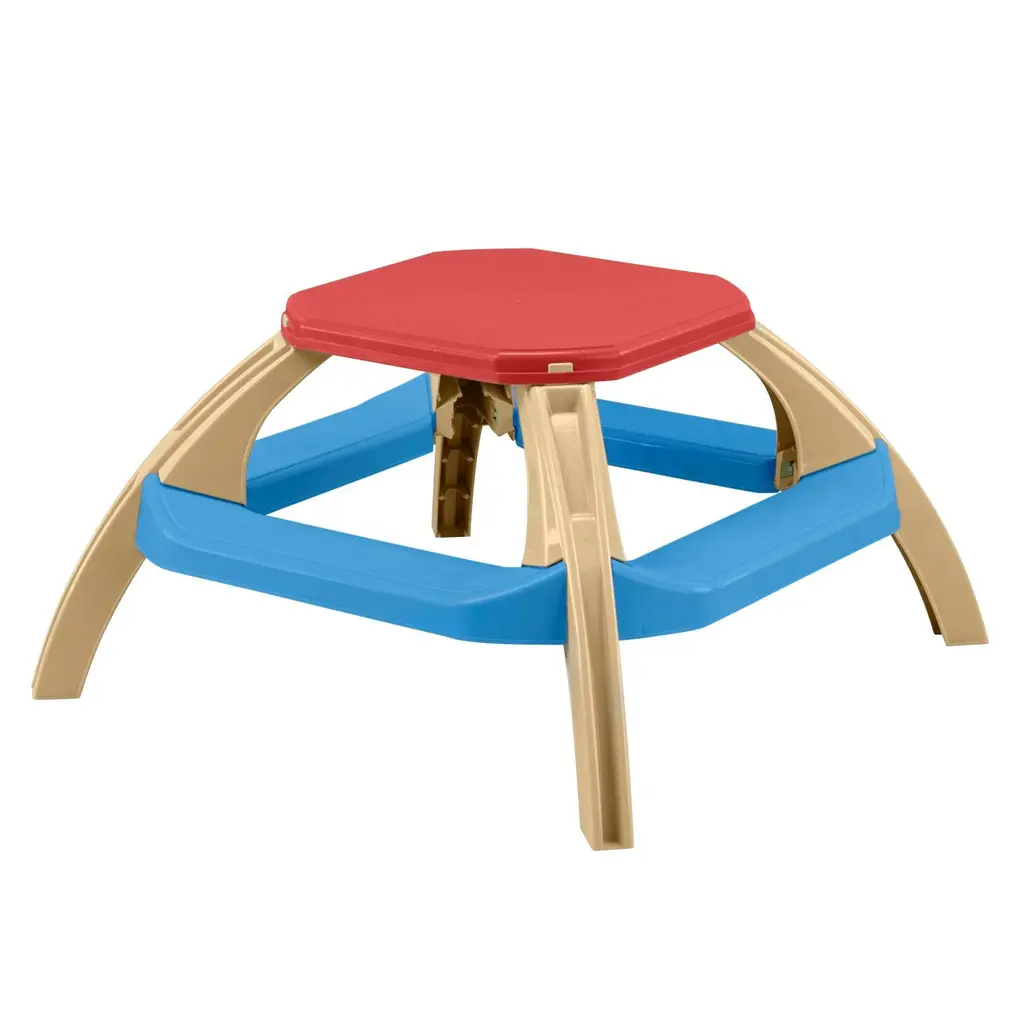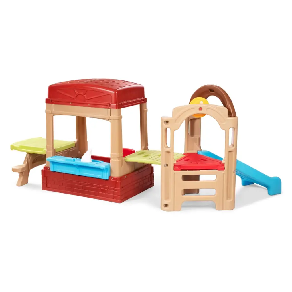 Spark and fuel your little one's imagination with the Simplay3 Sunny Slide and Climb Picnic Playhouse! Kids and toddlers will love this cozy 2-in-1 playhouse with picnic table and an active play slide, climb and drive platform! This indoor or outdoor kids playhouse and activity climber has a working Dutch door with mailbox slot, a UV and weather-resistant roof for sun and rain protection, a floor with a secret treasure map, a molded-in shelf for small toys, and a full make-believe kitchenette. The attached crawling rampleads to an extra wide slide, climbing wall with hand holds and fun pretend driving steering wheel.