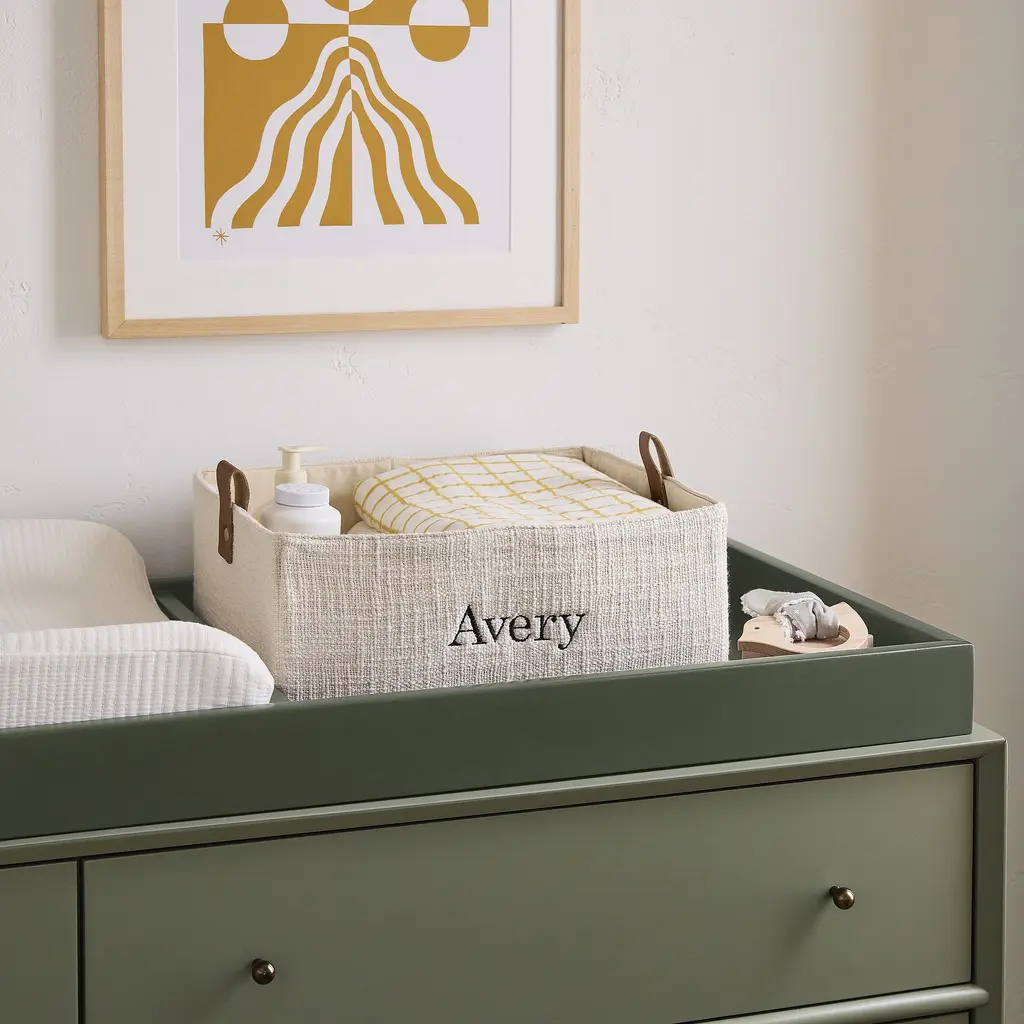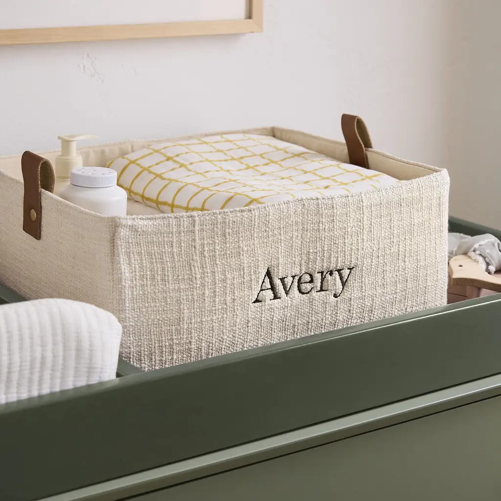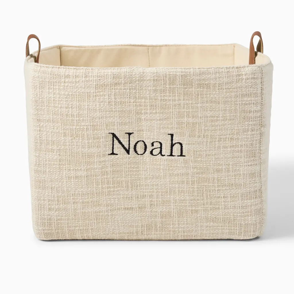 Brought to you in collaboration with Pottery Barn Kids. The perfect fit in a bedroom or playroom. Holds stuffed animals, toys and other knickknacks. Faux leather handles make them easy to transport.