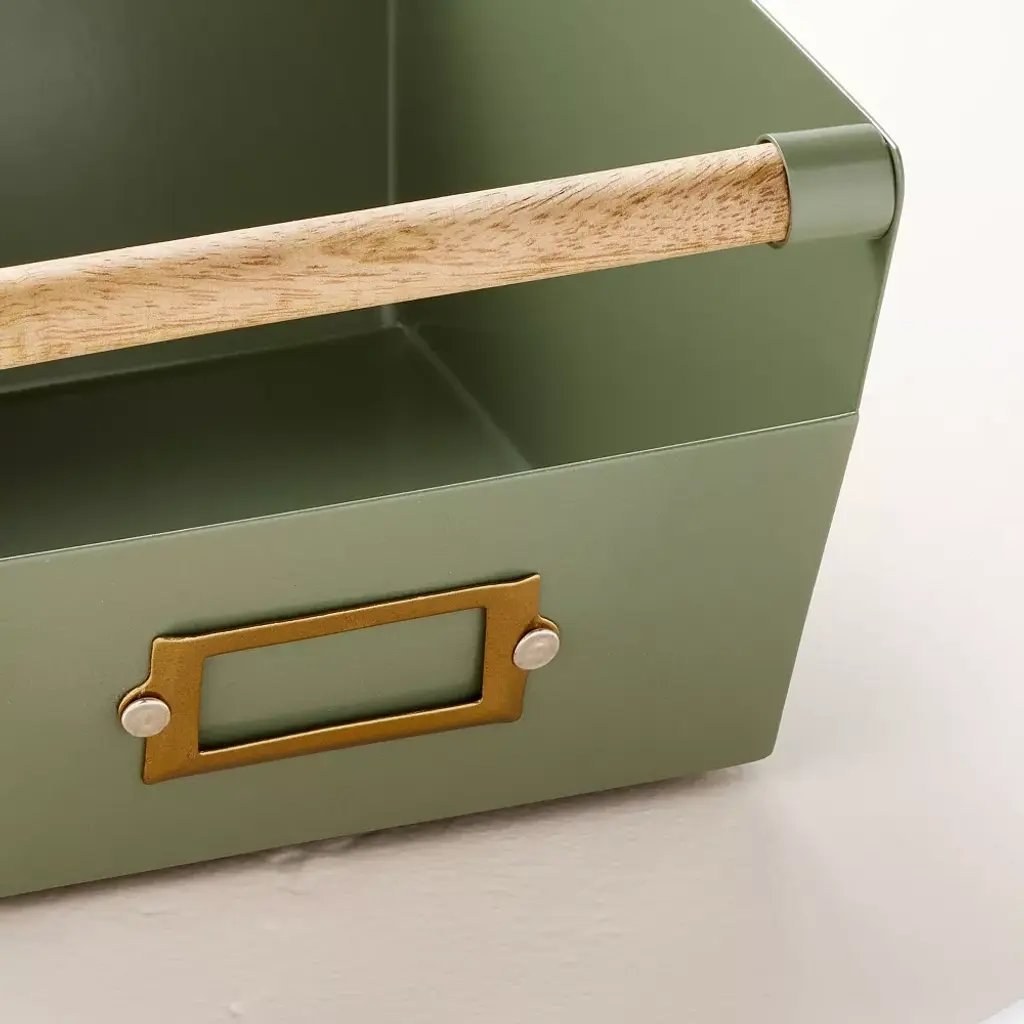 Keep your potting essentials organized nicely with the Small Metal and Wood Potting Bench Storage Bin from Hearth & Hand™ with Magnolia. This green storage bin is made with metal with an open top and a wooden handle at the front. It comes with a space to help write down the name of the contents for easy identification. Great to place on a shelf or tabletop, this small storage bin makes a perfect addition to your home. Hearth & Hand™ with Magnolia: Gather • Create • Enjoy