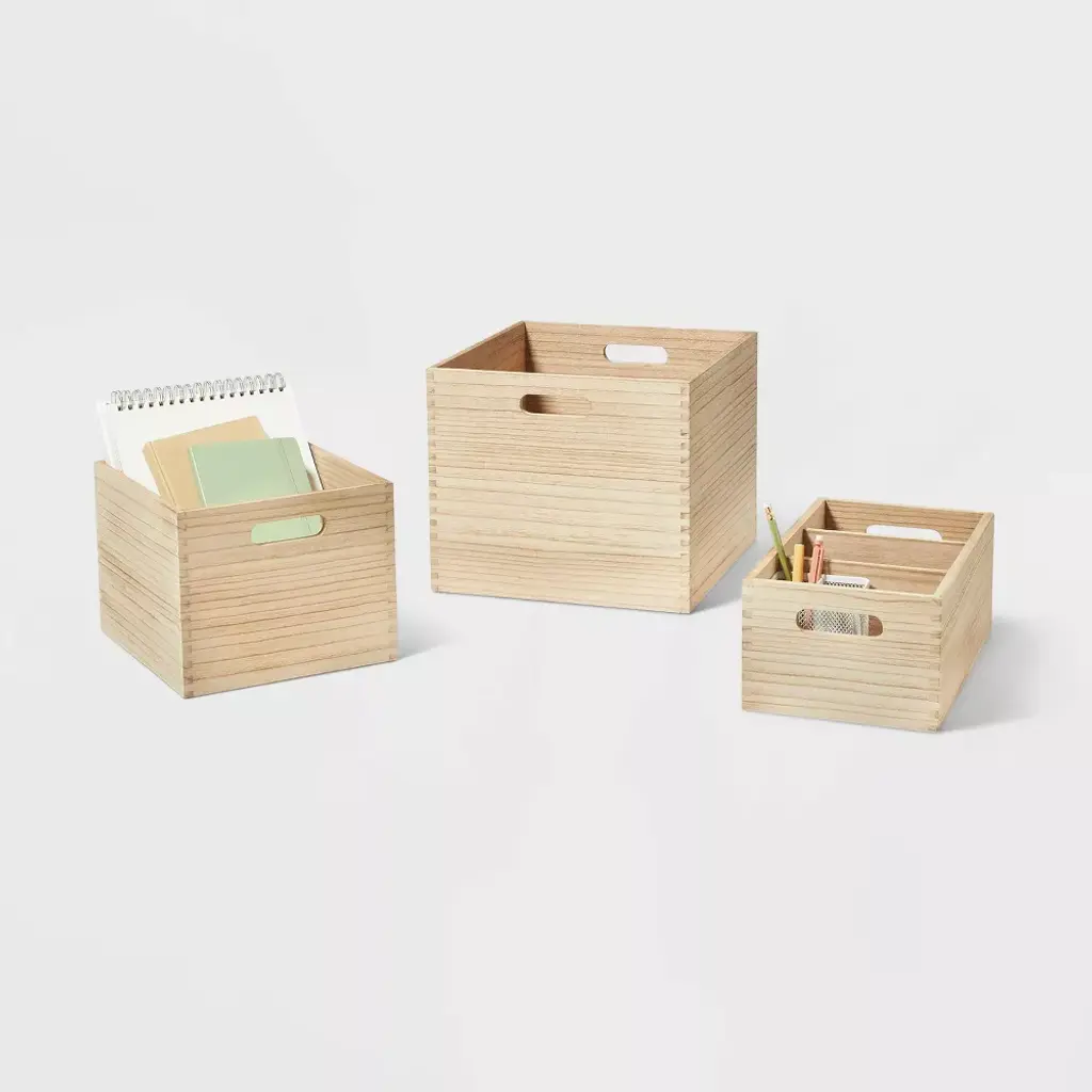 Simple yet stylish, this Small Decorative Light Wood Crate from Brightroom™ helps you keep everyday items conveniently organized and looking tidy. Featuring a simple square shape and wood construction, this light woodgrain storage crate is suitable for stashing a variety of items, from books to craft supplies to games and more. The open-top construction makes it easy to see the contents of the crate even on a shelf or in a cupboard, and the built-in handles make it simple to slide the bin out and grab what you need. Attractive enough to keep in the open, this Paulownia Wood storage crate is also compatible with the Brightroom 11-inch storage collection to use with shelves, utility carts and other storage solutions. Brightroom™ started with a simple truth: When you’ve got it together, you feel better. Our versatile designs reveal the possibility in every closet, cupboard and drawer, and work together to create brilliant ways to organize your every day. Overall Dimensions: 8 Inches (H), 10 Inches (W), 11 Inches (L) Bottom Dimensions: 10 Inches (W), 11 Inches (L) Interior Dimensions: 7.25 Inches (H), 9 Inches (W), 10 Inches (L)