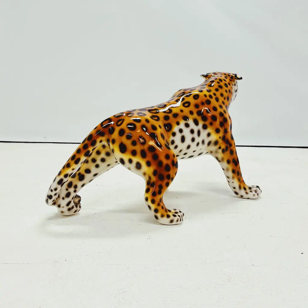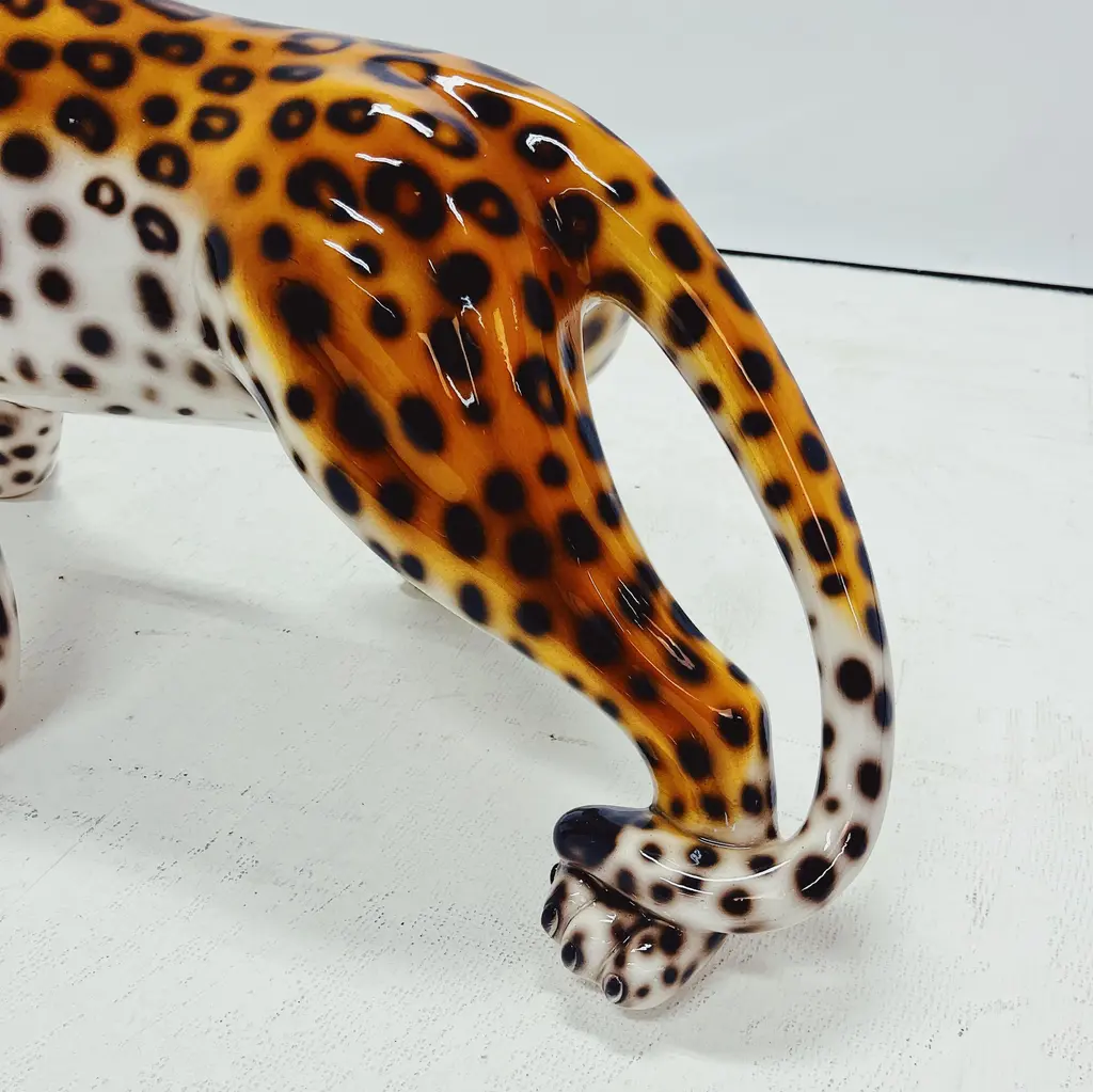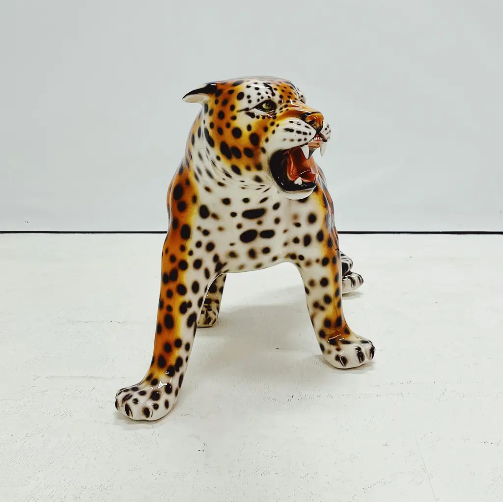 Unique handmade statue of a snow leopard. This Hollywood Regency statue, crafted from hand-painted ceramic and made in Italy, will undoubtedly add a stunning and sturdy look to your interior! All statues come directly from a family business in Northern Italy that has specialized in high-quality ceramic statues since 1985. Everything is made by hand, making each image unique. There are different types and sizes available, and customization is also possible. Dimensions Height: 56cm Width: 104cm Depth: 53cm Stamped by Maker
