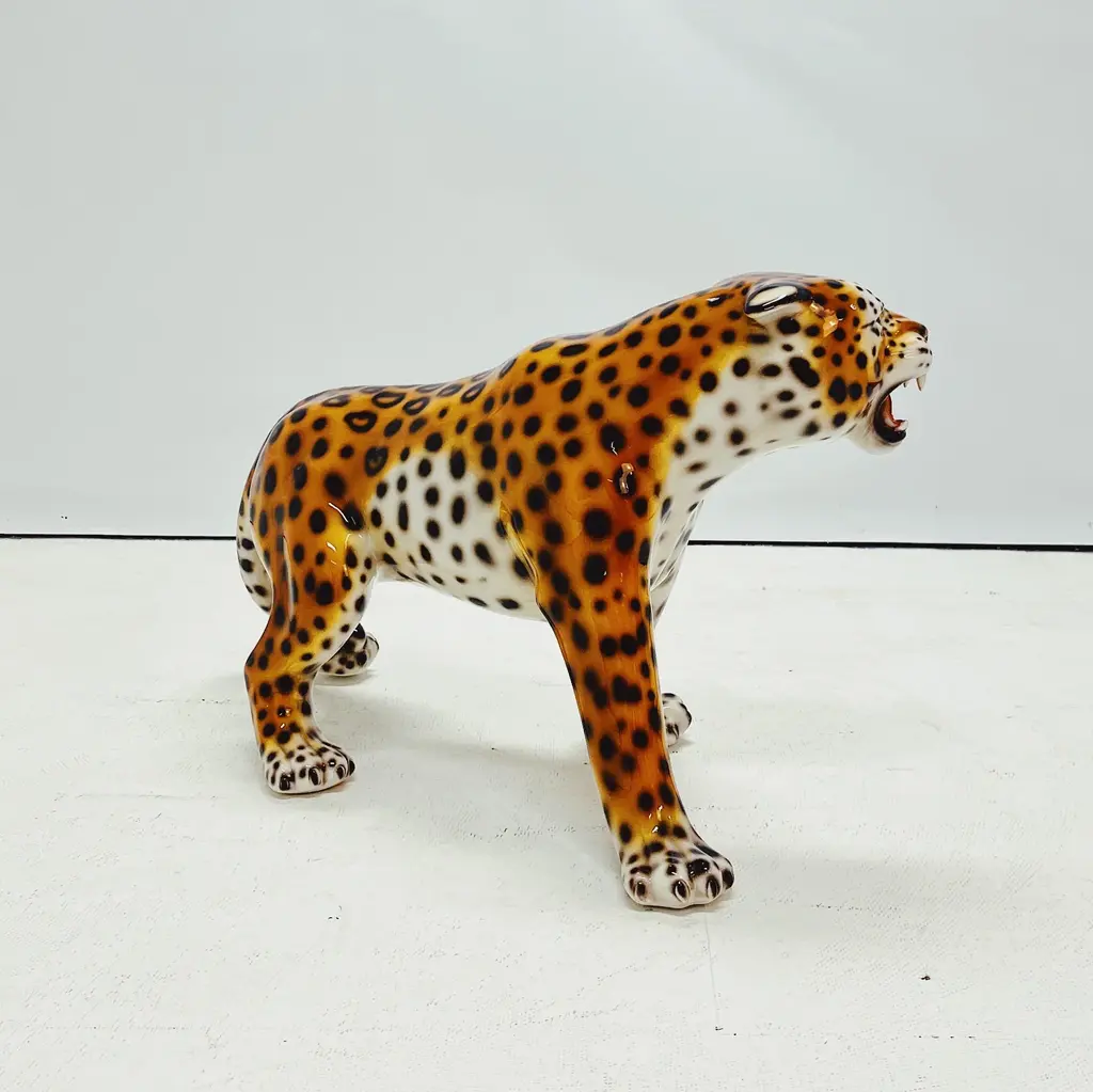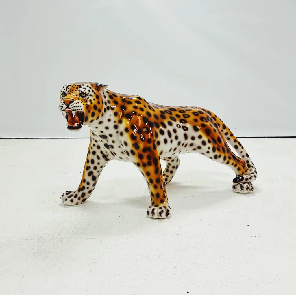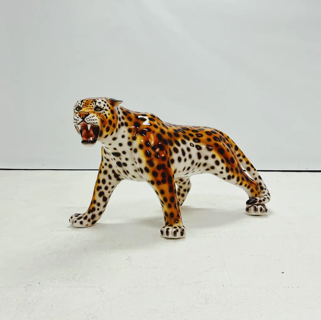 Unique handmade statue of a snow leopard. This Hollywood Regency statue, crafted from hand-painted ceramic and made in Italy, will undoubtedly add a stunning and sturdy look to your interior! All statues come directly from a family business in Northern Italy that has specialized in high-quality ceramic statues since 1985. Everything is made by hand, making each image unique. There are different types and sizes available, and customization is also possible. Dimensions Height: 56cm Width: 104cm Depth: 53cm Stamped by Maker