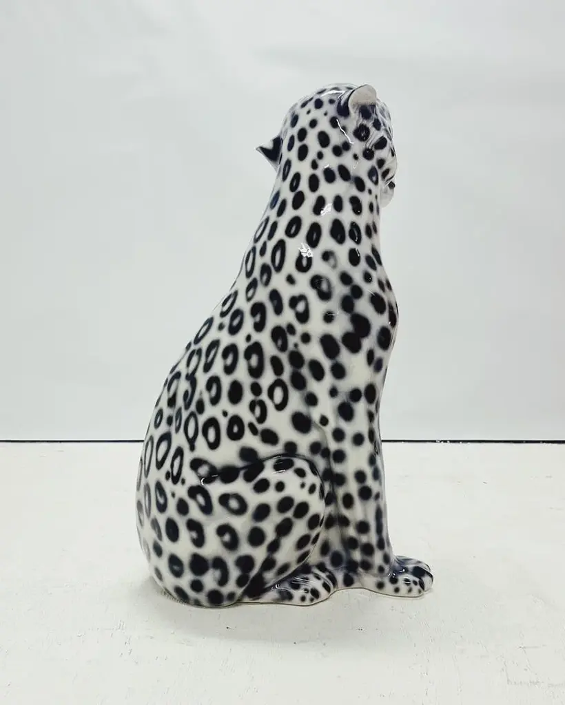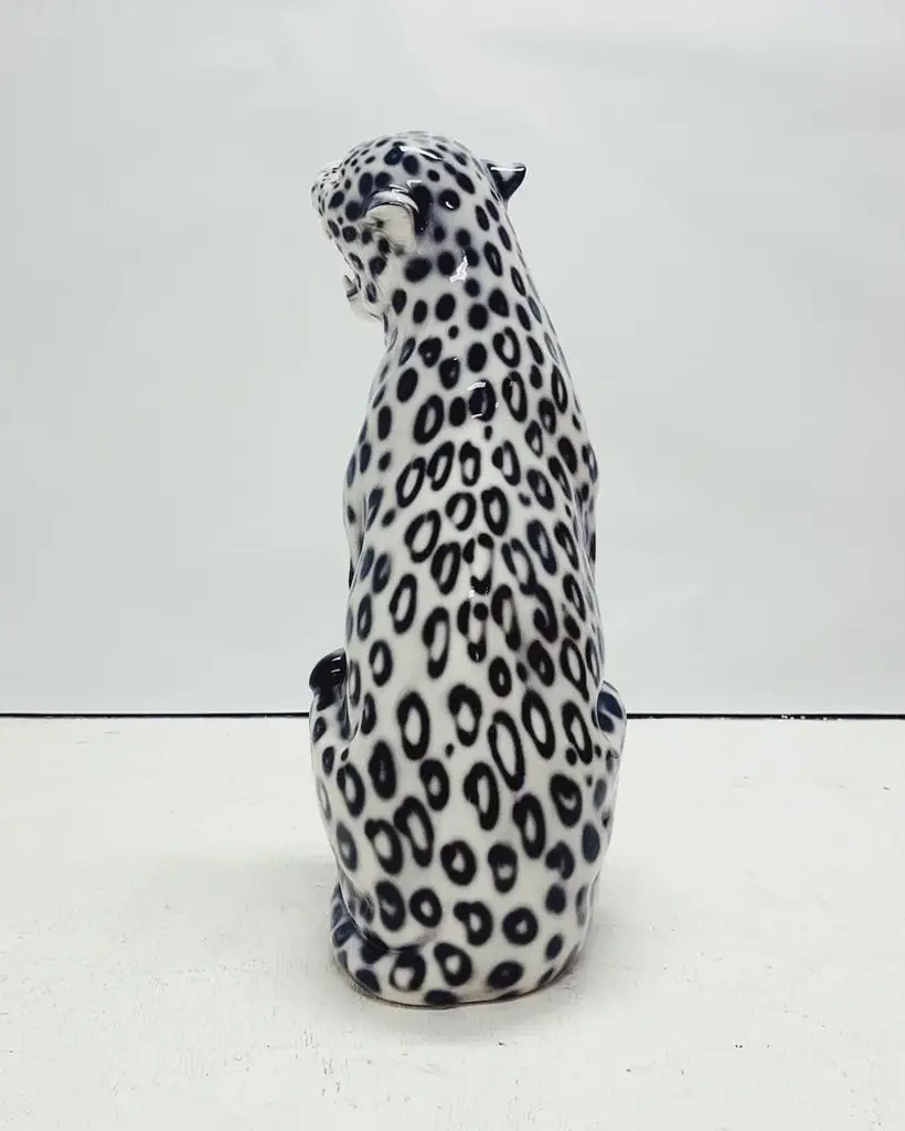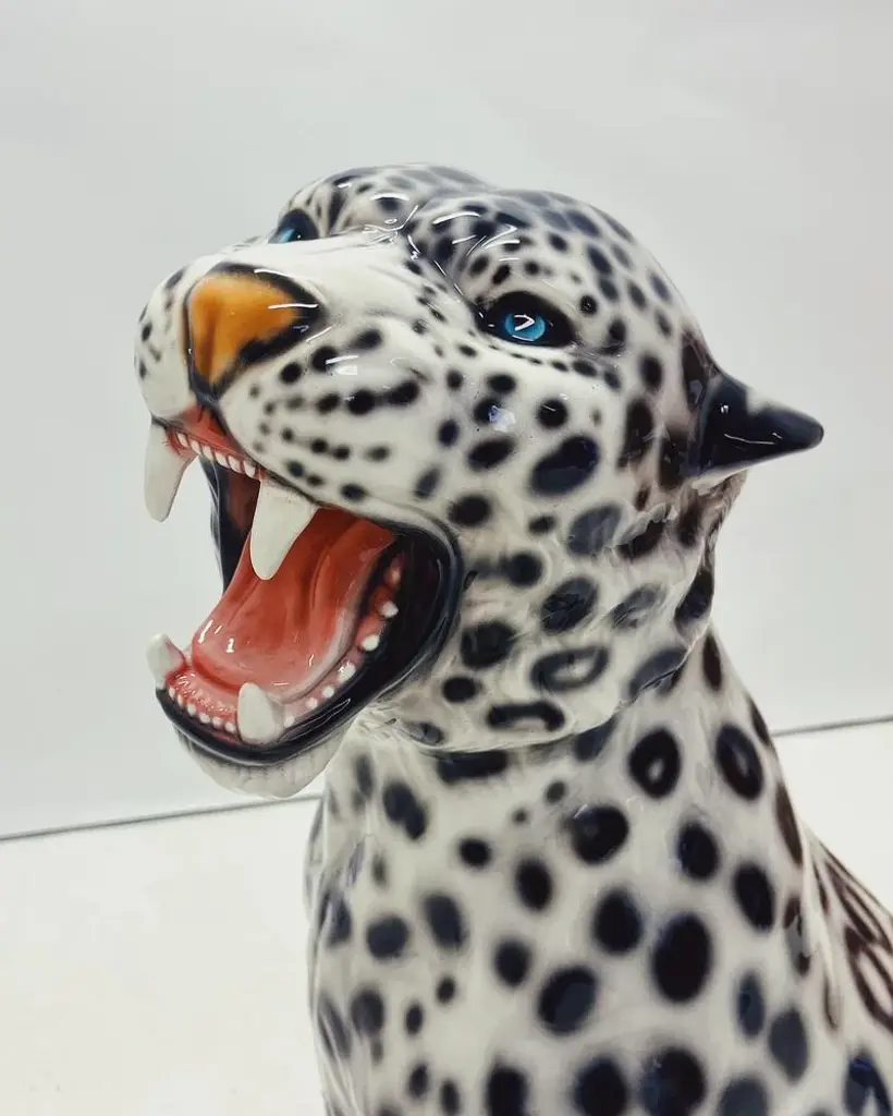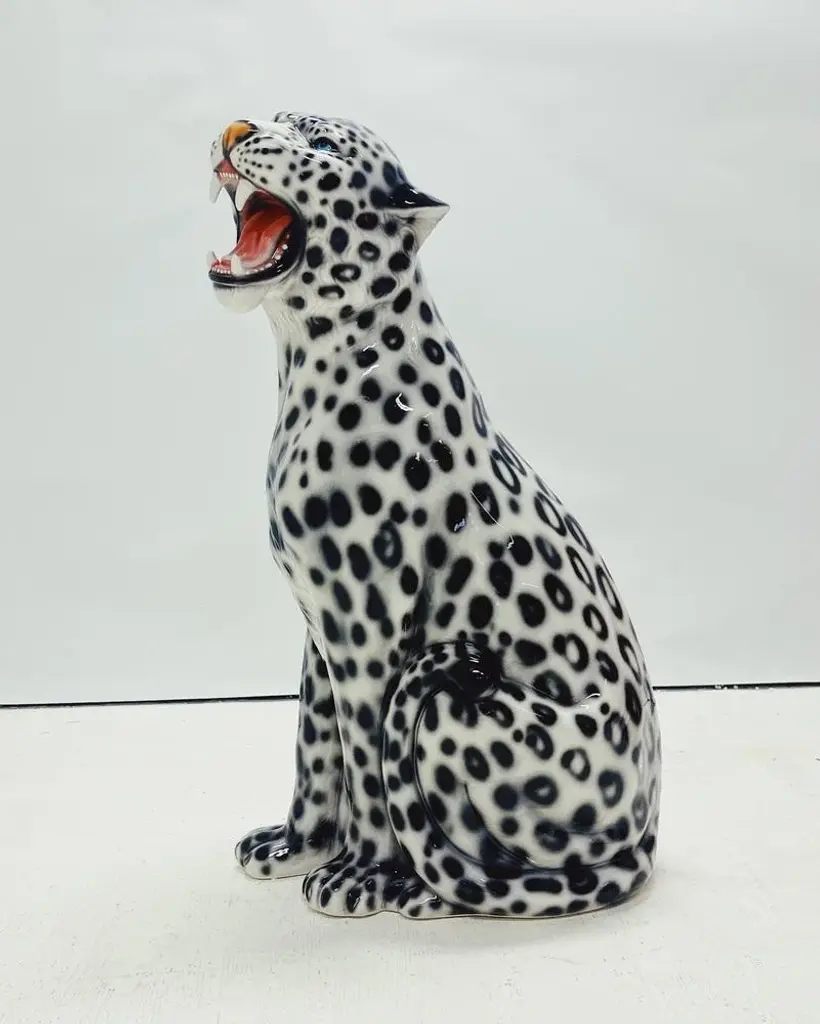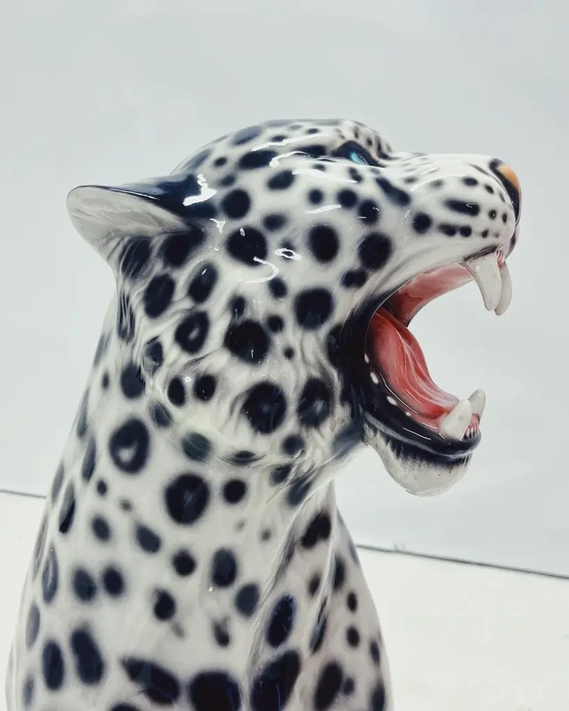 Unique handmade statue of a snow leopard. This Hollywood Regency statue, made of hand-painted ceramic and made in Italy, will undoubtedly add a stunning and cool look to your interior! All statues come directly from a family business in Northern Italy that has specialized in high-quality ceramic statues since 1985. Everything is made by hand, making each statue unique. Dimensions Height: 90cm Width: 25cm Depth: 50cm Stamped by Maker
