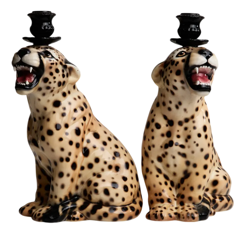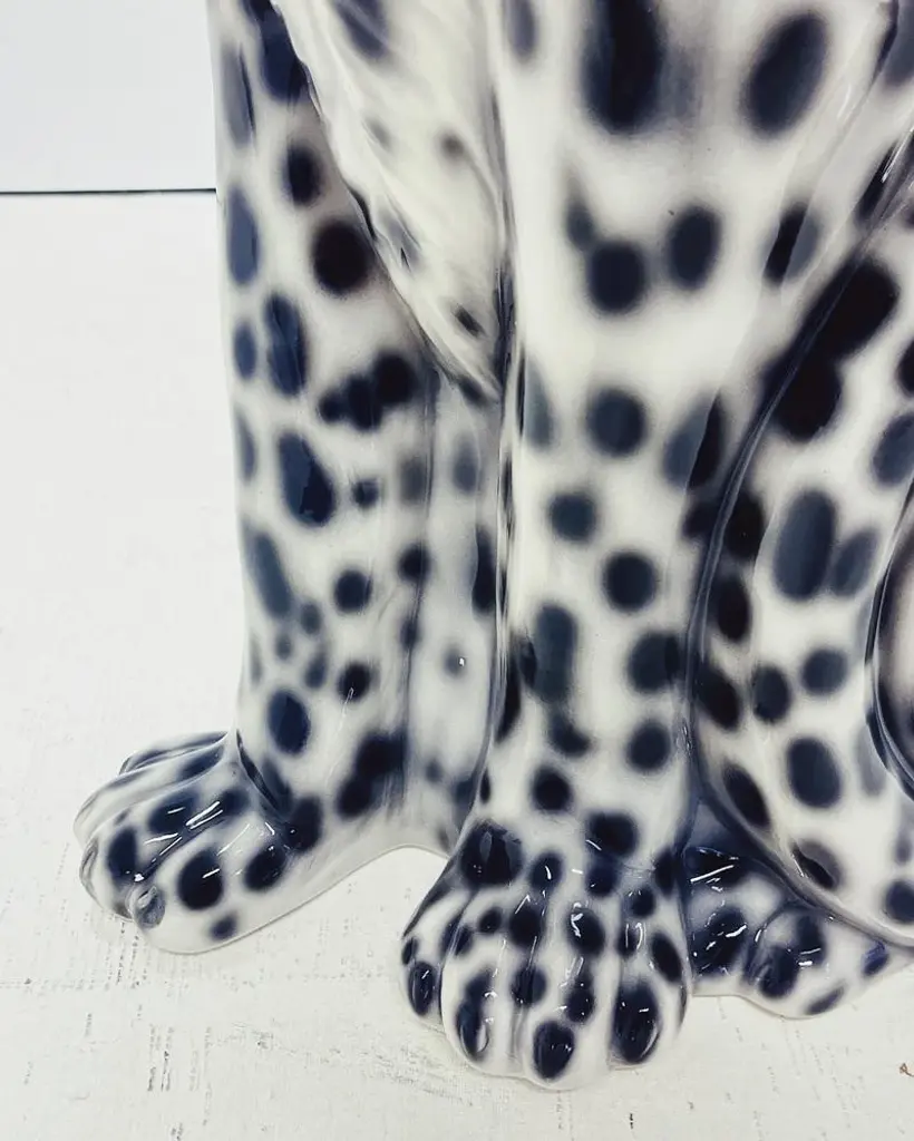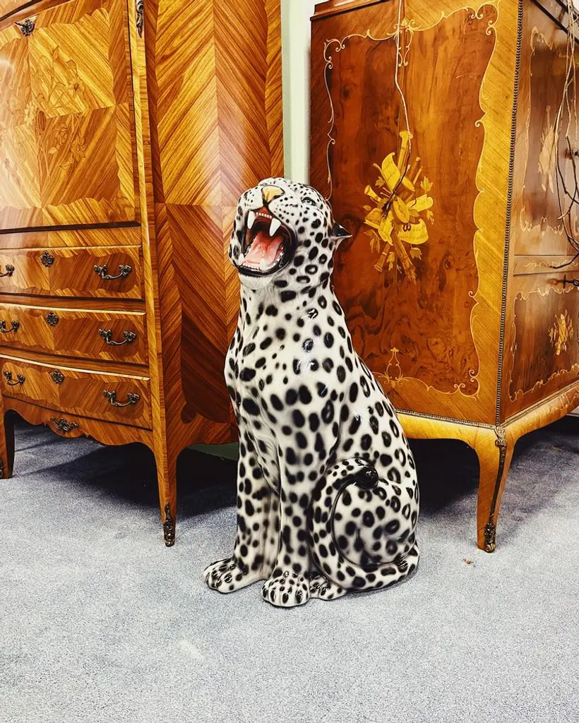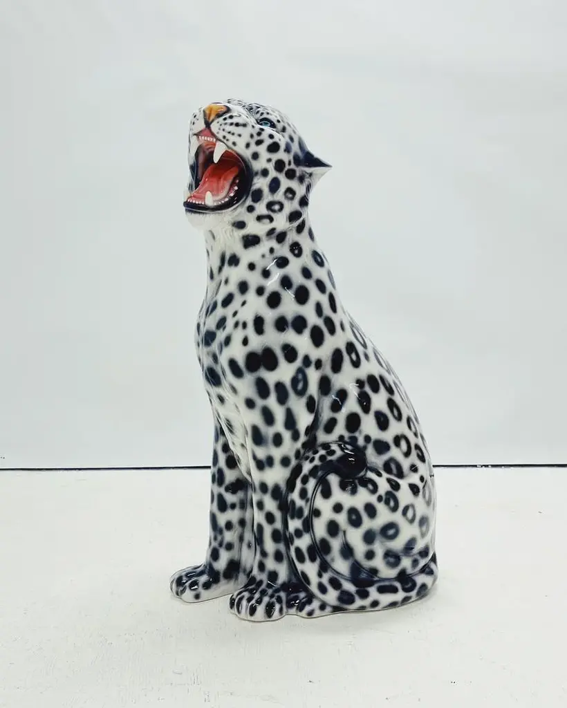 Unique handmade statue of a snow leopard. This Hollywood Regency statue, made of hand-painted ceramic and made in Italy, will undoubtedly add a stunning and cool look to your interior! All statues come directly from a family business in Northern Italy that has specialized in high-quality ceramic statues since 1985. Everything is made by hand, making each statue unique. Dimensions Height: 90cm Width: 25cm Depth: 50cm Stamped by Maker