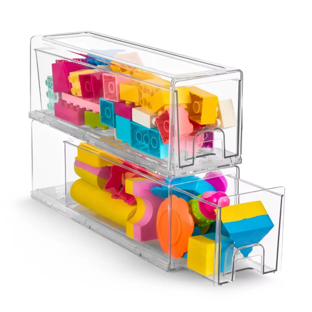 Transform your child's play space into a haven of organization and fun with this 2-pack set of clear acrylic storage bins, designed specifically for taming toy clutter. Crafted from high-quality, durable acrylic plastic, these bins boast superior clarity, allowing your child to easily identify their favorite toys at a glance. No more rummaging through overflowing toy boxes or frustrating searches for specific playthings – the transparent design keeps everything visible and accessible, fostering independent play and encouraging children to clean up after themselves. The built-in handles on these bins make them child-friendly and convenient for little hands to carry around. Whether your child is transporting their toys from the playroom to another part of the house or simply putting them away after playtime, the handles ensure easy mobility and promote independence. Additionally, the secure-fitting lids keep dust, dirt, and debris out, protecting your child's toys and maintaining a clean and hygienic play environment. These versatile bins are ideal for storing a wide variety of toys, from building blocks and dolls to stuffed animals, board games, and arts and crafts supplies. The generous size of the bins allows you to consolidate and organize various toys, keeping them neatly contained and readily accessible whenever playtime commences. This not only promotes organization and reduces clutter but also fosters creativity and imaginative play by allowing children to easily access and explore their different toys. Furthermore, the clear acrylic construction adds a touch of modern elegance to your play space. Unlike bulky and opaque toy chests, these transparent bins showcase your child's favorite toys, creating an aesthetically pleasing and visually stimulating environment. This not only enhances the overall look and feel of your play space but also encourages children to appreciate their toys and keep them organized. Invest in these premium acrylic storage bins and watch your child's play space transform into a wonderland of organization, accessibility, and imaginative fun.
