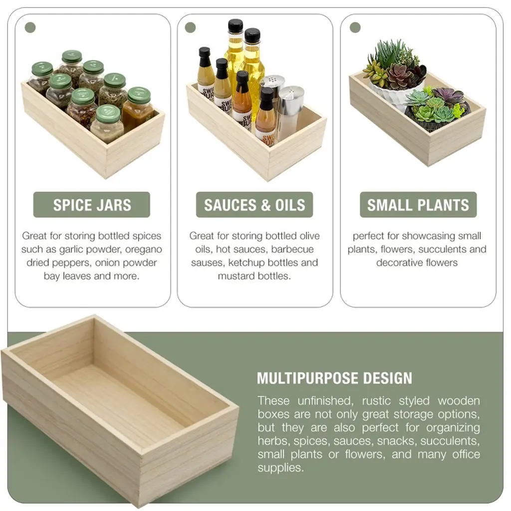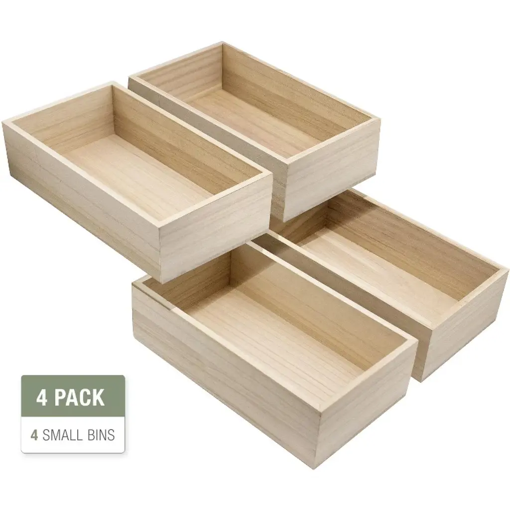 If you’re looking for modern organization, then naturally you’ve come to the right place! Contain all your clutter with this Wooden Storage Set by Sorbus. With a natural clean look, this set of four boxes stow a variety of small household items that easily get lost. Use on countertops and desks or slide inside drawers to keep your silverware, small gadgets, tools, and cosmetics tidy. These organizer boxes blend well with most décor and a simple solution for style and order. Versatile and multi-purpose. Wooden bins can be used in several places in your home, including the office or closet to store crafts, desktop supplies, and small decor pieces. In the kitchen, turn your junk drawer into a tidy space for small condiments, utensils, packets, and more. For more versatility, fill each box tray with small toys in the playroom or display in the bathroom for extra makeup and toiletries. About the design. The natural finish feels fresh and modern. Coordinates with a variety of home décor. Made of sustainably sourced Paulownia wood. Wipe clean with a damp cloth, dry duster, or microfiber cloth. DO NOT place in dishwasher or submerge in water.