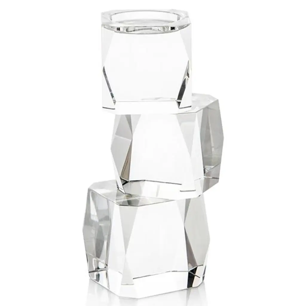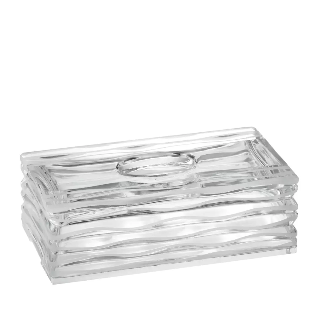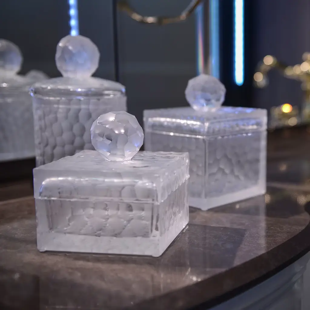 Either alone to complement a powder room and bedroom vanity, or combined with the other items in the Spa Afrika collection, this set will imbue any elegant home with timeless sophistication. Crafted of transparent glass, both boxes have a square base and are topped with lids. The external surface of the pieces and the spherical top handles boast a refined multi-faceted texture. One box is designed to store cotton balls (H 16.5 cm), the other is for q-tips (H 13cm).