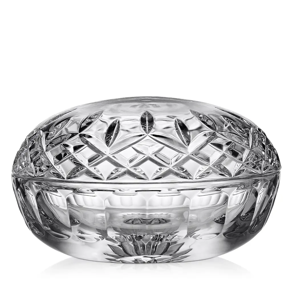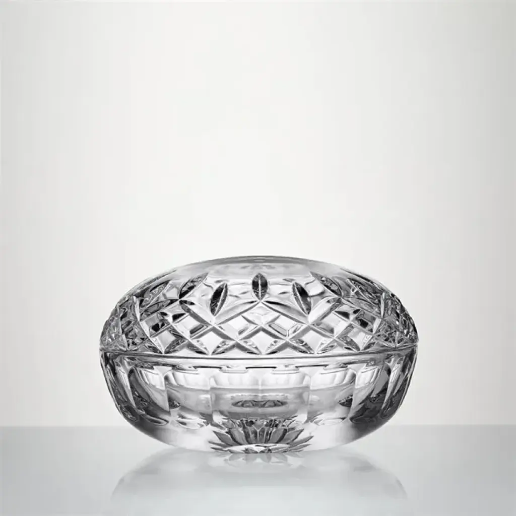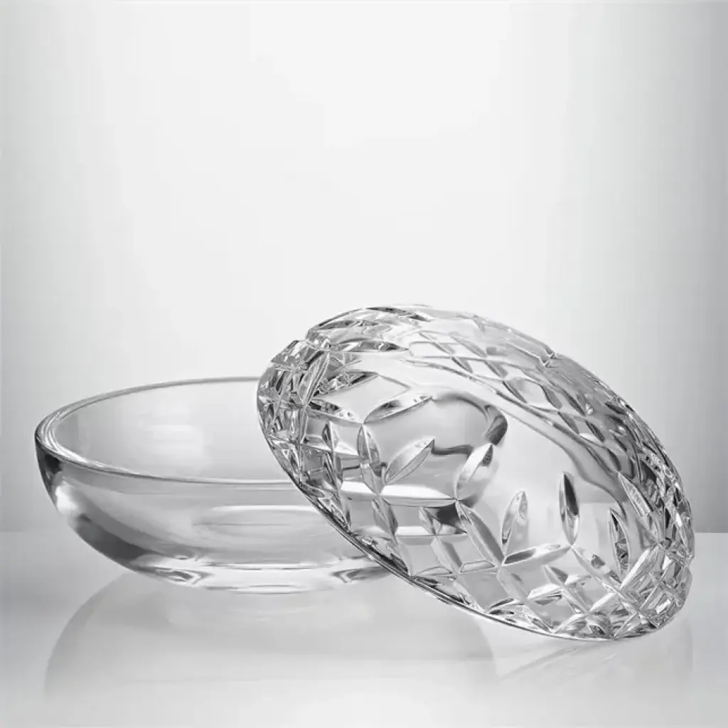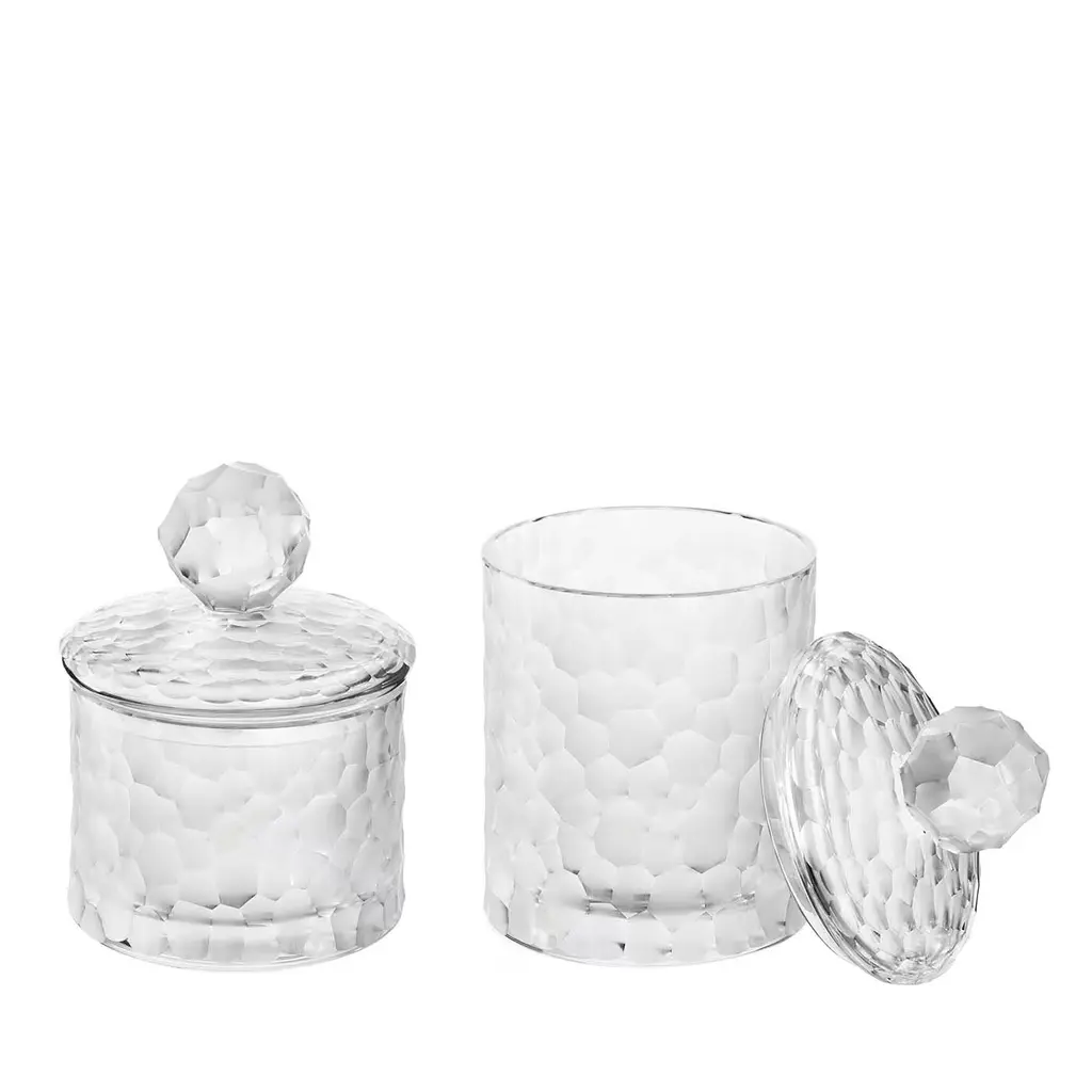 This stunning addition to any bathroom will make a statement in an elegant home, where the striking texture adorning the transparent glass of these two boxes will reflect the surrounding light. These two cylindrical pieces are topped with lids equipped with spherical handles. One is conceived as a baby powder receptacle (Ø 11.5 cm H 15 cm), the other is a bath salts container (Ø 11.5 cm H 20 cm). They can be sold separately.