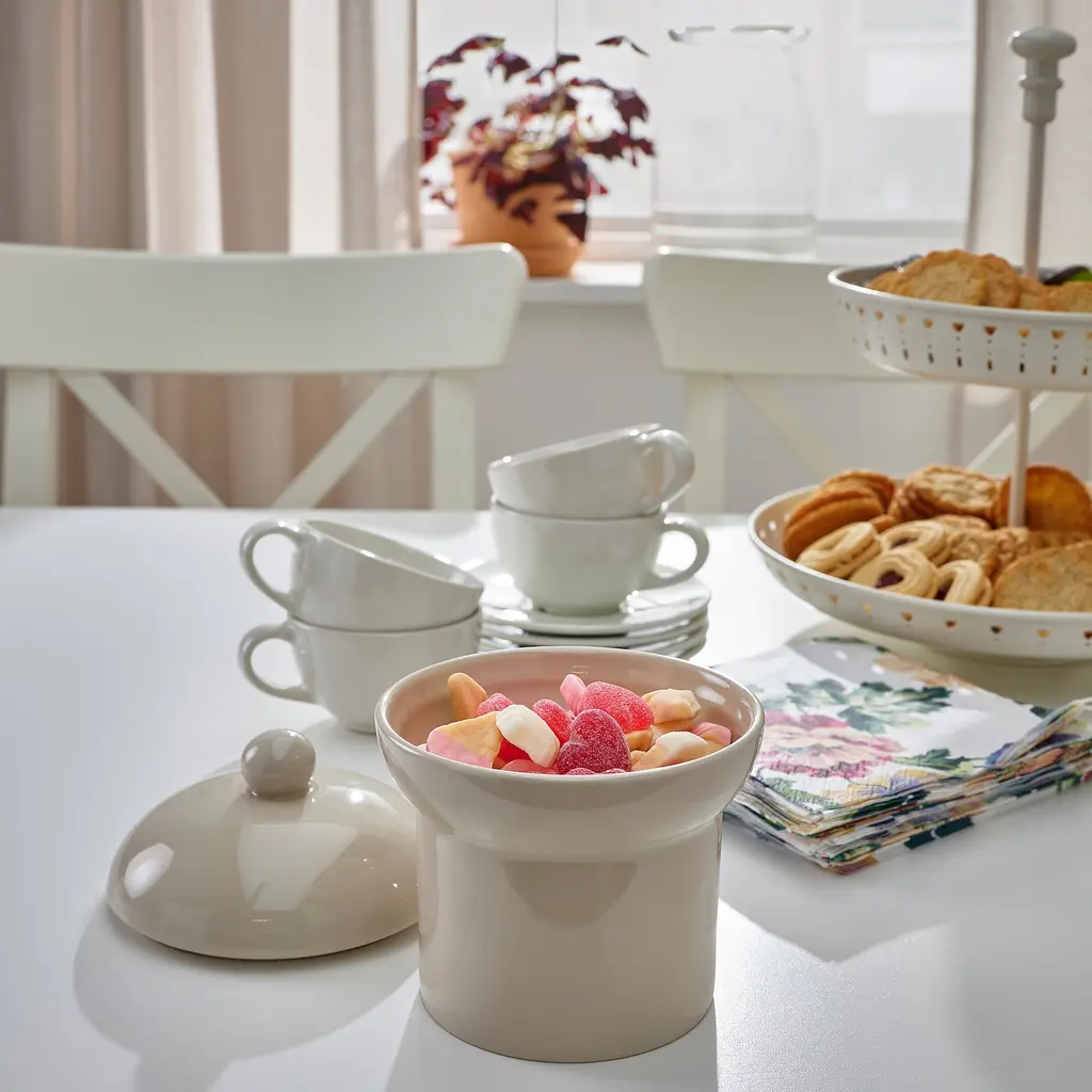 SPINNARHAJ Jar with lid - off-white 5 ". Perfect for storing coffee, tea, sugar, cookies and other treats you long for when you take a break. This jar is simple yet the beautiful design in off-white transparent glaze makes it easy to match with ceramics that you already have at home.