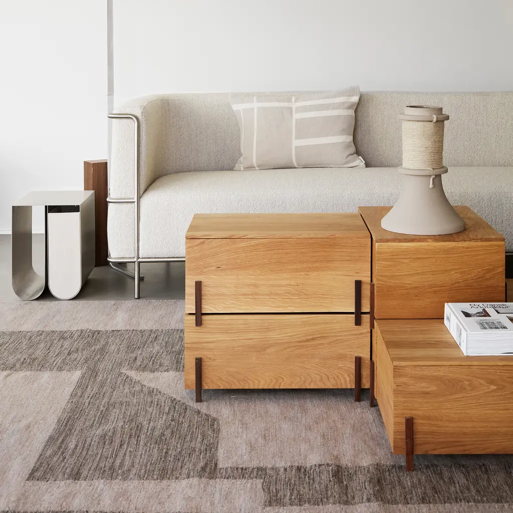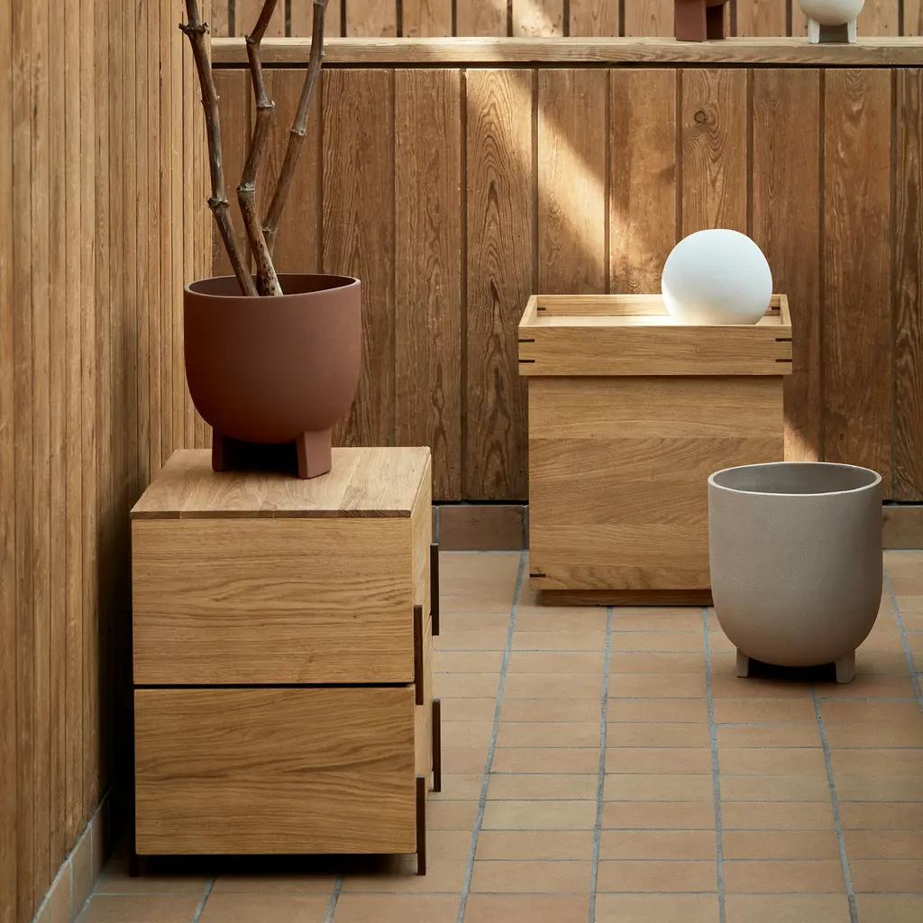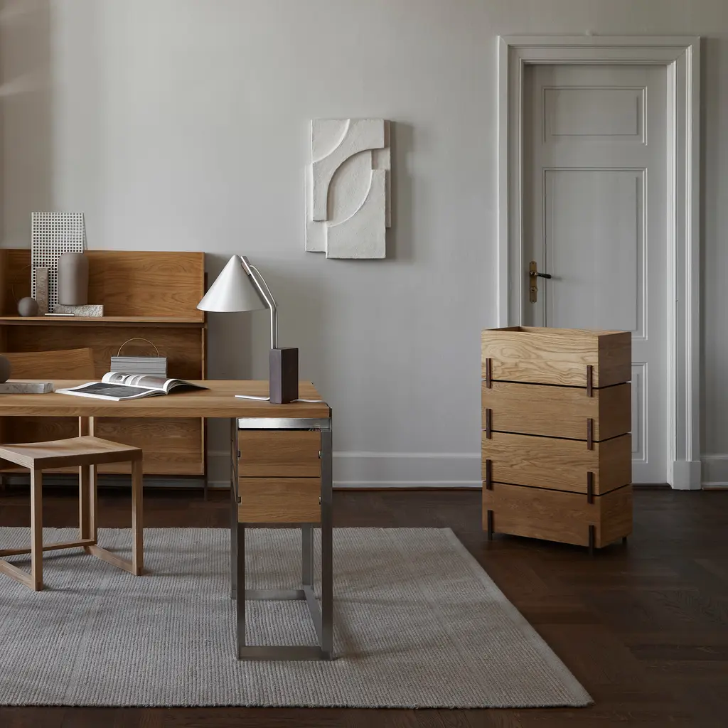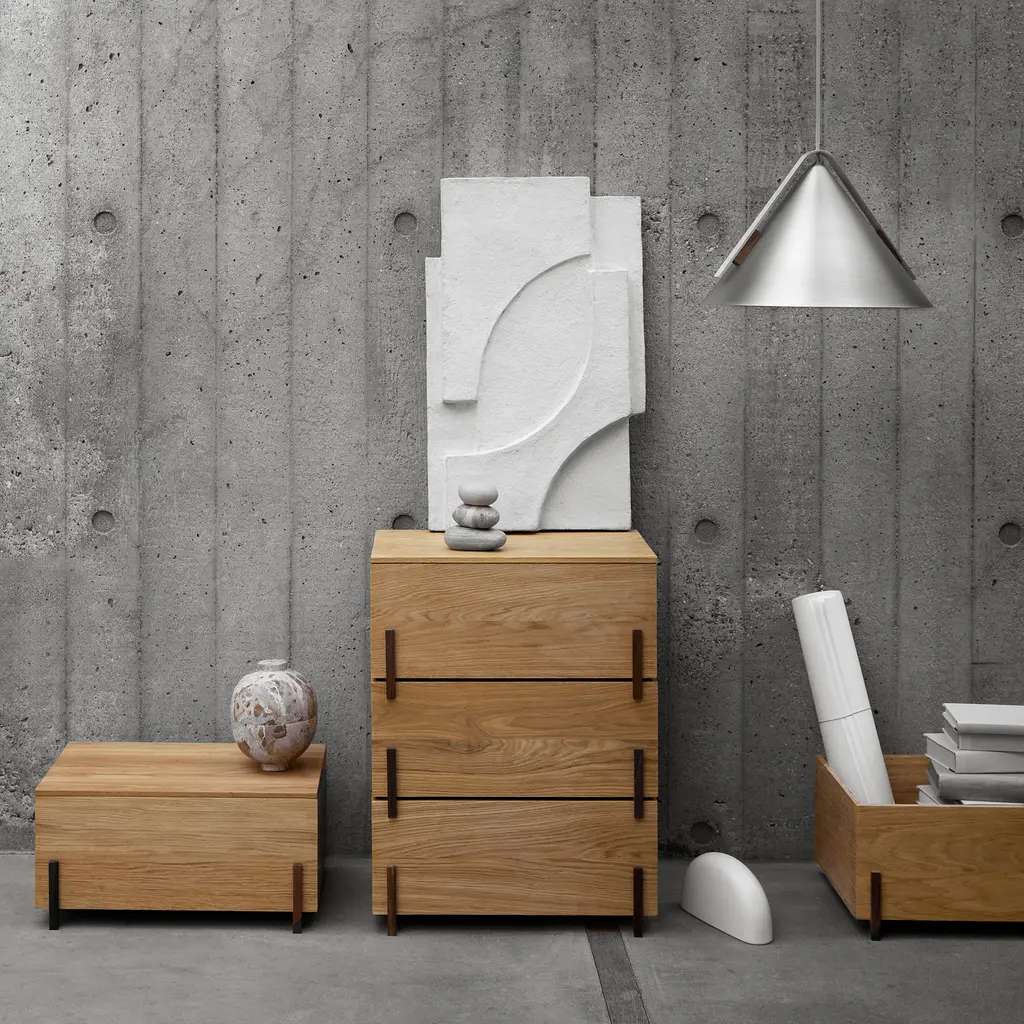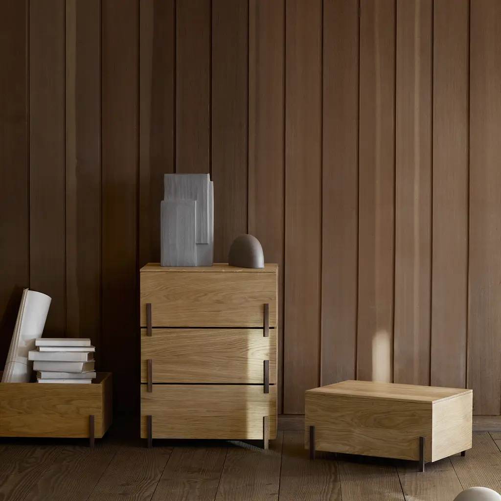 Keep your home organized and stylish at the same time with the Kristina Dam Studio Stack boxes. Elegant and practical, these beautifully designed storage boxes add a decorative accent to any space thanks to the combination of clean lines and contrasting wood elements. Made from solid oak with an oiled finish, every box features walnut legs that double as connecting points between the drawers. This set comes with three design storage boxes that you can use separately or stacked together in a tower. As versatile as they are practical, these stack boxes can easily hold bedding or clothing in a bedroom; toys and art supplies in a child’s room; or magazines, books, blankets and other accessories in a living room. The Kristina Dam Studio Stack Storage Box set works well on its own or alongside the wall-mounted and floor shelves from the same collection.