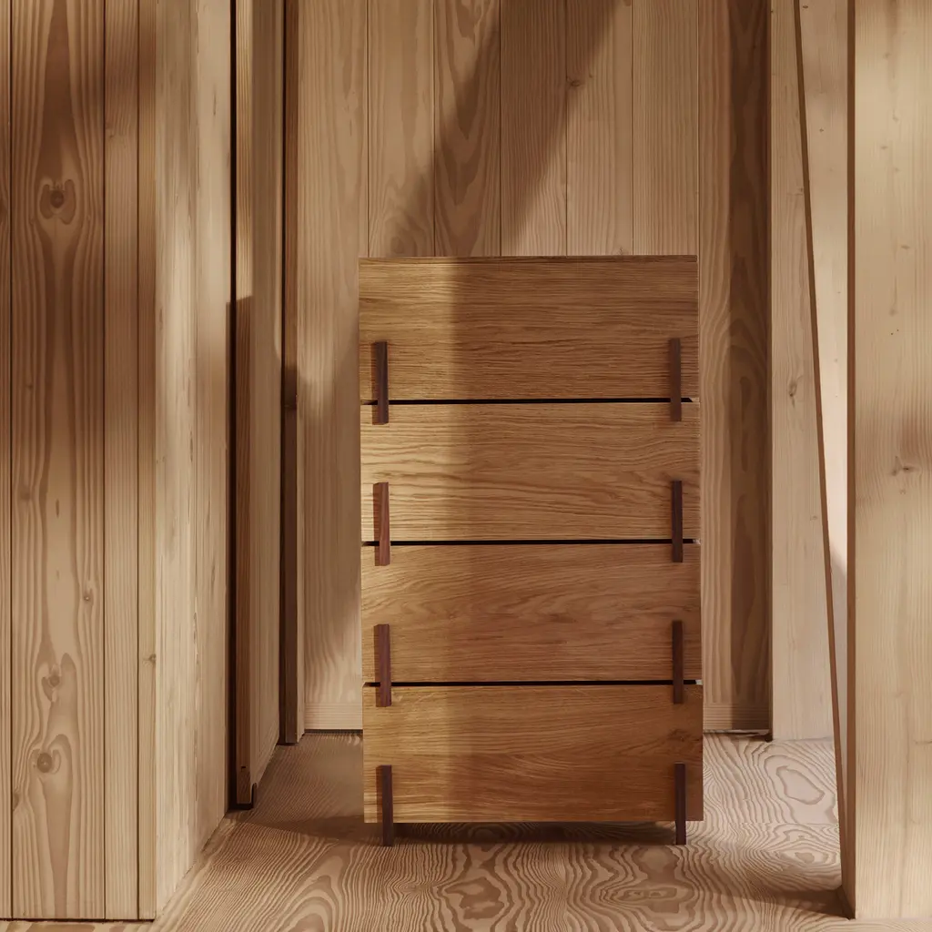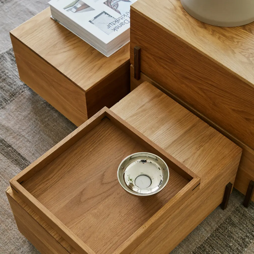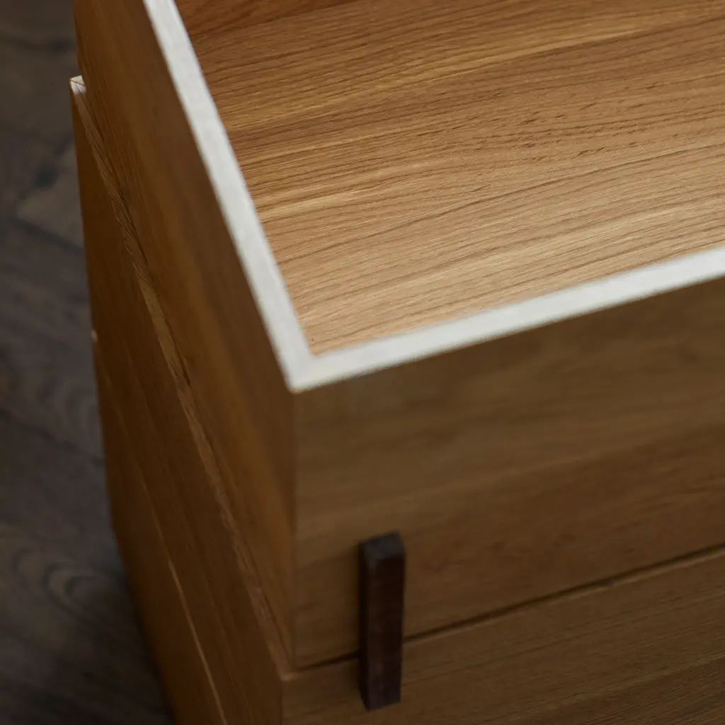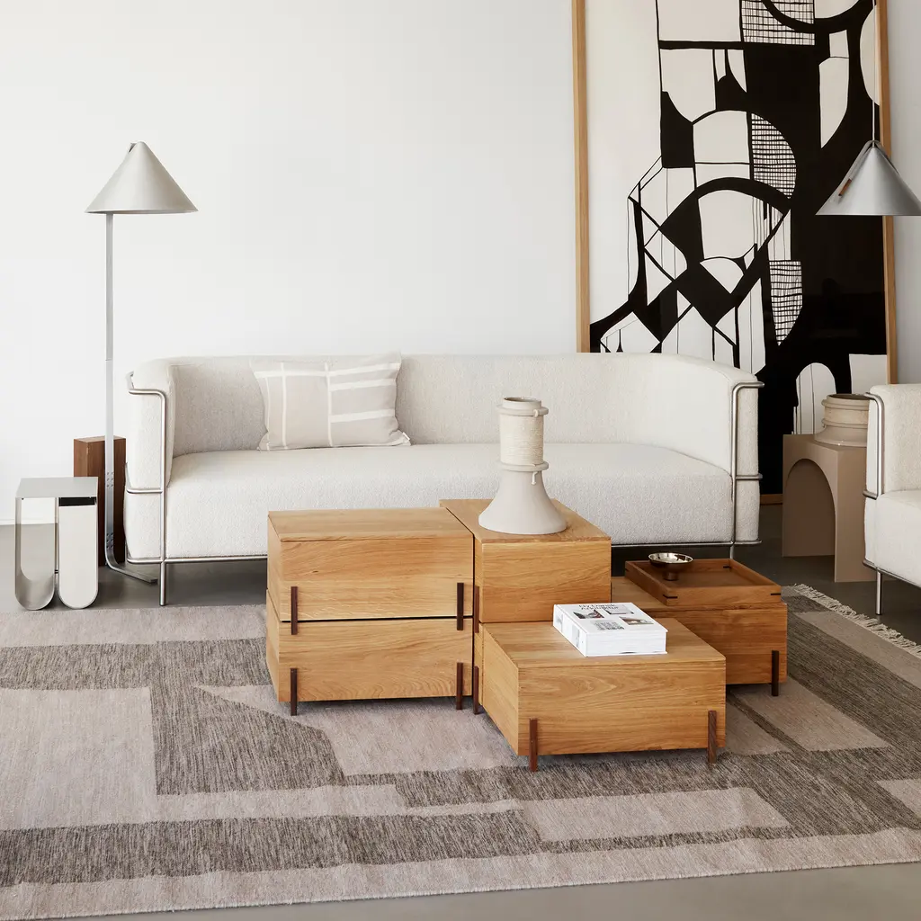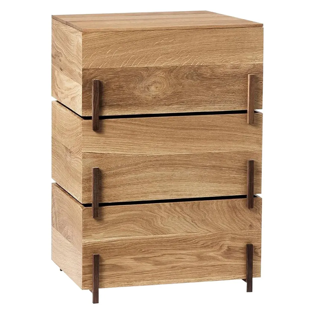 Keep your home organized and stylish at the same time with the Kristina Dam Studio Stack boxes. Elegant and practical, these beautifully designed storage boxes add a decorative accent to any space thanks to the combination of clean lines and contrasting wood elements. Made from solid oak with an oiled finish, every box features walnut legs that double as connecting points between the drawers. This set comes with three design storage boxes that you can use separately or stacked together in a tower. As versatile as they are practical, these stack boxes can easily hold bedding or clothing in a bedroom; toys and art supplies in a child’s room; or magazines, books, blankets and other accessories in a living room. The Kristina Dam Studio Stack Storage Box set works well on its own or alongside the wall-mounted and floor shelves from the same collection.