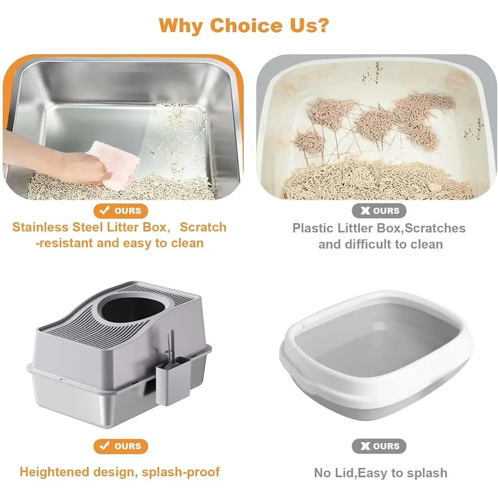Effective Odor Control: The sealed design keeps litter odors trapped inside, ensuring your living space remains fresh and inviting for both you and your pets.The enclosed design provides a private and secure space for cats.Durability& Scratch-Resistant: That stainless steel litter box built with a good stainless steel bottom tray, this litter box resists odors, allows easy water cleaning, and offers superior corrosion and scratch resistance. Unlike traditional plastic litter boxes, it has a longer lifespan, making it suitable for long-term use by cats.Unique Radian Designed for User Convenience: This litter box's low-entry radian design, allows easy access for kittens and older cats, making it pet-friendly and suitable for cats of all ages.this covered litter box offers 2 size high side options to meet their needs. XL 23.6 x 15.7 x 13.58 inch for all-size cats,, and XXL 23.6 x 15.7 x 15.55 inch for multi-cat homes.Top Entry Effective for spillage: The top entry of the cat litter pan means more privacy for your cat, less litter spillage, and any spraying remains contained within the tall walls of the kitty litter box. Enclosed removable metal litter box top entry width: 8.66 inch.Stability and Safe Design: Equipped with non-slip pads, the litter box stays in place, even when your cat digs enthusiastically, helping to prevent spills and messes outside the box. The smooth, rounded edges of the litter box ensure safety for your cat and ease of cleaning for you, making it a practical choice for any cat owner.
