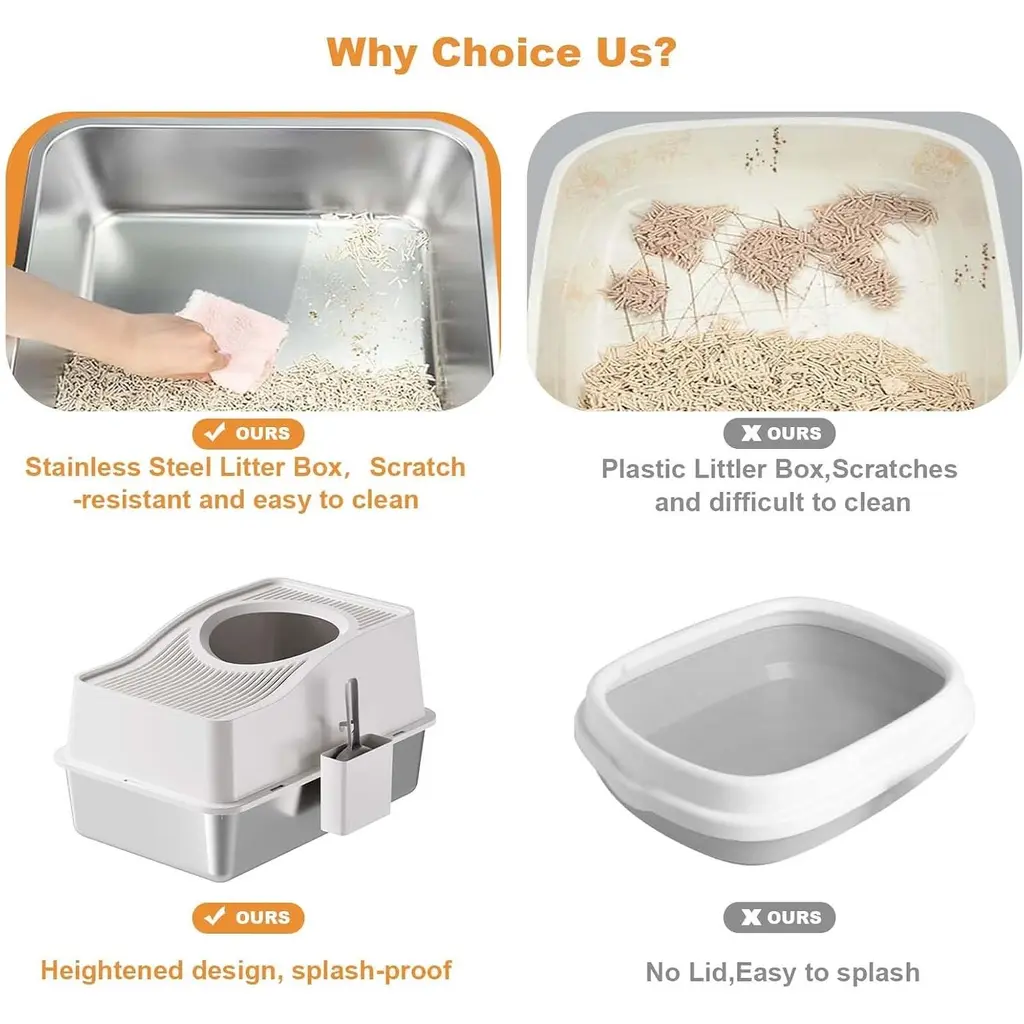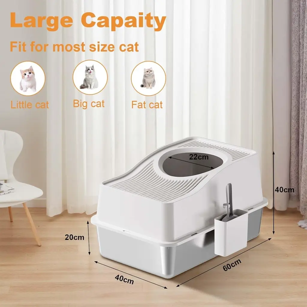 Effective Odor Control: The sealed design keeps litter odors trapped inside, ensuring your living space remains fresh and inviting for both you and your pets.The enclosed design provides a private and secure space for cats.Durability& Scratch-Resistant: That stainless steel litter box built with a good stainless steel bottom tray, this litter box resists odors, allows easy water cleaning, and offers superior corrosion and scratch resistance. Unlike traditional plastic litter boxes, it has a longer lifespan, making it suitable for long-term use by cats.Unique Radian Designed for User Convenience: This litter box's low-entry radian design, allows easy access for kittens and older cats, making it pet-friendly and suitable for cats of all ages.this covered litter box offers 2 size high side options to meet their needs. XL 23.6 x 15.7 x 13.58 inch for all-size cats,, and XXL 23.6 x 15.7 x 15.55 inch for multi-cat homes.Top Entry Effective for spillage: The top entry of the cat litter pan means more privacy for your cat, less litter spillage, and any spraying remains contained within the tall walls of the kitty litter box. Enclosed removable metal litter box top entry width: 8.66 inch.Stability and Safe Design: Equipped with non-slip pads, the litter box stays in place, even when your cat digs enthusiastically, helping to prevent spills and messes outside the box. The smooth, rounded edges of the litter box ensure safety for your cat and ease of cleaning for you, making it a practical choice for any cat owner.