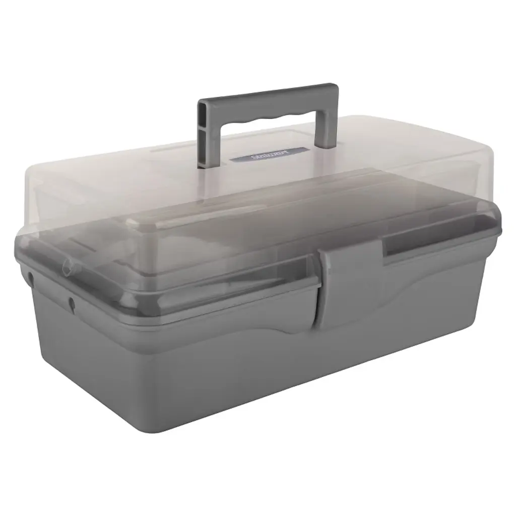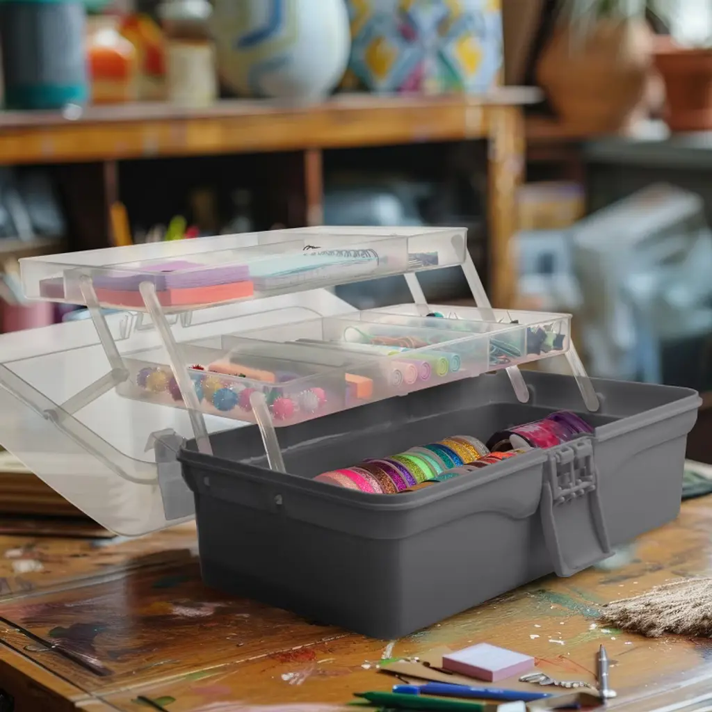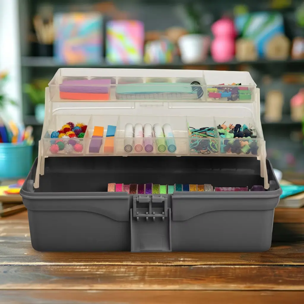 Tidily organize everything from art supplies to cosmetics or fishing tackle with the 3 Layer Plastic Tool Box with Handle by Stalwart. This multipurpose pink organizer features a clear lid that provides visibility to the contents and 2 tiers of trays that open widely for easy access, so you can always find and grab just what you need. The lid closes securely thanks to the sturdy latch and a built-in top handle allows you to take this portable craft organizer box on the go. Whether you use this plastic tool box as an art case, for cosmetics and beauty supplies, as a sewing box for sewing supplies, or any other hobby items, you’re sure to appreciate the sturdy construction and lightweight portability.