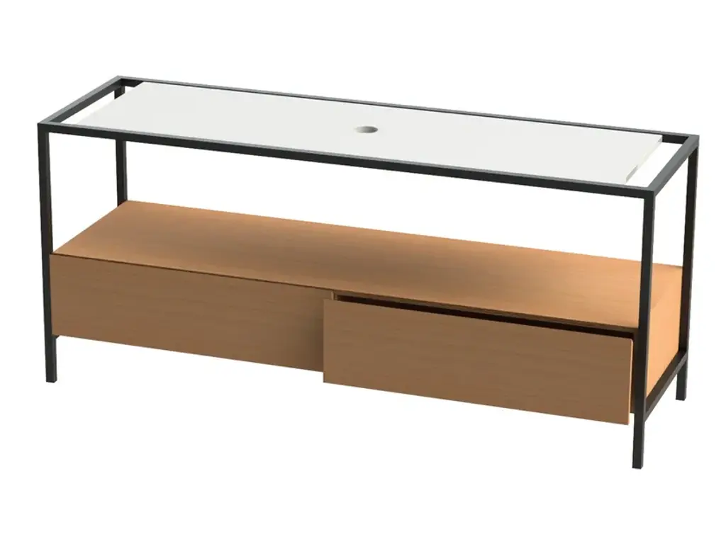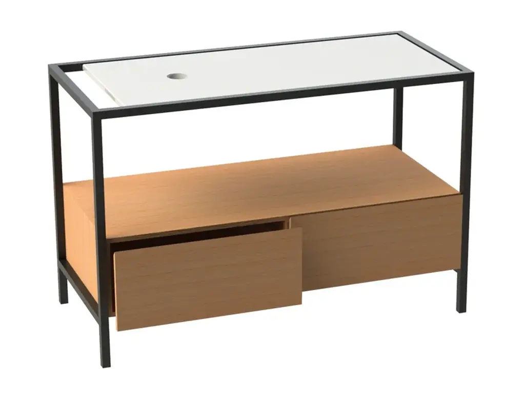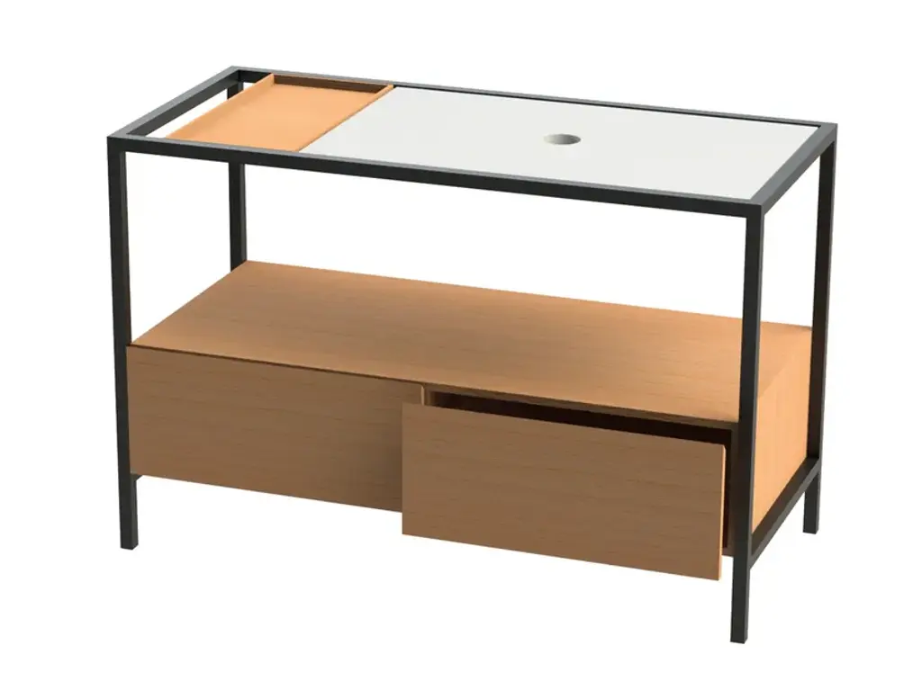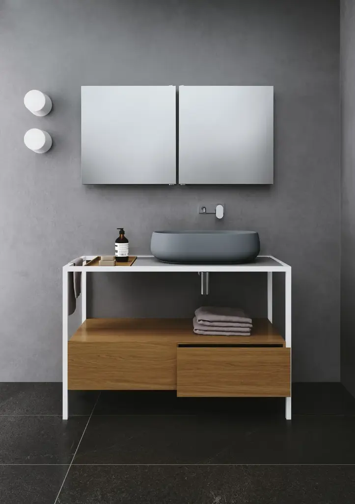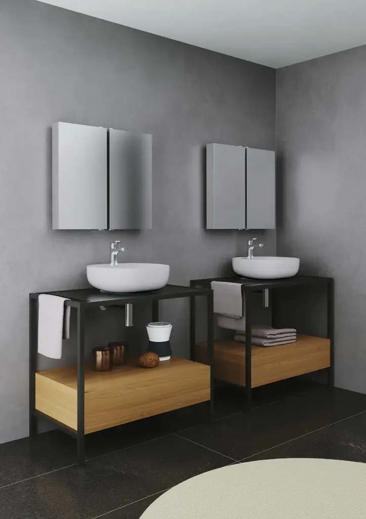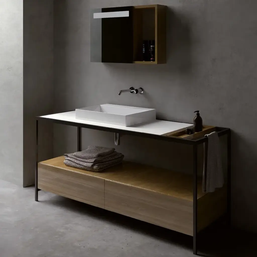 Stand is a floor-standing single vanity unit with floor painted metal structure provided with ceramic custom made shelves and central hole. Oak furniture with one drawers.Shelves, drawers, towel holder bars with industrial inspiration are the basis for the furnishing system designed by StorageAssociati that is focused on the concepts of flexibility and informal style. A personal and contemporary interpretation of bathroom furniture expressed in various dimensional variations, mixing wood, iron and ceramic.The wall-hung or floor-mounted Hang&Stand system has a metal structure that can be combined with the Misura ceramic shelf, a versatile top for washbasins and accessories, fully customisable.The wall-hung Hang structure consists of a towel holder bar and organiser shelf as well as a top. Stand reinterprets the traditional wood bathroom unit with practical storage containers.