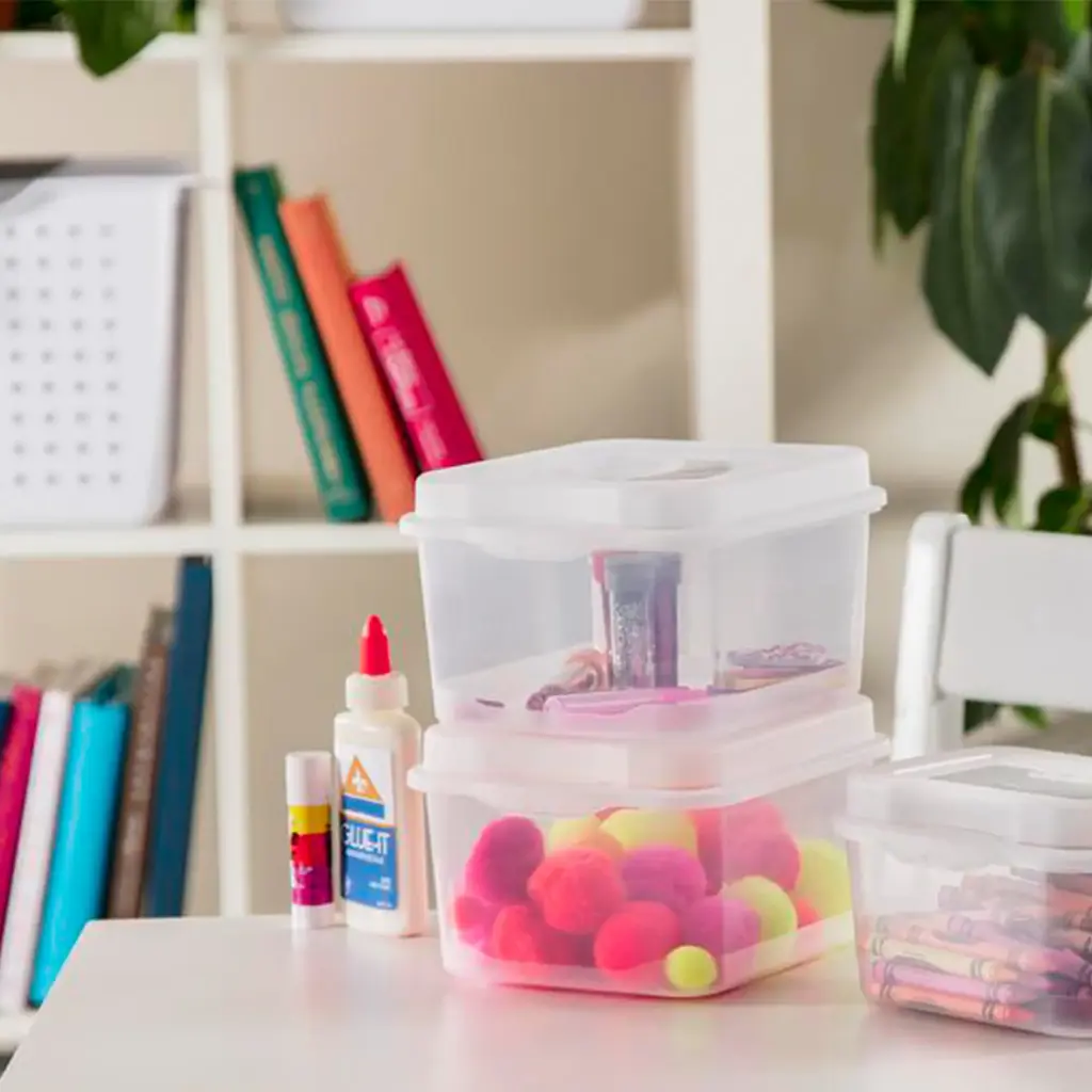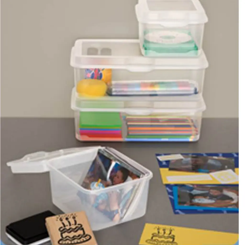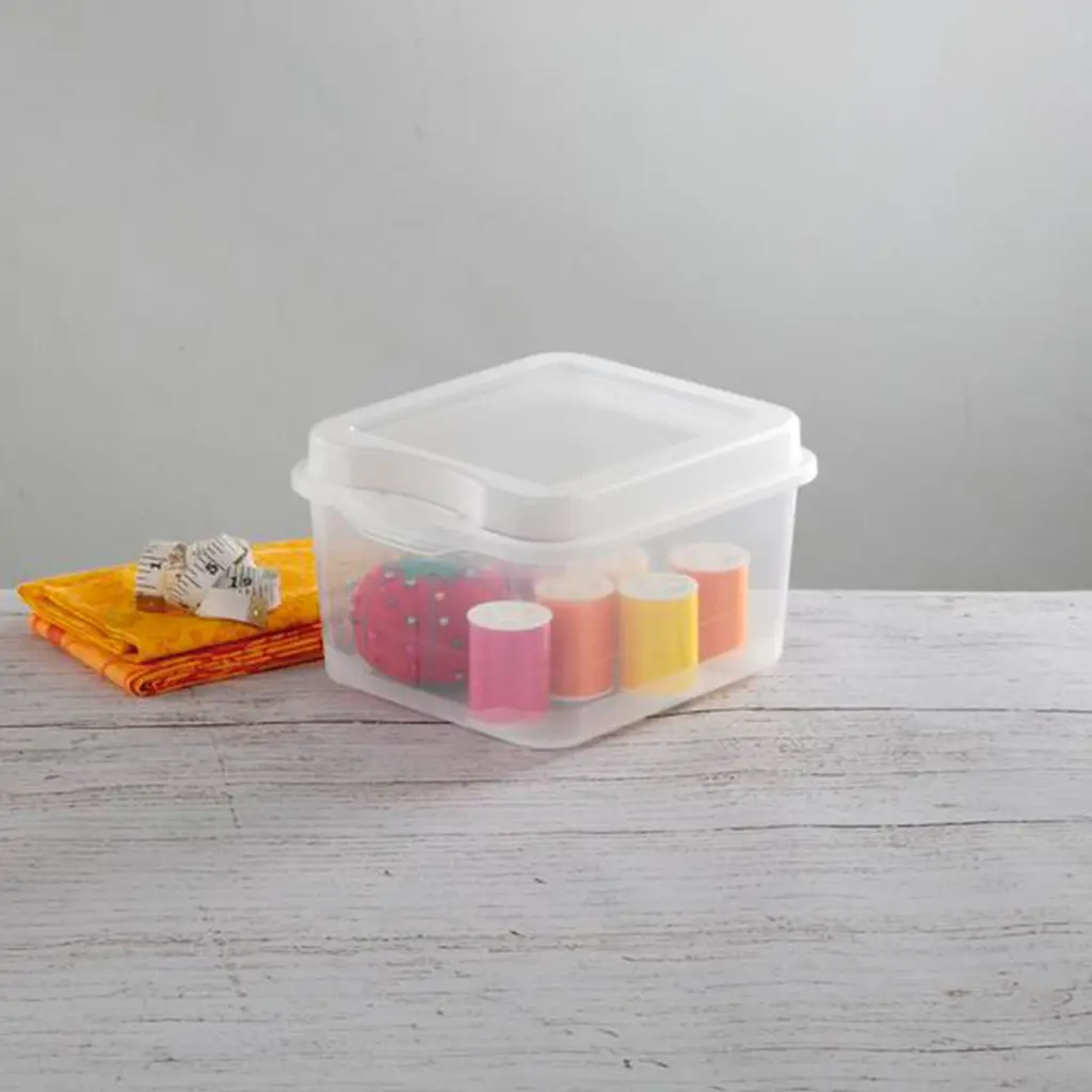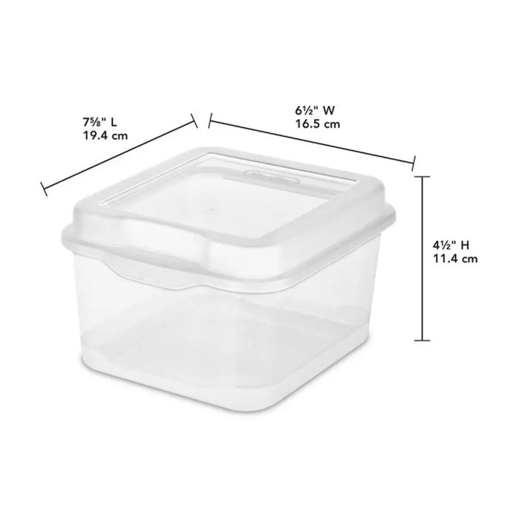 Sterilite FlipTop boxes are a practical solution for reducing clutter and keeping smaller items contained. Enhanced hinge lid ensures cover will never be misplaced and allows it to remain tightly closed during transport. Modular in design, FlipTop Storage boxes securely stack both individually and are interchangeable with the Large FlipTop Storage Box. Ideal for organizing accessories, crafts, 4"x6" photos, CD's and more in and around the home. FlipTops Storage Boxes are a modular system of containers featuring hinged lids and secure latches. Attached lids allow for easy access to contents and will not get misplaced when opened (comes in a single flip top box.) New Sterilite 1803 Flip Top box Single Modular & Stackable Hinged latch lid secures contents Clear base & lid for quick identification of contents Works interchangeably with the Large FlipTop Storage Box Flip Tops are Modular containers featuring indexed hinged lids Secure Snap Lock Latches Ideal for storage of office supplies, crafts and more **Ideal Uses** FlipTop storage boxes are ideal for organizing crafts, 4" x 6" photos, CDs, and more keeping smaller items neatly contained. Looking for a solution for keeping computer discs or music CDs neatly organized? Then FlipTop storage boxes are just what you need. CDs can be neatly contained in these storage boxes and stacked on a shelf or desk reducing clutter in an office, school or around the home. Product Dimensions: 7 5/8" L x 6 1/2" W x 4 1/2" H Product Condition: Brand New Product Weight: .3 Pounds Part Number: 18038612 Warranty: One year free of manufacturer warranty Quantity: 48