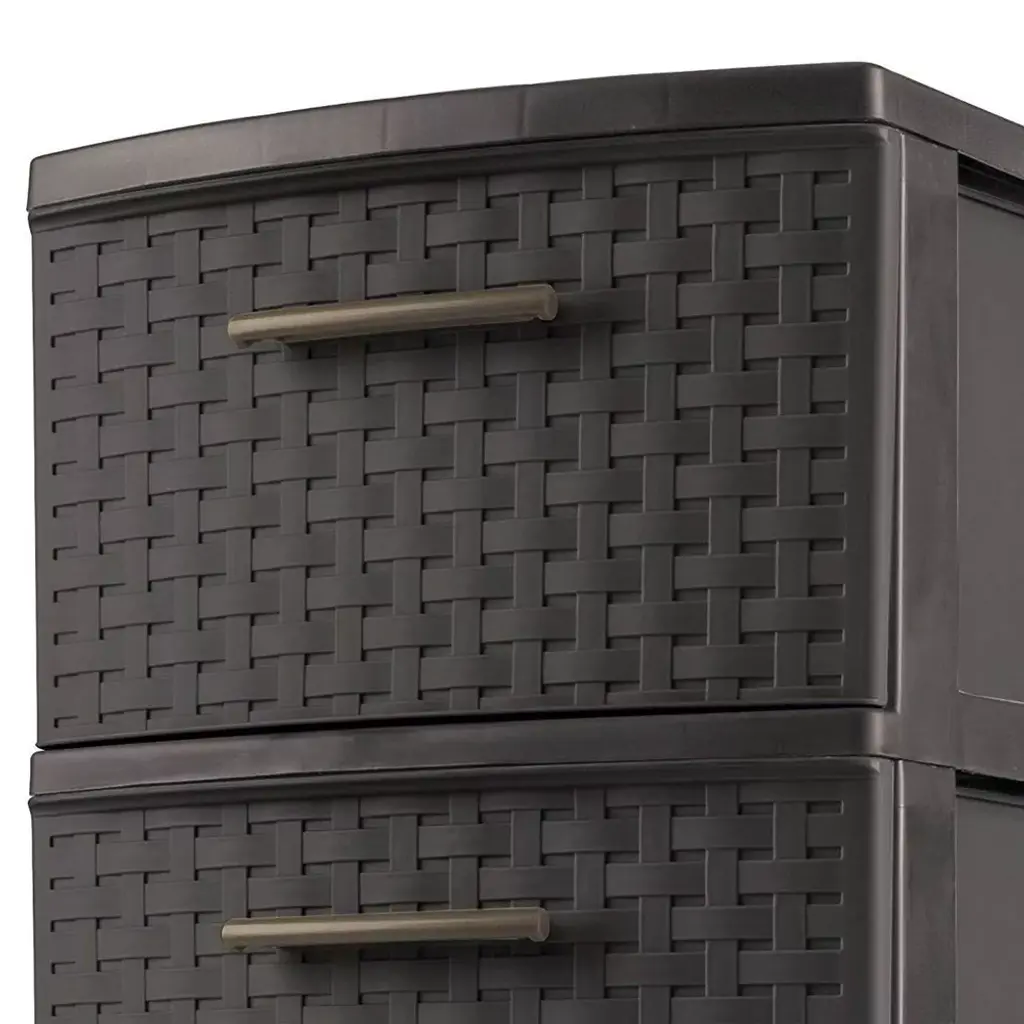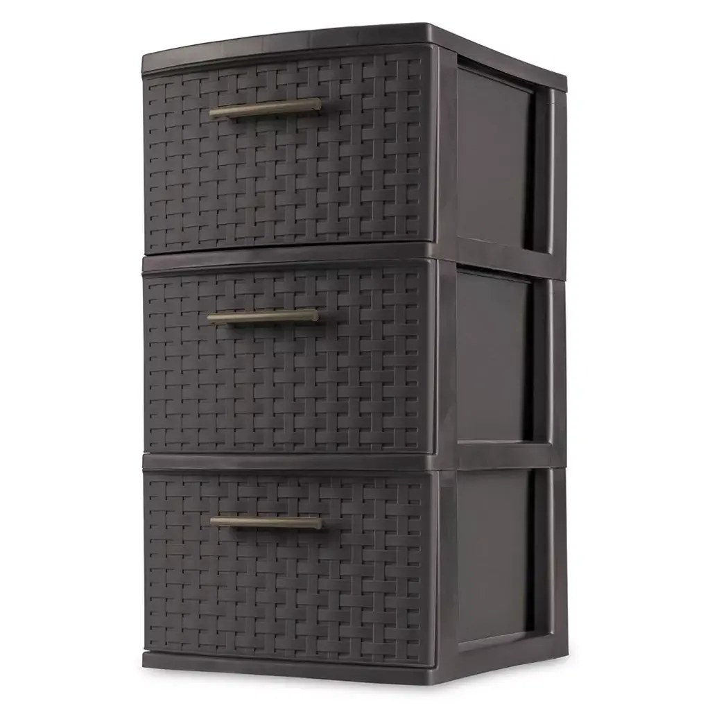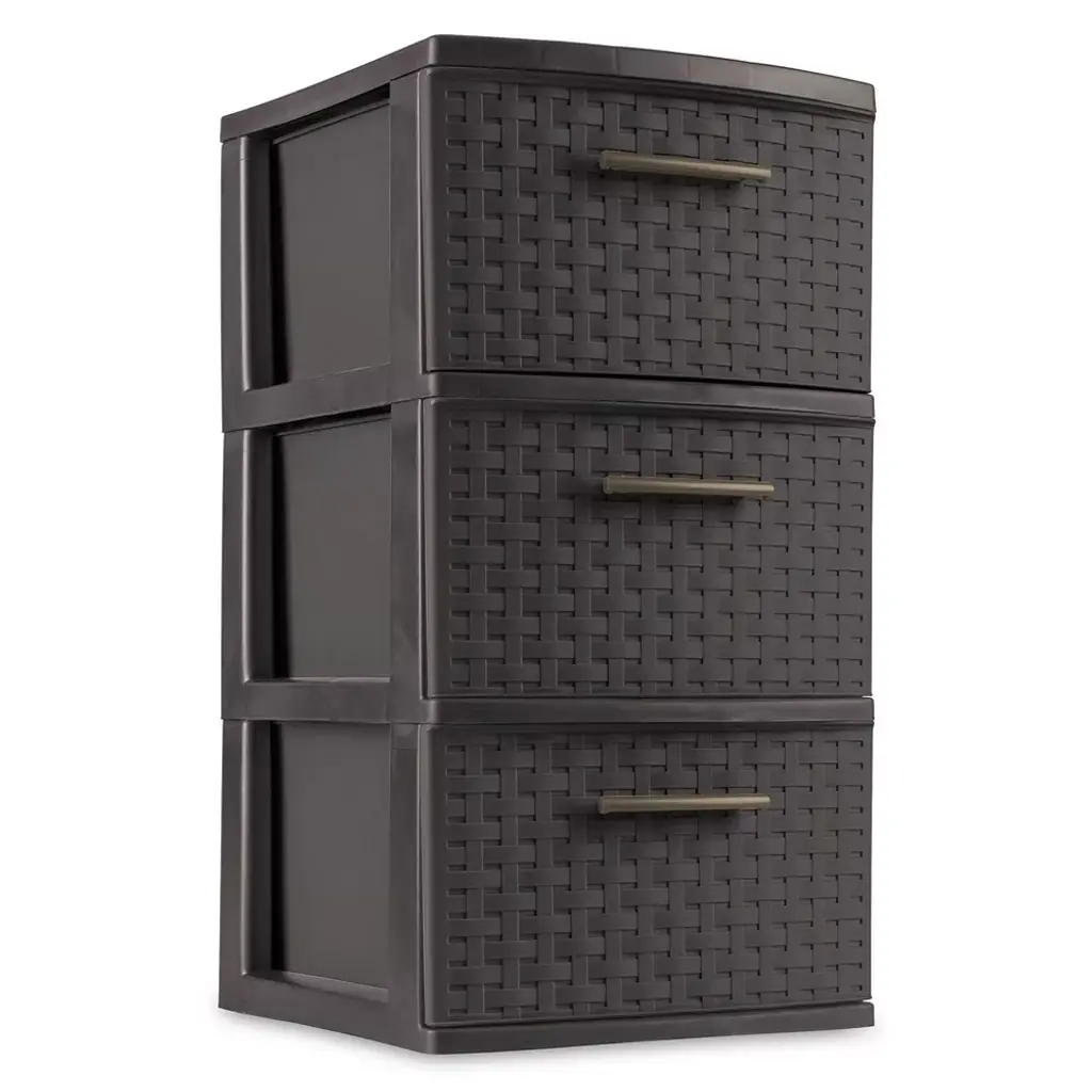 Attractive household storage container furniture around your home shouldn't have to cost a lot. The Sterilite 3 Drawer Weave Tower is both an efficient storage solution and easy on the eyes. This package includes 6 towers. The attractive wicker design and neutral espresso brown finish complement any home and naturally blends in with your other decor. The driftwood handles make it easy to open and shut the opaque drawers, which keep contents hidden discretely. They go great with any decor style and work well in living rooms, bedrooms, bathrooms, offices, or closets. At 15 inches wide by 24 inches tall, it's large enough to store books, DVDs, or random household items and doubles as a coffee table or bedside table. If you need more storage room in your space and don't want to lose your interior style, you'll love to have the Pack of 6 3 Drawer Weave Towers from Sterilite.