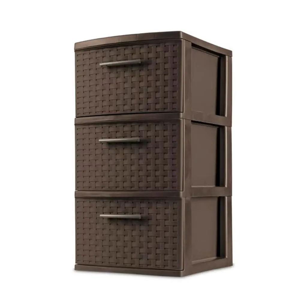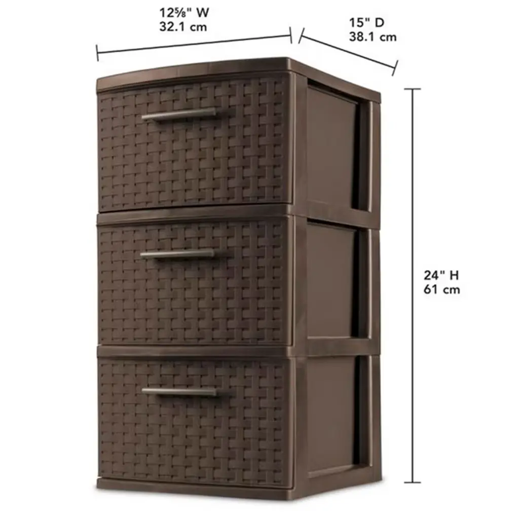 Attractive household storage container furniture around your home shouldn't have to cost a lot. The Sterilite 3 Drawer Weave Tower is both an efficient storage solution and easy on the eyes. This package includes 8 towers. The attractive wicker design and neutral espresso brown finish complement any home and naturally blends in with your other decor. The driftwood handles make it easy to open and shut the opaque drawers, which keep contents hidden discretely. They go great with any decor style and work well in living rooms, bedrooms, bathrooms, offices, or closets. At 15 inches wide by 24 inches tall, it's large enough to store books, DVDs, or random household items and doubles as a coffee table or bedside table. If you need more storage room in your space and don't want to lose your interior style, you'll love to have the Pack of 8 3 Drawer Weave Towers from Sterilite.