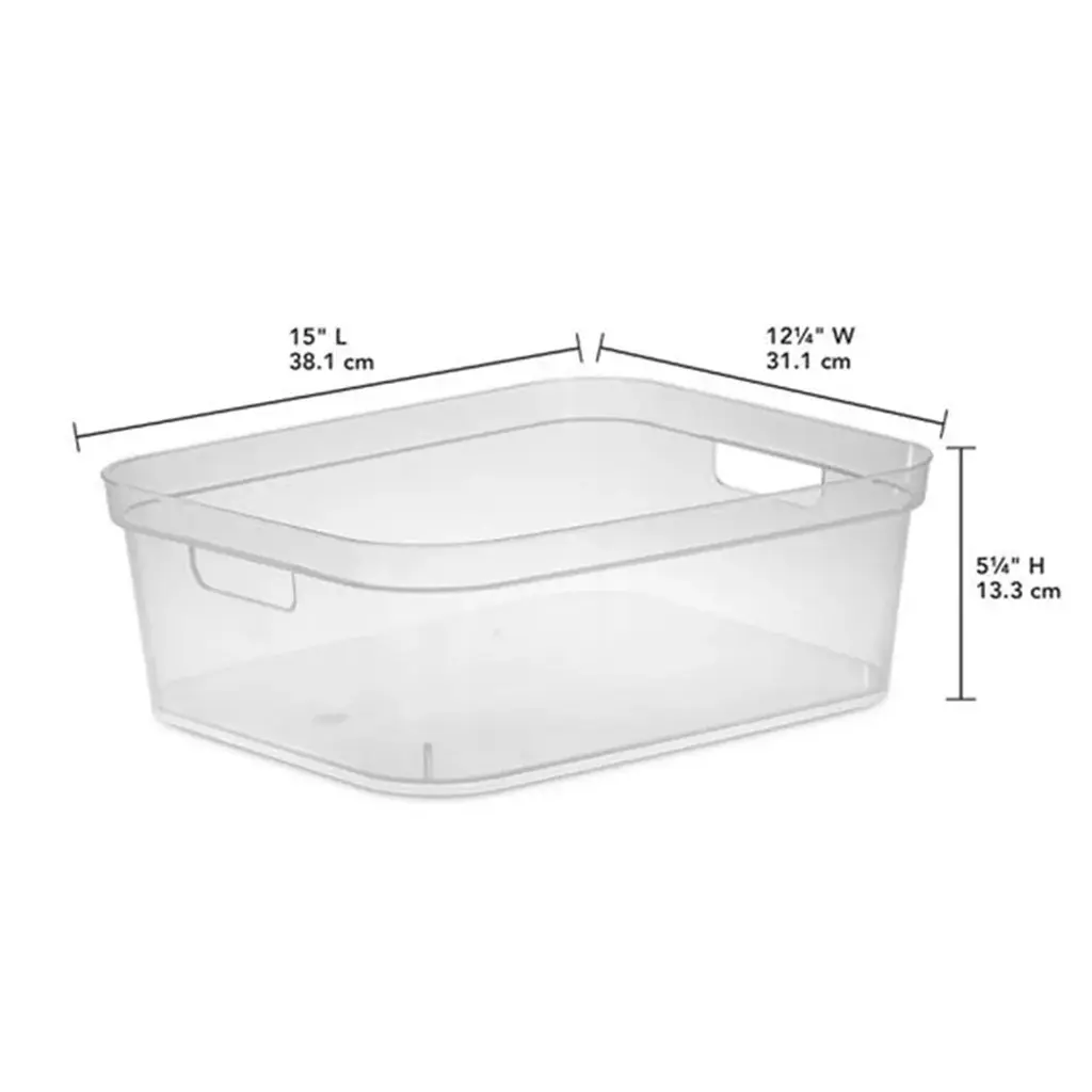 Create a perfect system of storage and organization in any room of your home with this 24-pack of the Sterilite 5.25 x 12.25 x 15 Inch Storage Bin with Carry-Through Handles. This clear, multipurpose storage bin provides the ideal space to store household items neatly. Designed to help you keep your frequently used belongings close at hand, from t-shirts and toddler clothes in the closet to yarn and thread bobbles in your craft room, you'll love the simple organization this bin provides. The open design gives you easy access to stored items, and the carry-through handles make for effortless and comfortable transport, making this bin ideal for everyday use. This modern design works well with any existing home decor without the need for color matching or keeping unattractive bins out of sight. The polished sides and textured bottom are a breeze to clean, making maintenance completely hassle-free. Whether used in the bathroom, dorm room, office, or classroom, you'll be able to access what you use most, effortlessly. Take a deep breath and enjoy the peace of ultimate organization with this 24-pack of the Clear Storage Bin with Carry Through Handles from Sterilite.