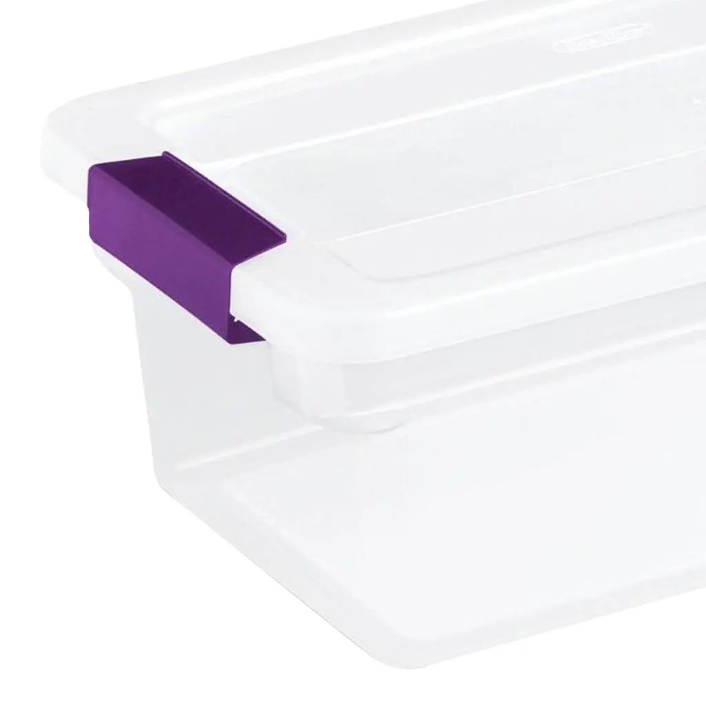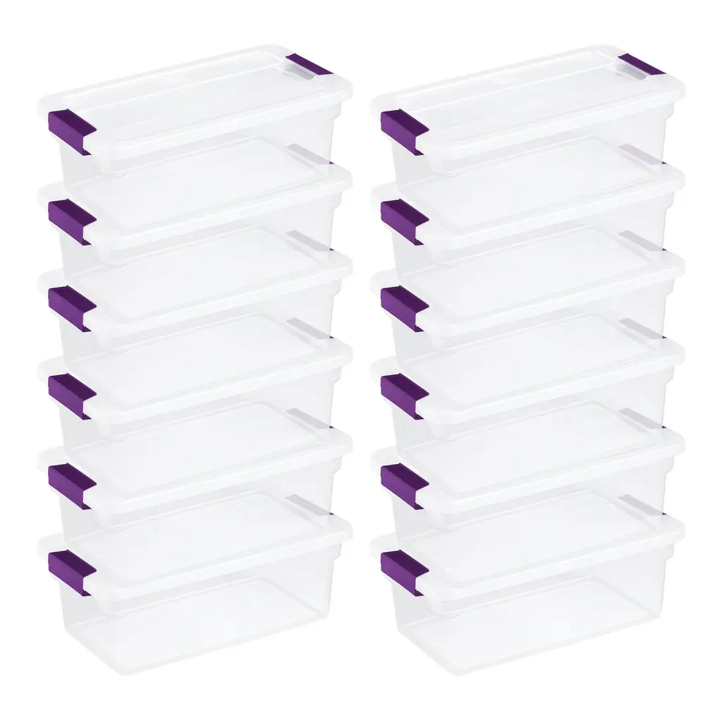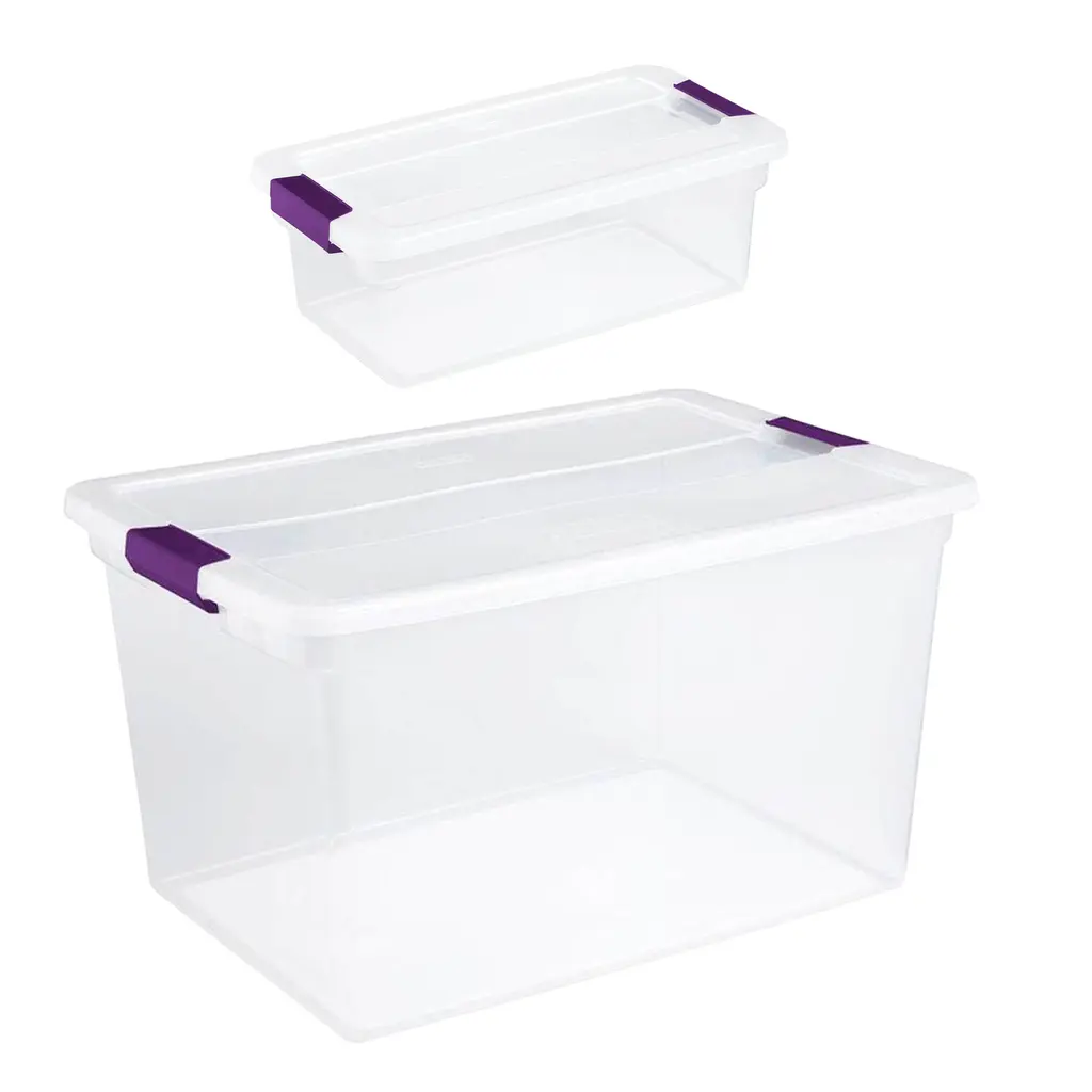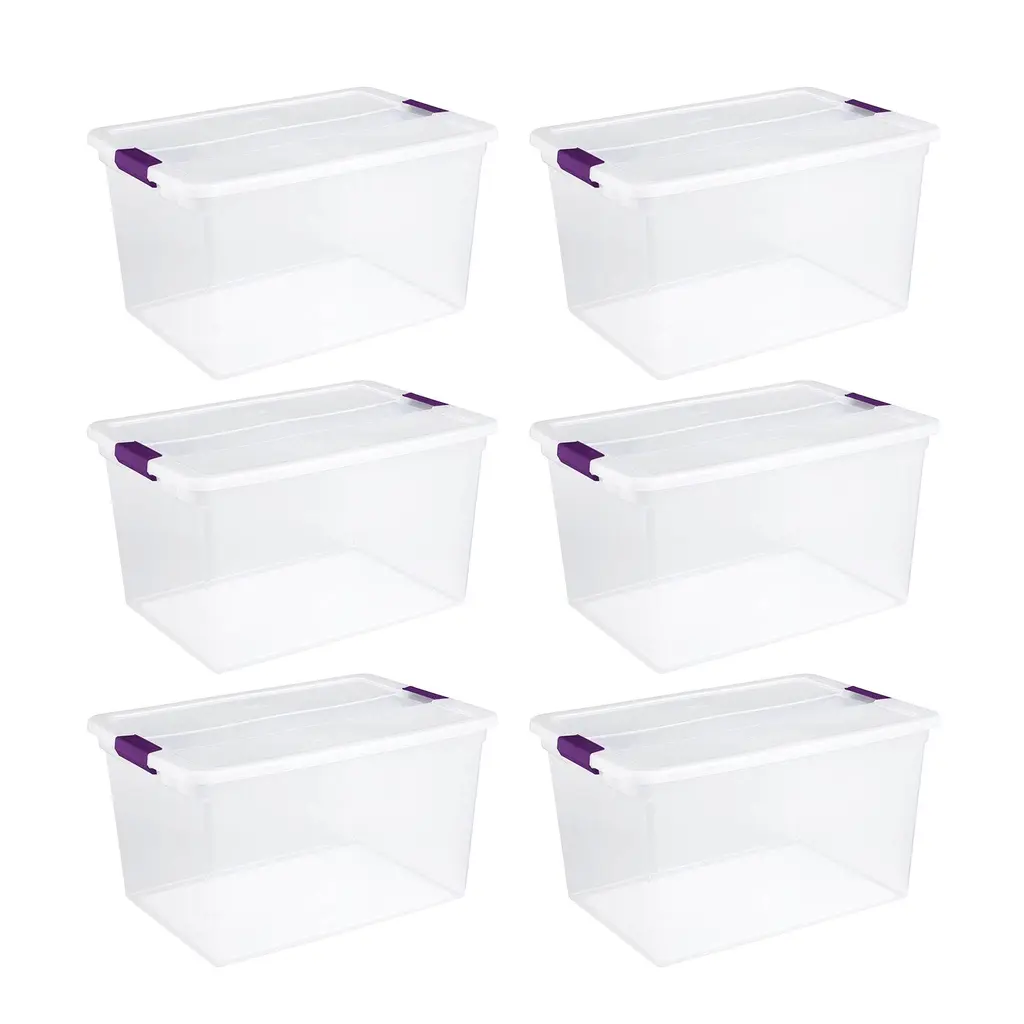 Create the ultimate household storage system with the Sterilite 66-Quart Storage Totes, 6 Pack, and 6-Quart Storage Totes, 12 Pack. This set of 18 multi-sized storage containers is ideal for storing a wide range of household items. The 66-quart storage box expertly stores bulky items around the home. Capable of fitting on most 24-inch closet shelving, these boxes easily store anything from decorations to off-season clothes to sports equipment. Ergonomic soft grip latches provide comfort and lock tight to protect against dust, dirt, and bugs. The 6-quart containers provide you with the exact space you need for carrying smaller household items. With identical latches, lids, and see-through designs, they pair perfectly with their 66-quart counterpart to create a sleek system of organization. Whether you're packing away shoes, crafts, or other small items, these storage bins are ideal for placement in closets, basements, garages, or attics and won't buckle, break, or leak in non-insulated environments. Enjoy a new system of storage and household management with the 66-Quart Storage Totes, 6 Pack, and 6-Quart Storage Totes, 12 Pack from Sterilite. Set of storage totes in 2 sizes creates a full home storage system for storing everything from decorations to beddings to off-season clothing Clear bins allow for easy visibility of stored items preventing you from having to search multiple totes for the item you're looking for Ergonomic latches keep bugs, dust, and dirt out with a heavy-duty seal while allowing for easy opening and closing Indented lids and contoured bases allow for stacking and provide access to untapped verticle storage space in your home Great for storing decorations, shoes, crafts, or other small items, or preserving keepsakes and knick-knacks Set includes: (6) 66-quart storage totes and (6) 6-quart storage totes Material: Plastic Color: Clear Dimensions 66-quart tote (L x W x H): 23.60 x 16.40 x 13.25 inches Dimensions 6-quart tote (L x W x H): 17 x 11.10 x 6.50 inches Weight: 4.60 pounds (66-quart) Weight:0.66 pounds (6-quart) Manufacturer's warranty: 1-year warranty
