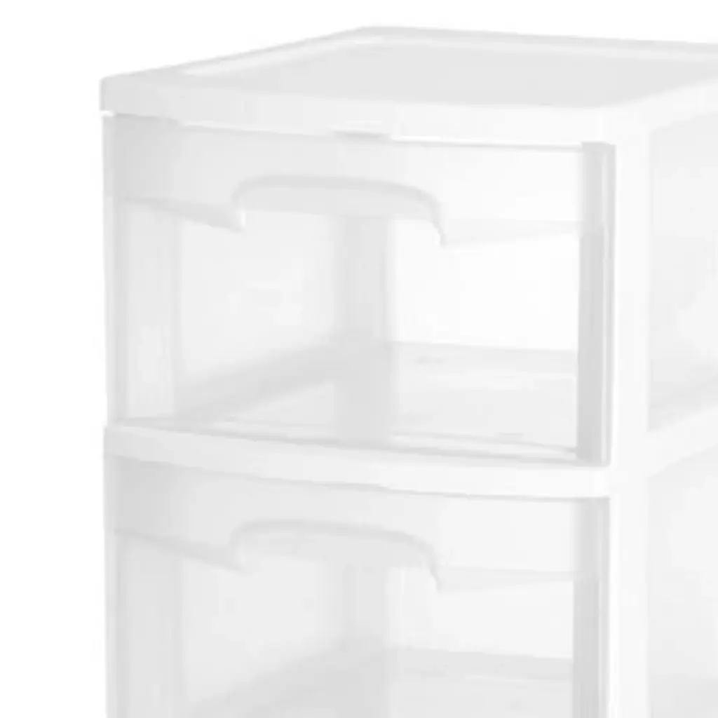 Great for most homes, apartments, garages, or dorm rooms to get extra storage whenever and wherever needed with the 2-pack of Sterilite Home 3 Drawer Wheeled Plastic Storage Containers. The carts provide 3 sturdy see-through drawers that allow for easy identification of contents. The design is ideal for use in the laundry room, closet, pantry, office, anywhere extra storage is needed. Casters are included to create a rolling storage option. Ergonomic handles allow for easy opening and closing of drawers. These storage drawer carts help contain clutter and can be used in your bathroom to quickly organize items such as towels, bath supplies, and more, keeping items easily accessible. Made of durable plastic and can be spot cleaned with a damp cloth. Create a clutter-free space and save yourself the hassle with this 2-pack of Sterilite Home 3 Drawer Containers that store your toys, magazines, books, tools, and other belongings. Set of (2) 2-wheeled and stackable 3-drawer totes that create extra closet space out of thin air and with clear design that provides great visibility Ideal for a variety of storage needs Stack for space or storage needs or attach wheels for maximum portability For easy care and cleaning, wipe clean with a damp cloth Casters are included for mobile storage Clear drawers and open side panels allow identification of contents No assembly required unless using wheels Made of durable plastic Type: Wheeled stackable drawers Material: Plastic Size: Medium Colors: Clear with white accents Dimensions (L x W x H): 14.5 x 12.66 x 25.66 inches Weight: 5.85 pounds Manufacturer warranty: 1-year warranty Quantity: 2