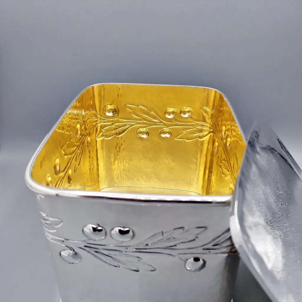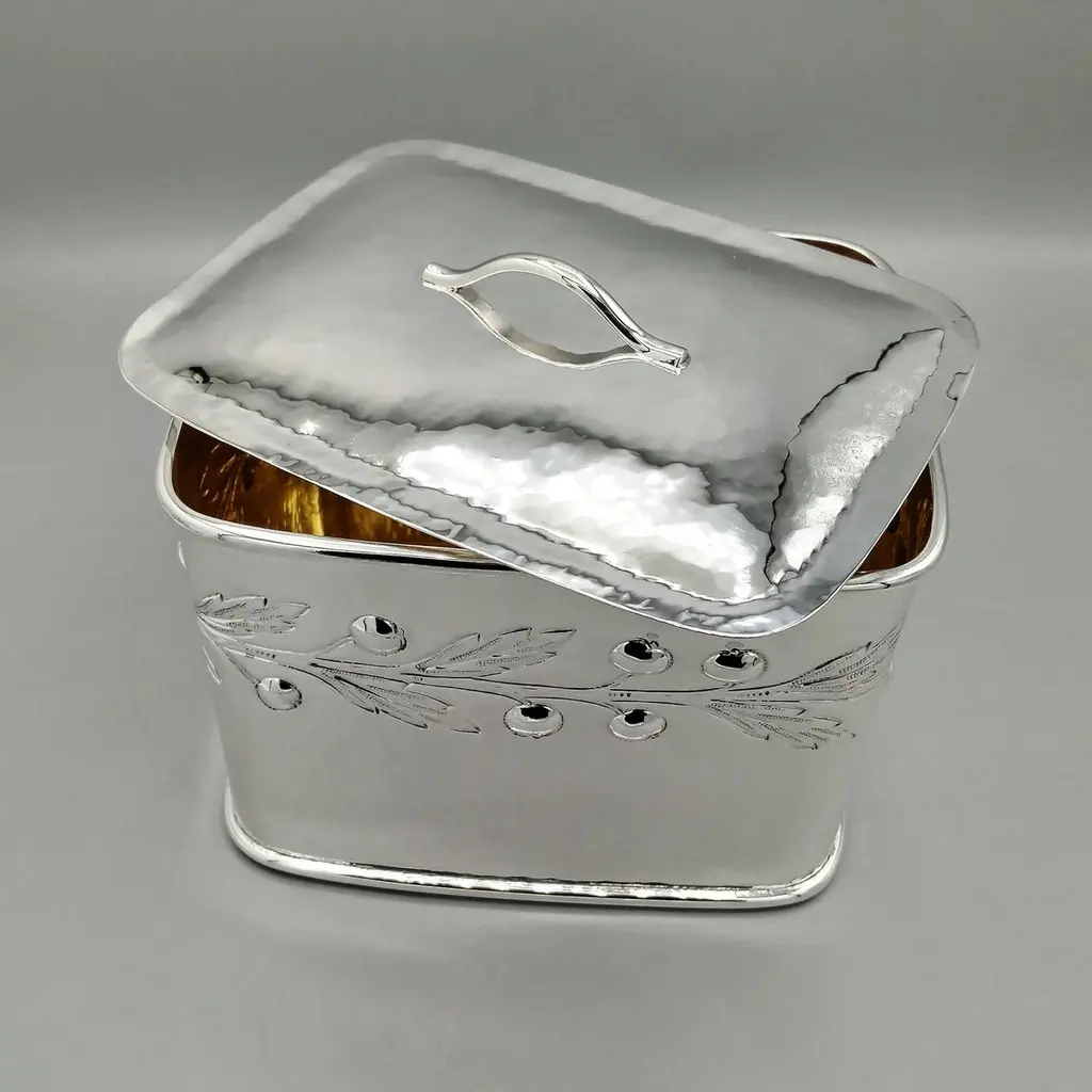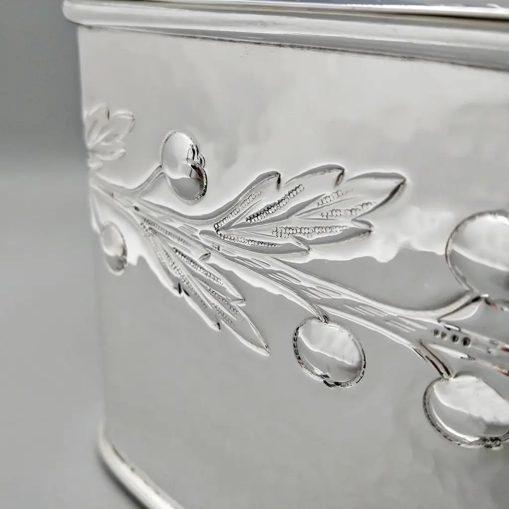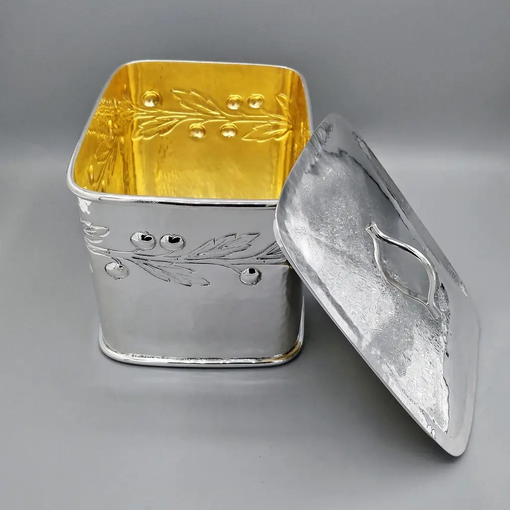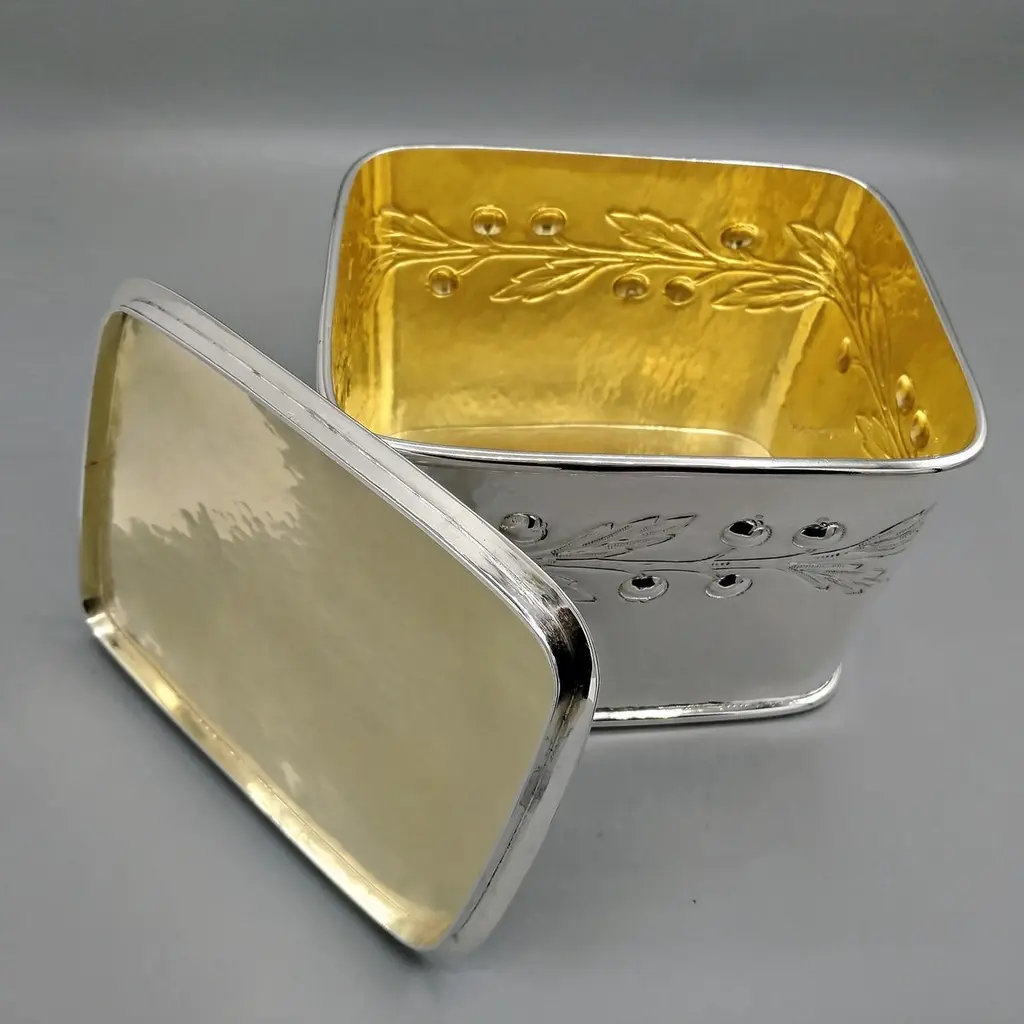 Large biscuit box entirely handmade starting from a raw sheet of 925 silver.The body was hammered into a rectangular shape and then the bottom was soldered.A leaf and berry motif was embossed on all four sides of the box.The lid, also hammered by hand, perfectly follows the shape of the biscuit box.A half-round silver wire handle was soldered to the top of the lid ensuring a secure grip.The inside of the box was finished with a satin 24kt gold plating.Made in Florence - Italy in a historic silversmith's workshop at the beginning of the 20th century for ARVAL ARGENTI VALENZA