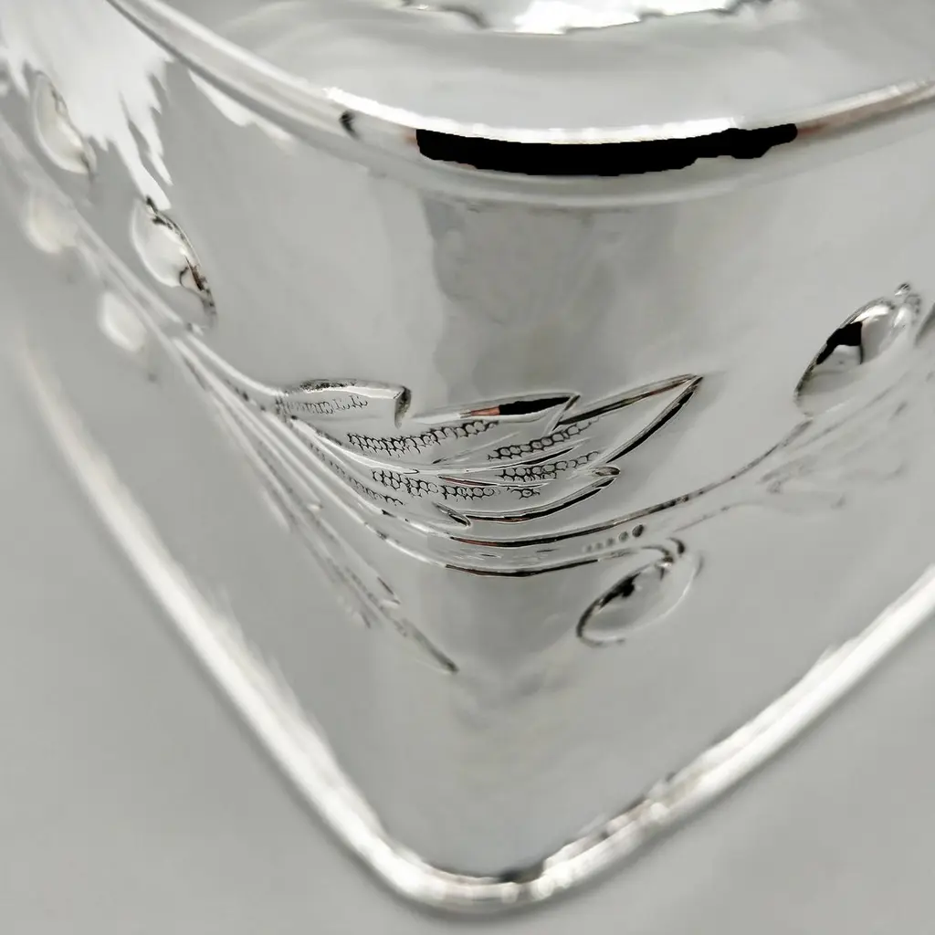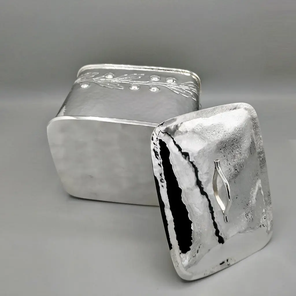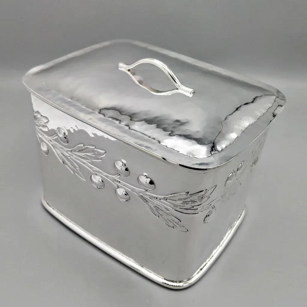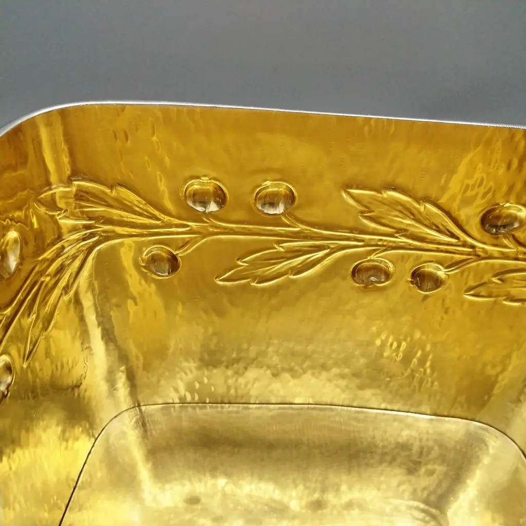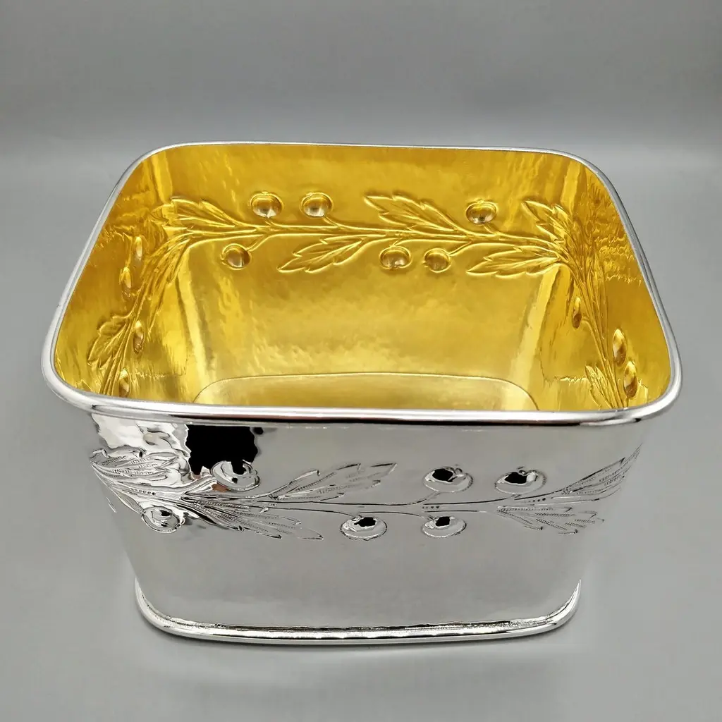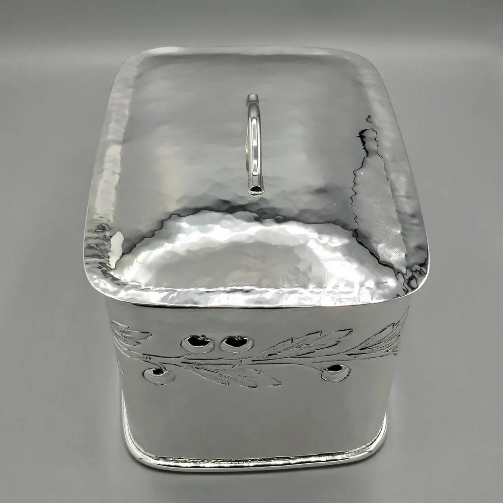 Large biscuit box entirely handmade starting from a raw sheet of 925 silver.The body was hammered into a rectangular shape and then the bottom was soldered.A leaf and berry motif was embossed on all four sides of the box.The lid, also hammered by hand, perfectly follows the shape of the biscuit box.A half-round silver wire handle was soldered to the top of the lid ensuring a secure grip.The inside of the box was finished with a satin 24kt gold plating.Made in Florence - Italy in a historic silversmith's workshop at the beginning of the 20th century for ARVAL ARGENTI VALENZA