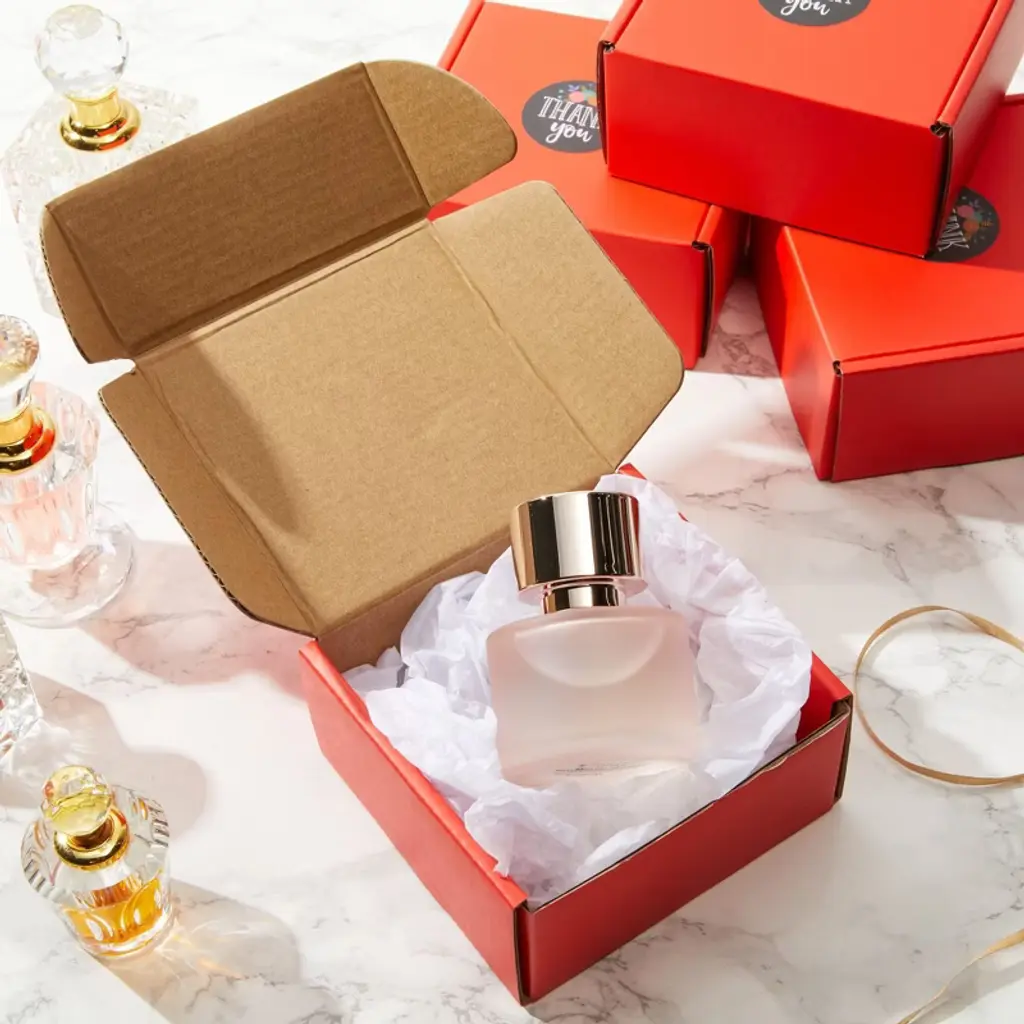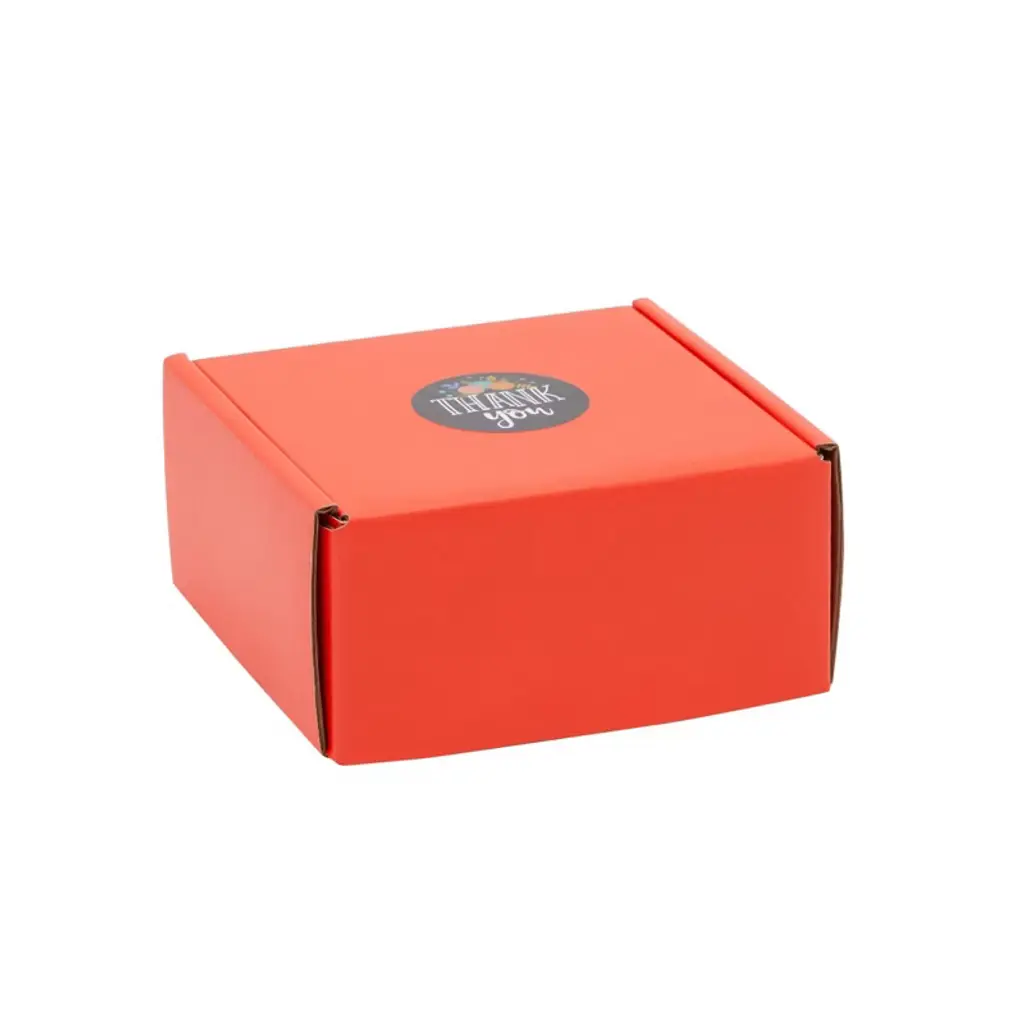 Use this set of 25 red corrugated cardboard boxes with thank you stickers for shipping and packaging clothing, pictures, art prints, and cosmetics to your customers. Each cardboard mailer measures 4 x 4 x 2 inches, the thick and rigid paper construction will ensure contents remain inside while in the mail. The red small shipping boxes can be customized with business logos, stickers, and stamps to help your small business packaging stand out from competitors!