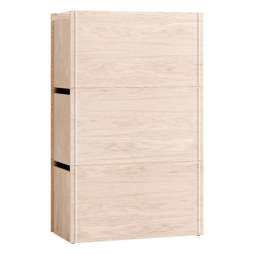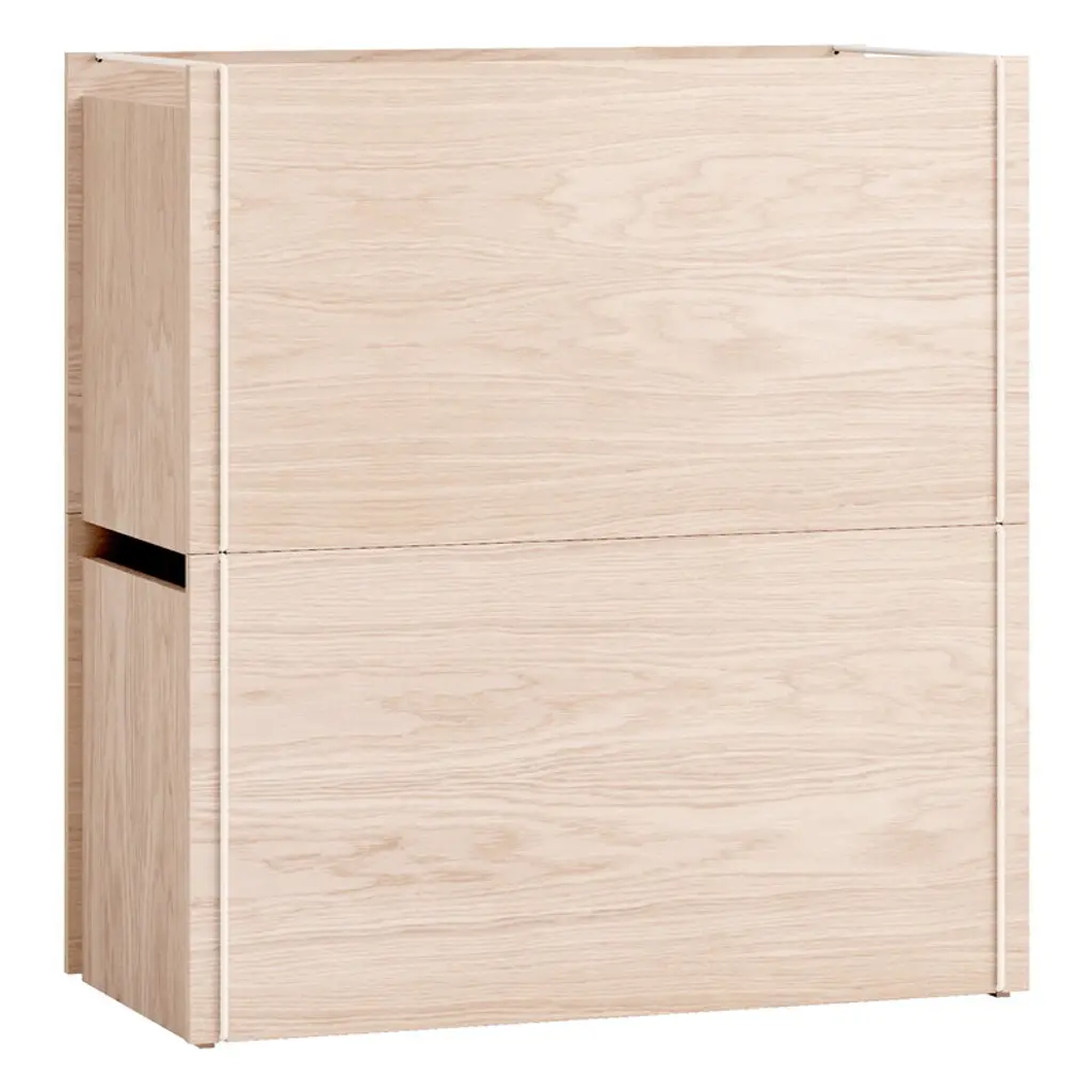 Moebe's storage box provides a minimalist, elegant setting for storing magazines, toys, cushions or folders. The box is stackable: you can stack up to three boxes to create a space-saving storage system, the parts of which can be easily lifted off, if necessary, by grabbing the metal handles. The wooden storage box can also be turned on its side or upright to make a nightstand or small side table out of it. The box can be complemented with a matching lid available for purchase separately.