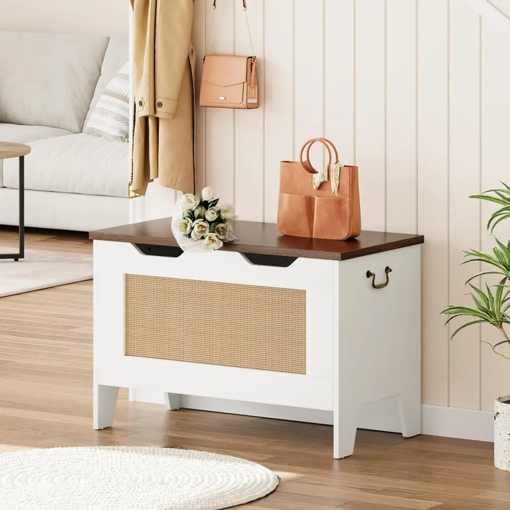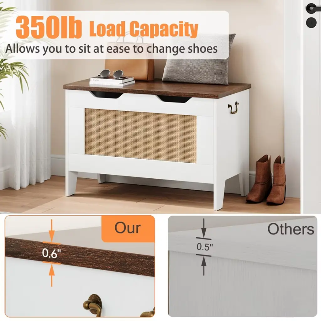 Organize and enhance your space with this 30" rattan storage chest, perfect for kids’ toys, blankets, books, or clothing. Crafted from durable high-density MDF, it supports up to 350 lbs, doubling as a sturdy bench for seating. Equipped with a safety hinge, it opens smoothly and prevents pinched fingers, ensuring worry-free use. The hand-woven rattan panels and white finish add rustic charm, while side handles and a U-shaped cutout make moving and opening effortless. Ideal for bedrooms, playrooms, entryways, or living rooms, this versatile storage bench combines style, safety, and functionality.