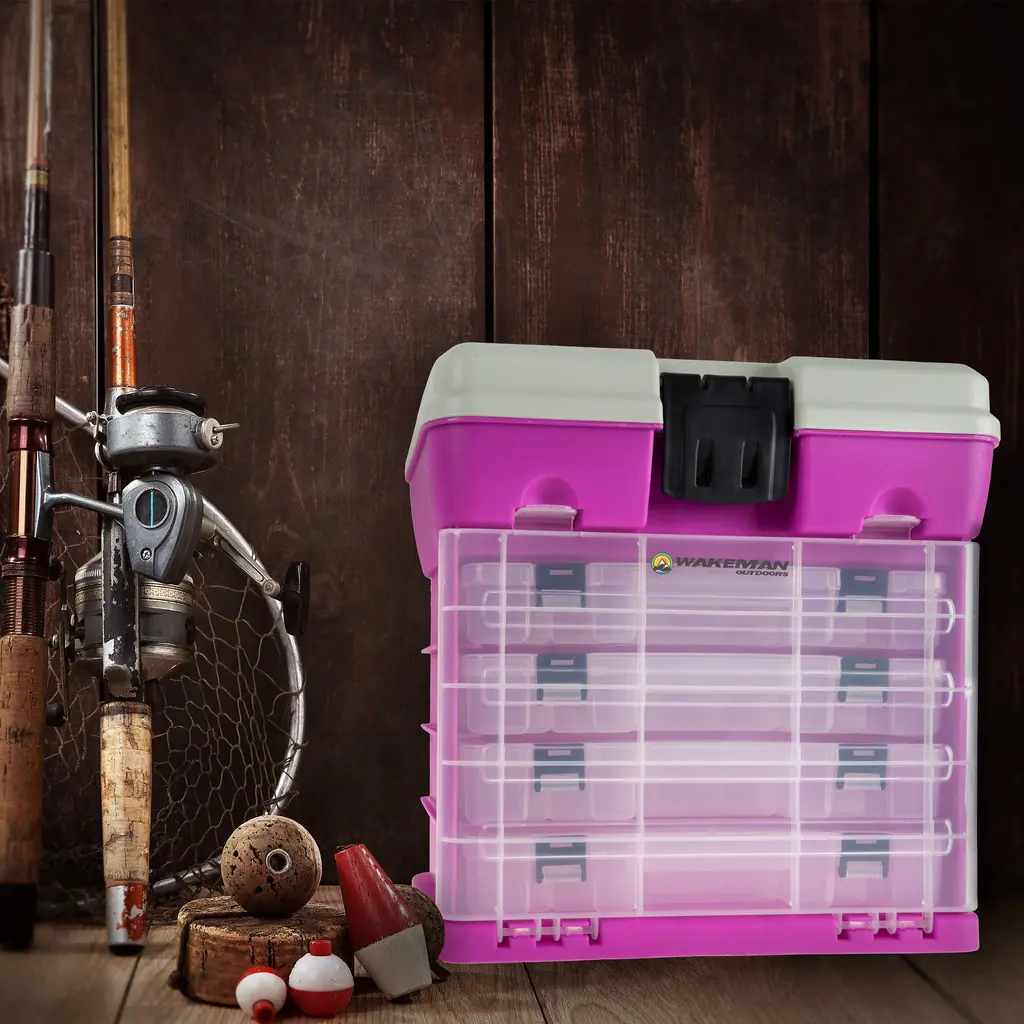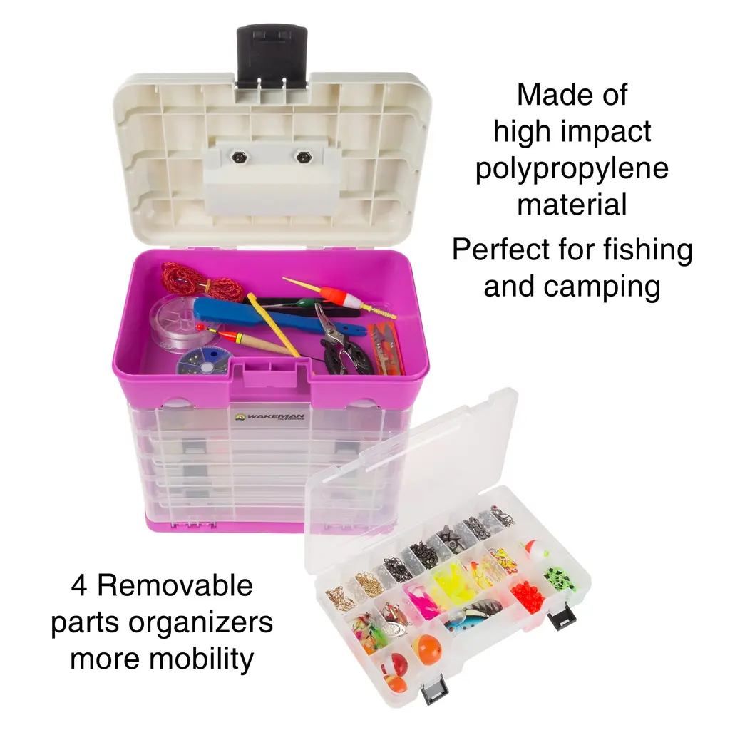 The Storage and Tool Box by Wakeman Outdoors is the one spot storage solution to keep your outdoor gear organized! Equipped with 4 clear plastic storage boxes, as well as the large main storage section that's perfect for holding bigger supplies, it has a spot for everything you need to keep neatly stored. Each drawer is fully removable, constructed from durable polypropylene, and features a secure snap shut lid and 19 compartments. The drawers all slide in and out of the main unit for quick access and are locked in with a latched cover when not in use. The case also has a convenient handle for portability and easy travel. It's an excellent multi-purpose storage box that's perfect for all of your outdoor supplies like fishing tackle and camping necessities!