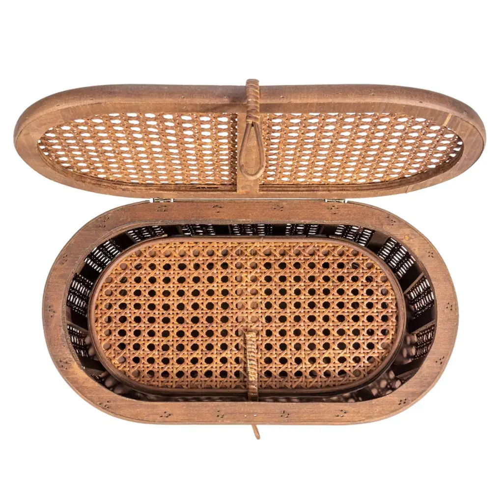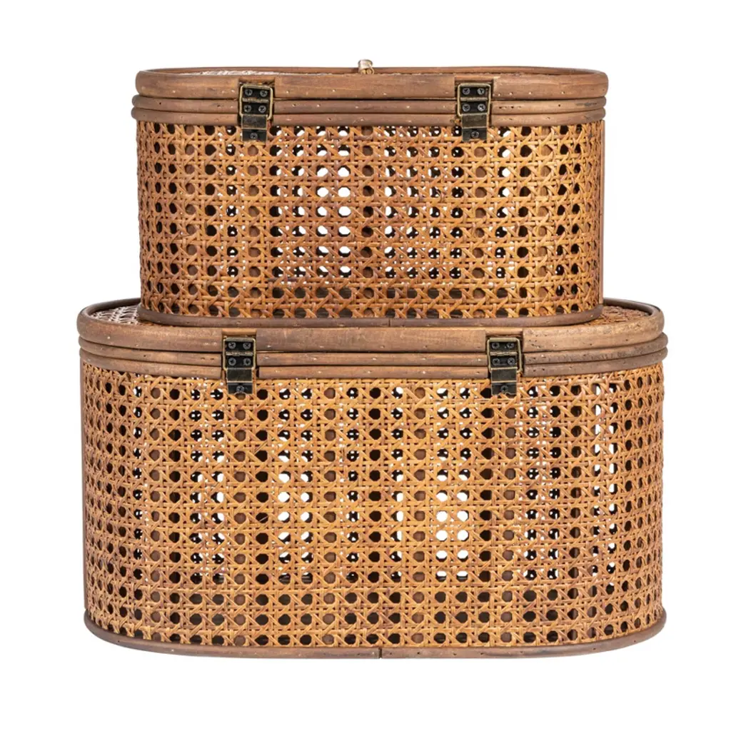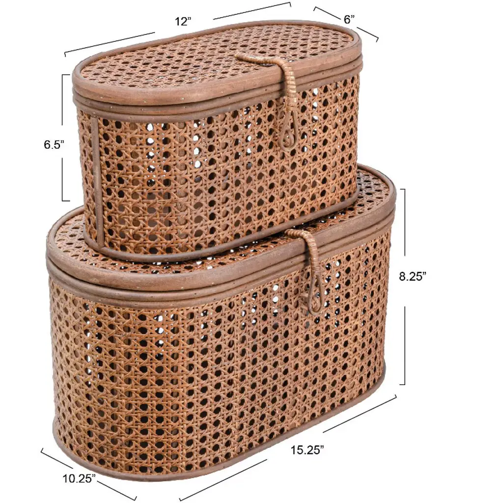Elevate any interior design scheme with these stunning decorative storage pieces that embody the essence of sophistication and natural beauty. This versatile set features two oval-shaped boxes, expertly crafted from woven rattan and finished with a rich, dark brown hue that exudes warmth and elegance. With their captivating woven texture and sleek attached closure, these storage boxes are as practical as they are beautiful. Display them as standalone accents in any living space, or fill them with well-loved textiles and throws to create a discreet yet stylish storage solution. These boxes are designed to be stacked when closed, offering a striking statement piece that adds both texture and depth to any interior design scheme. Alternatively, they can be nested when not in use, allowing for easy and space-saving storage. The natural beauty and sophistication of these boxes make them the perfect addition to any home that seeks to seamlessly blend form and function.