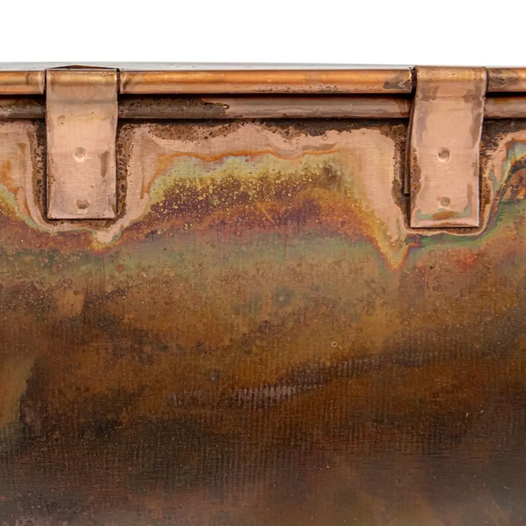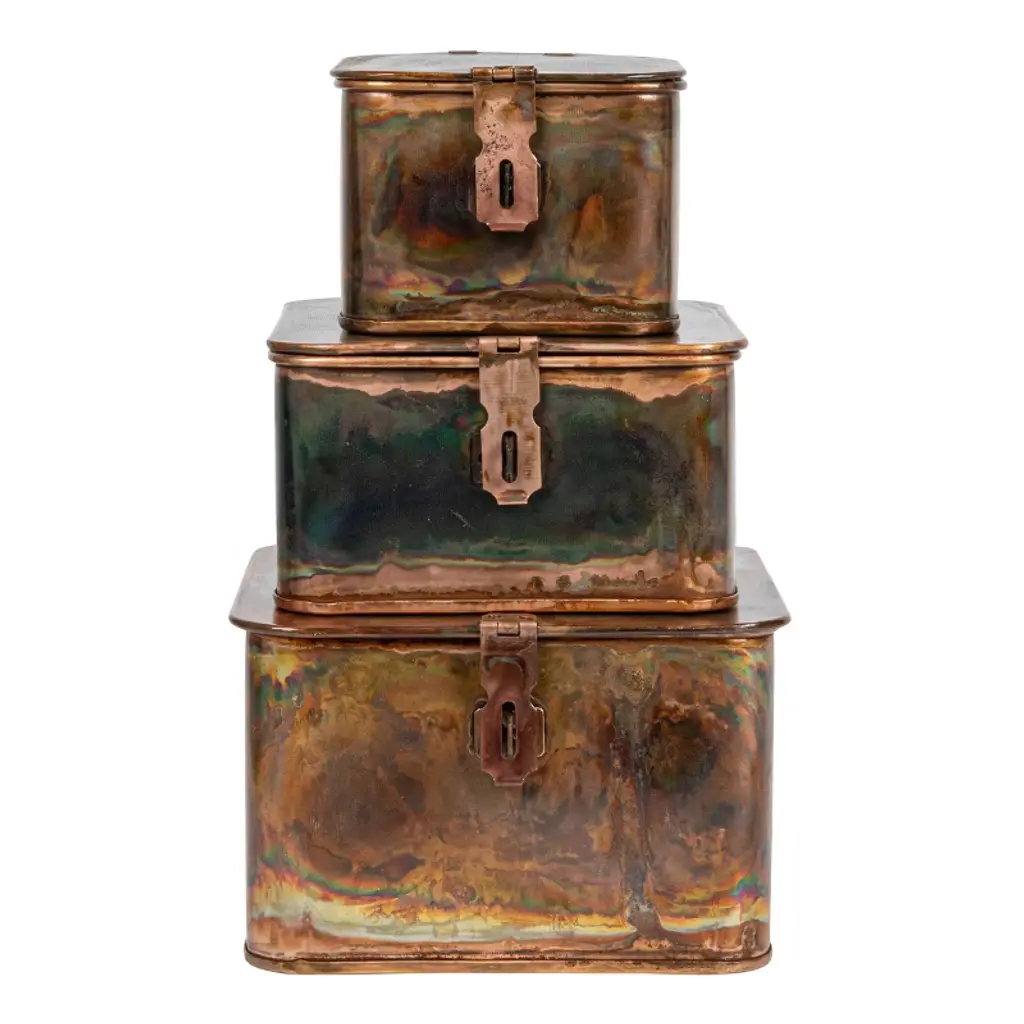 Add a touch of rustic elegance to any space with this set of three burnt copper metal boxes with lids and latches. These metal boxes have lids and latches that can be locked with a padlock or a key for extra security. The boxes have a stunning burnt copper finish, giving them a warm and sophisticated look. The boxes come in three sizes that can fit small trinkets, jewelry, or keepsakes. Display these boxes on a shelf, table, or dresser to add farmhouse, industrial, or eclectic flair to any space. The boxes measure 7 inches square, 6 inches square, and 4.5 inches square. This set of three burnt copper metal boxes with lids and latches is a stylish and secure storage solution that will enhance the beauty and style of the home. Order this today and enjoy a stylish and practical addition to any home.