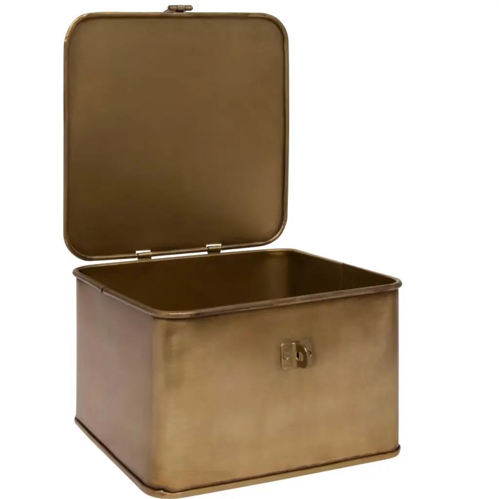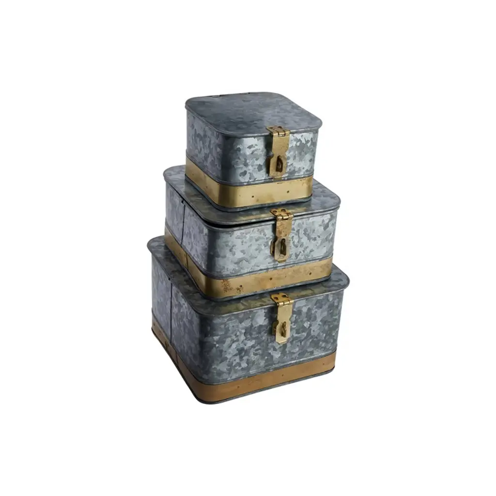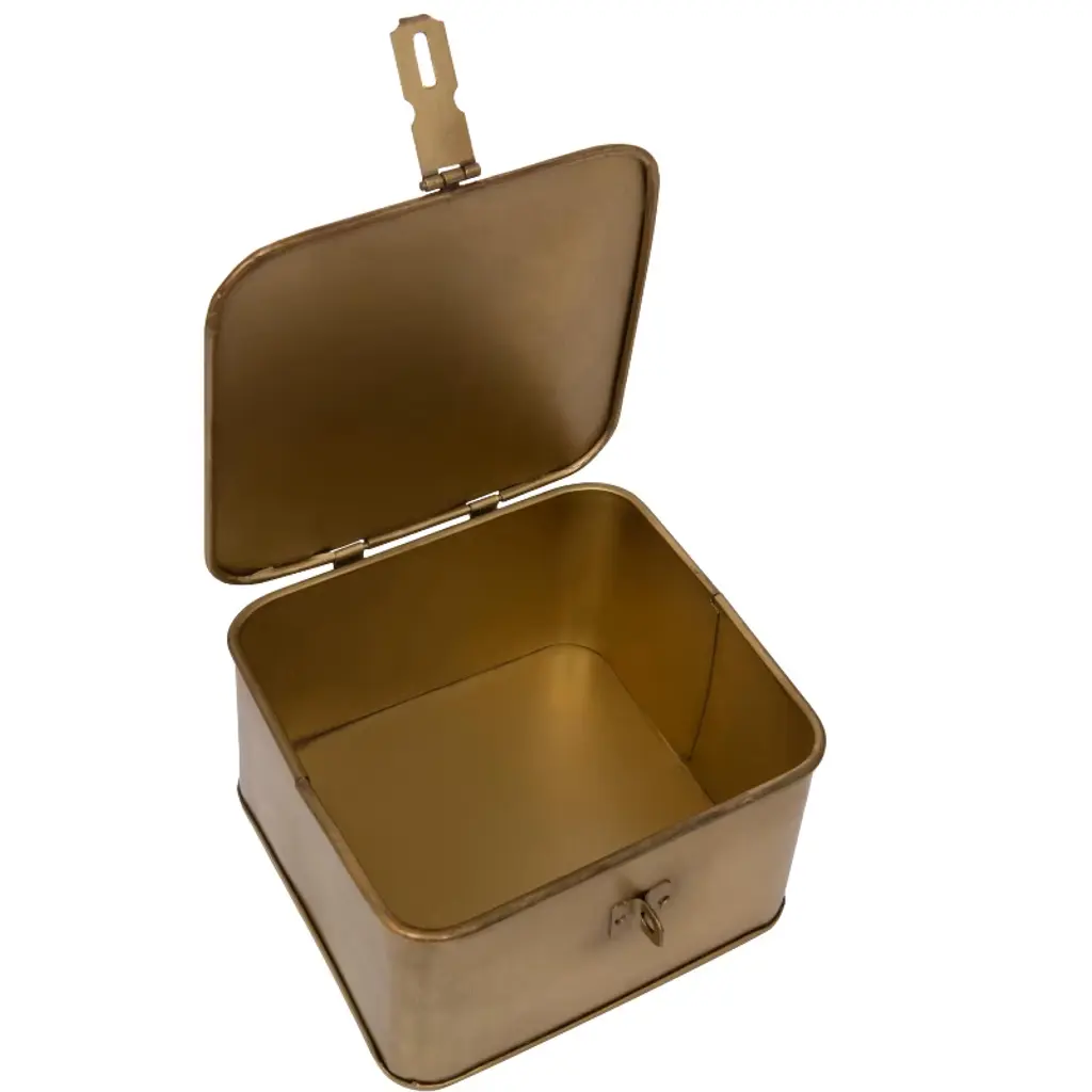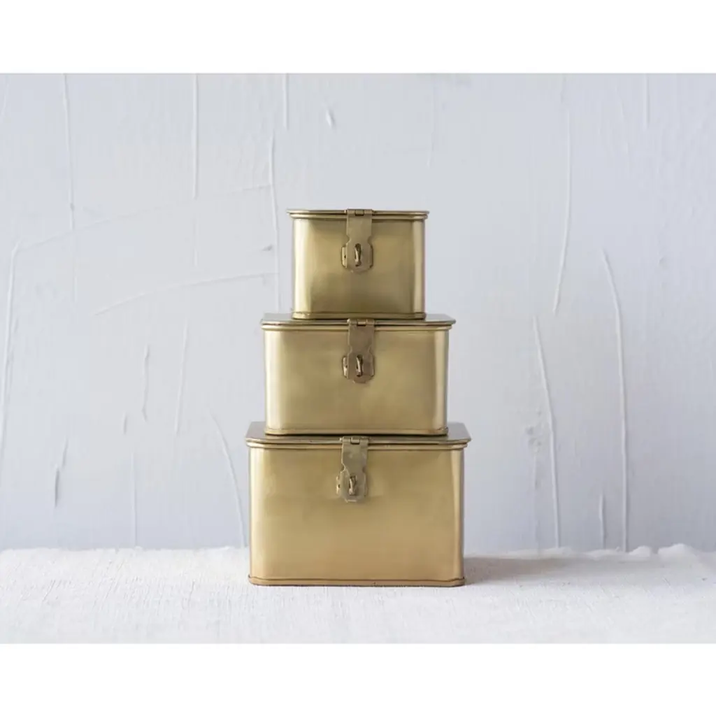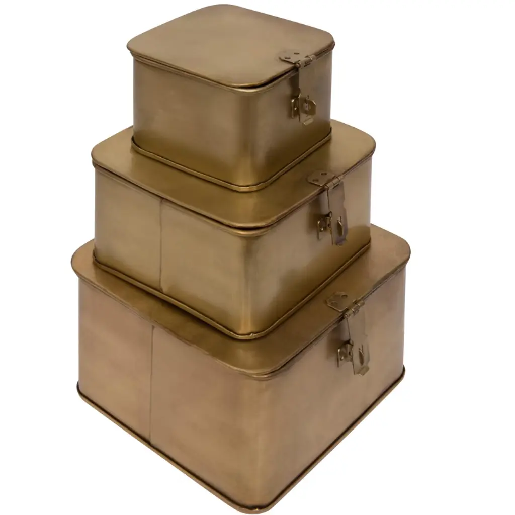 Add style and functionality to any home with this set of three lockable gold metal boxes. These gorgeous and secure metal boxes feature a shiny gold finish and a square shape that create a dazzling effect. These boxes can be used for storage or display, such as holding jewelry, accessories, valuables, or keepsakes. These boxes can be placed on the dresser, vanity, nightstand, or coffee table for a touch of sparkle and elegance. They also have a hinged lid and a latch that can be locked with a padlock for extra security. The boxes are made of metal with a gold finish that reflects light and creates a dazzling effect. The boxes have black velvet lining inside to protect the contents from scratches and dust. The boxes come in three different sizes: the small box measures 4.5 inches long, 4.5 inches wide, and 3.25 inches high; the medium box measures 6 inches long, 6 inches wide, and 3.5 inches high; and the large box measures 7 inches long, 7 inches wide, and 4.5 inches high. Order this today and enjoy a stylish and practical addition to any home.