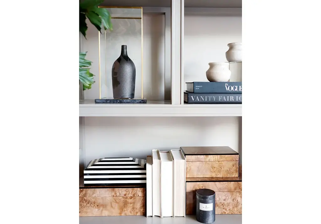 Final Sale Create a visually dynamic style with this eye-catching bone box. It features a straight-line pattern in bold black and natural bone with a slightly peaked lid. It effortlessly stows electronics or trinkets while lending a sophisticated, cultured look.