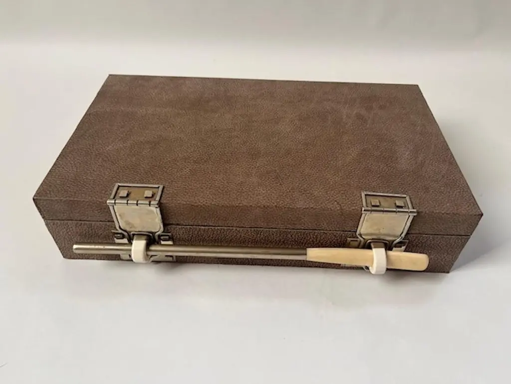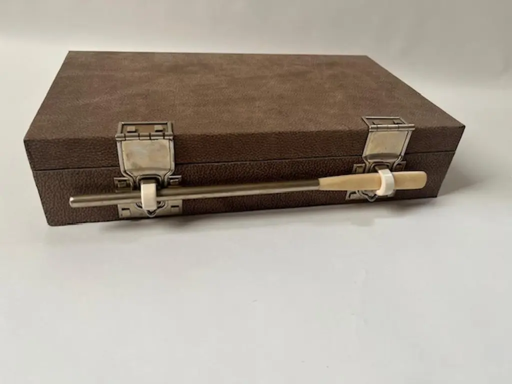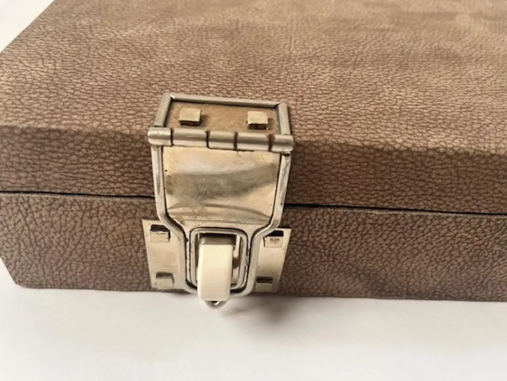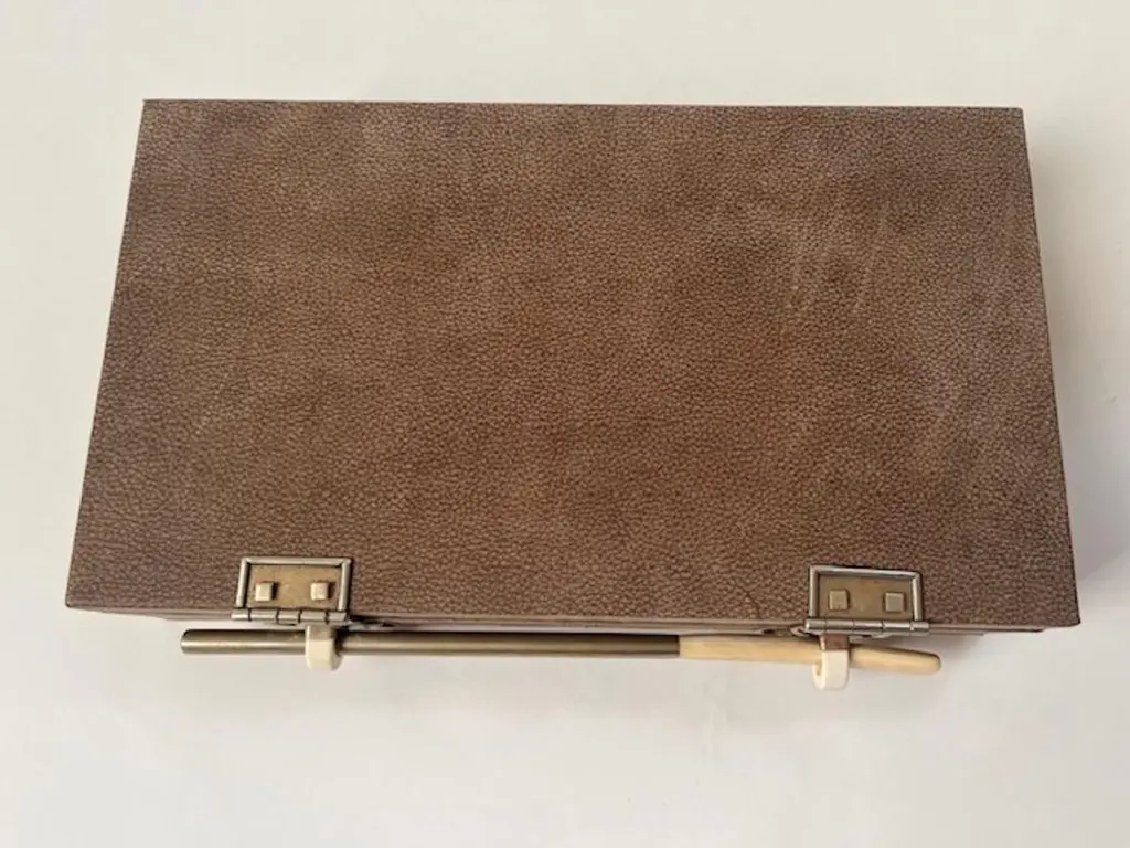 A large and interesting boxSuede covered wood body with a chromed metal and bone closure