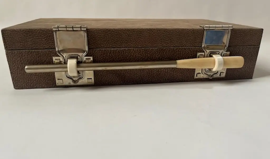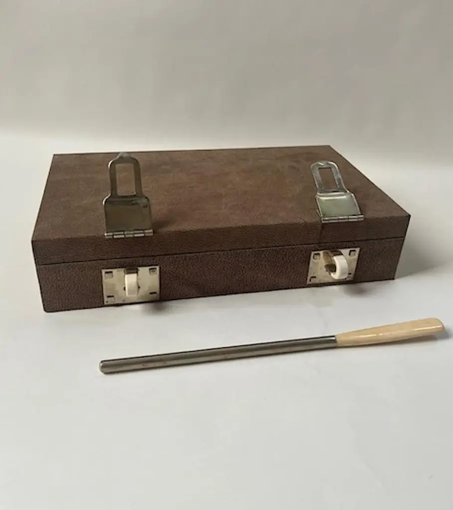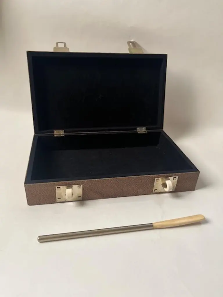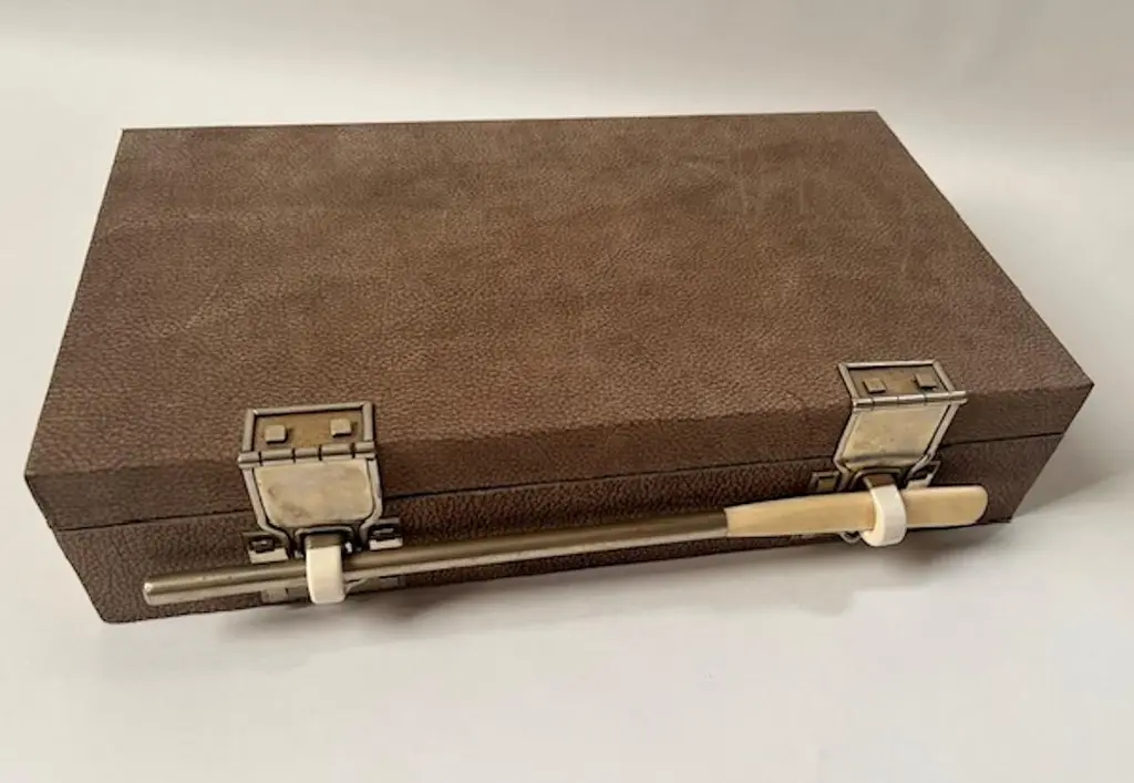A large and interesting boxSuede covered wood body with a chromed metal and bone closure