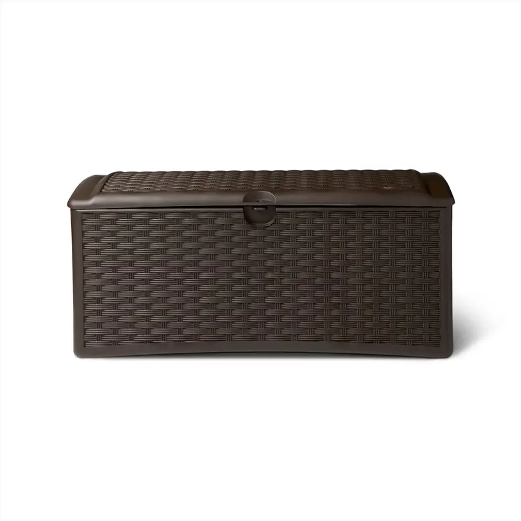 Bounteous outdoor storage space exists within the 2 pack of Suncast 72-Gallon Resin Wicker Deck Box. Molded with durable polypropylene plastic and featuring an attractive wicker-like facade, this patio storage bin is an affordable weatherproof solution for stashing seat cushions, grilling instruments, firewood, swimming pool accessories, gardening supplies or other outdoor accessories. This deck box is great for storing furniture cushions and outdoor accessories. The components snap into place without tools. The resin wicker is resistant to fading, denting, chipping, and peeling. The stylish wicker design blends well with patio furniture and home. The latching lockable lid shields your valuable items from sand, dust, pests, precipitation and UV rays. This deck storage box has an interior capacity of 72 gallons with a handy storage shelf build in so you can get at those smaller items quickly.