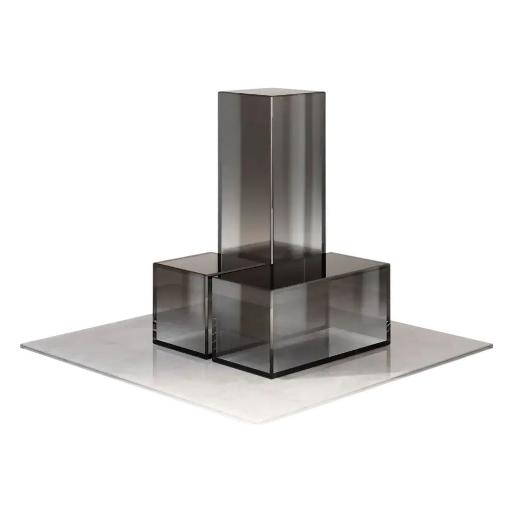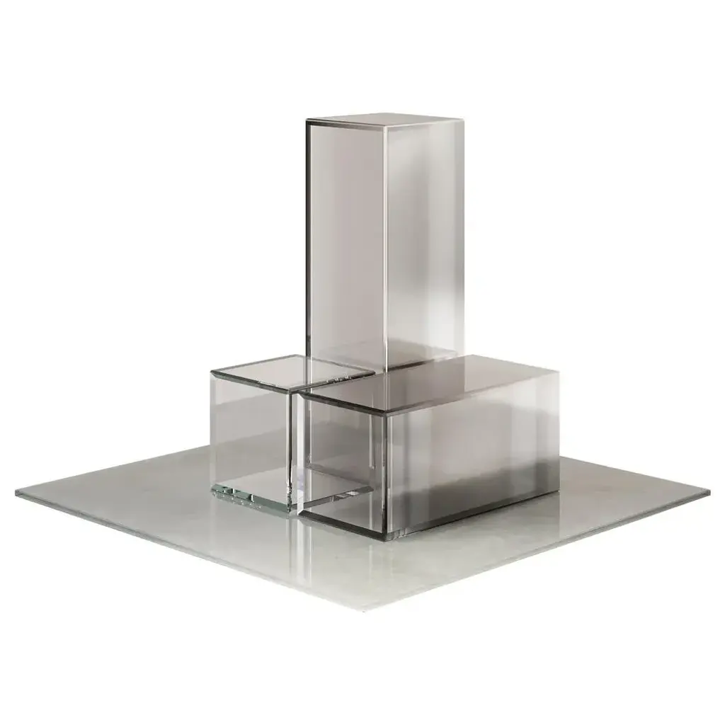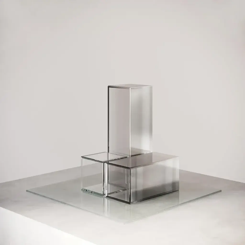 Set of 3 sunrise décor boxes by formaminima limited edition dimensions: box 1: h 5 x l 10.5 x d 5 cm. Box 2: h 5 x l 5 x d 5 cm. Box 3: h 15 x l 5 x d 5 cm. Plate: h 0.3 x l 21 x d 21 cm. Materials: handcrafted extra-clear crystal glass, mirror finish gradient. Weight: 260 g formaminima is an emerging brand within the italian design panorama, prone to exploring the concept of object itself, in the field of lighting and product design in its broadest sense. This exploration starts in the first instance from the tradition, from the artisan mastery and that making full of charm, care, and perseverance. Each project is in fact crafted in those same places where the know-how is handed down and kept for generations, exclusively in our territory. this piece is attributed to the mentioned designer/maker. It has no attribution mark and no official proof of authenticity, however it is well documented in design history. I take full responsibility for any authenticity issues arising from misattribution