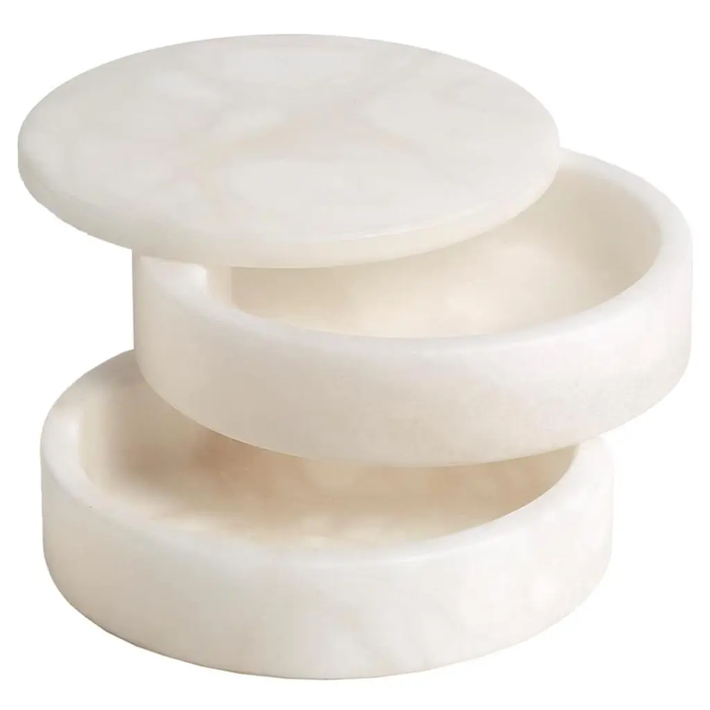 Suri Modern Natural White Alabaster Round Swivel Decorative Box