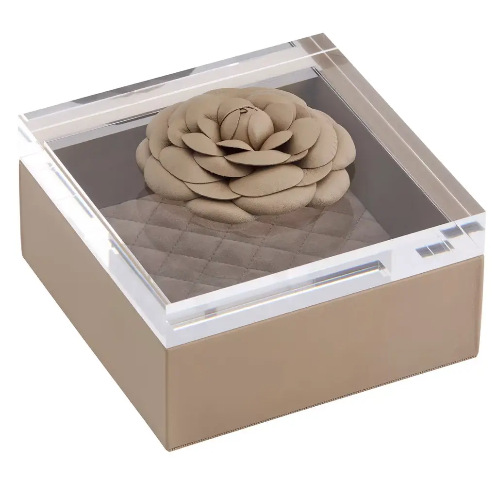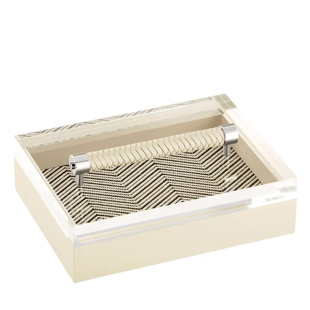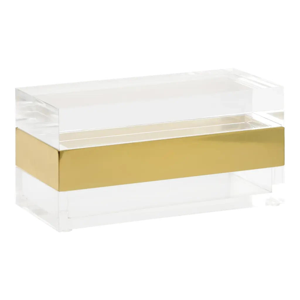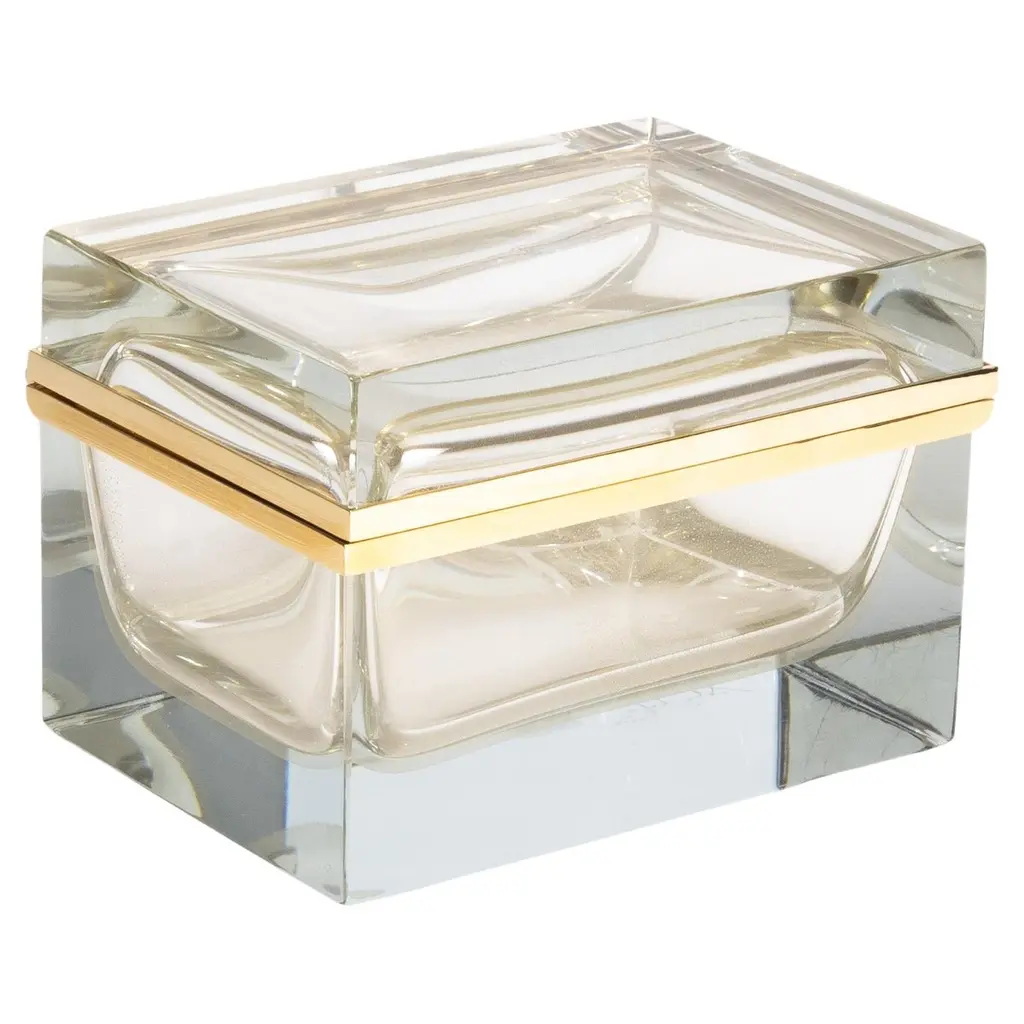 4"H X 10"W X 5"D Hundreds of tiny bubbles seem to be suspended in motion in the thick crystal top of this rectangular brass box.
