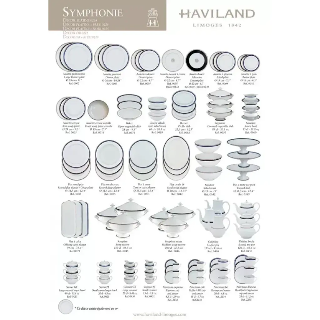 Symphony Dinnerware from Haviland is a masterful composition of platinum and Limoges porcelain. Each piece features a border of gold or platinum with a lyrical design. Five piece place setting includes dinner plate, salad/dessert plate, bread & butter plate, teacup and saucer. Haviland Porcelain was founded by David Haviland, an American who moved from New York to France after he was brought a broken tea cup to match and recognized the quality and color of the old piece of porcelain. Filled with curiosity, he went to France to find the factory where the cup had been made, but the samples he was sent were not up to his standards. So in 1841, he moved to Limoges to set up his own factory. Traditional French dinnerware was usually produced in Limoges and sent to Paris for decoration. Haviland insisted on setting up a studio within his factory to have more control over the designs. Renowned artists, including Cocteau, Dali, and Kandinsky have played a role in the company's designs. Today, Haviland is one of the premier names in French porcelain dinnerware, sought by collectors all over the world. Clients have included the White House, Empress Eugenie, General de Gaulle, Jacques Chirac, the Emperor of Japan, and the Royal Court of Morocco.