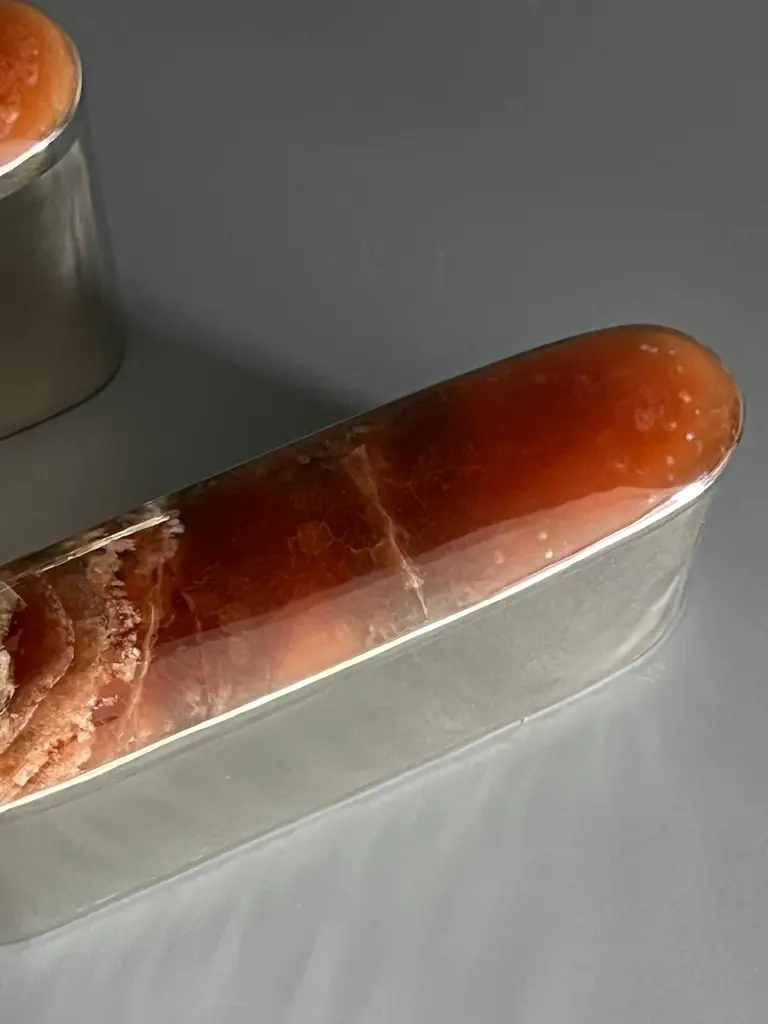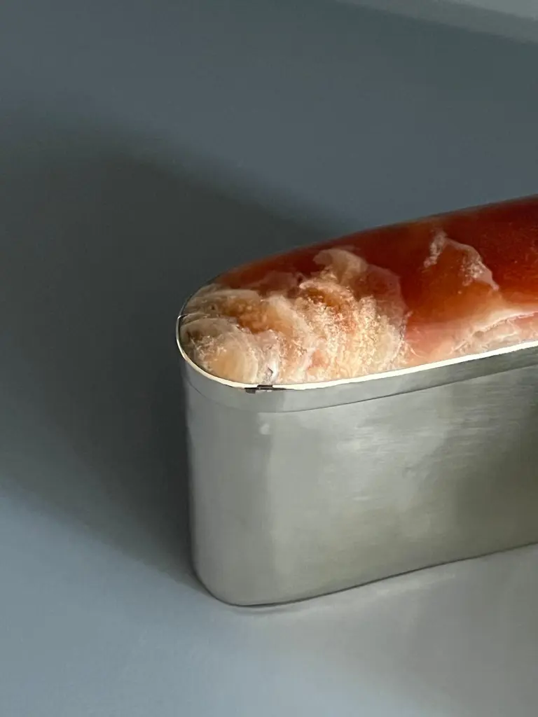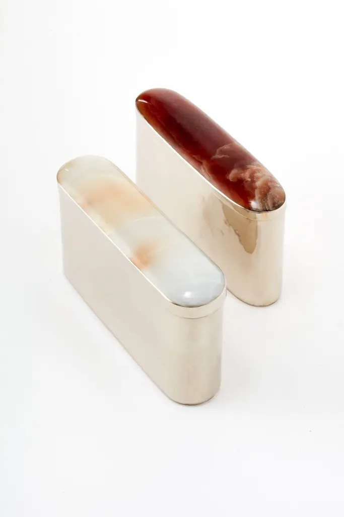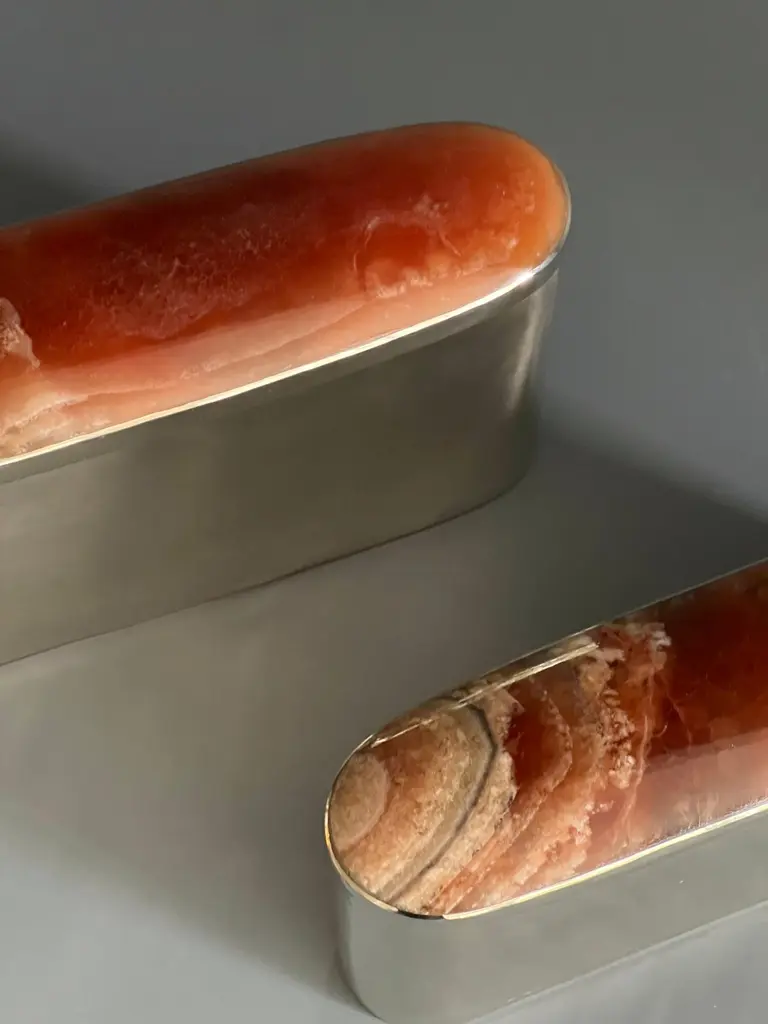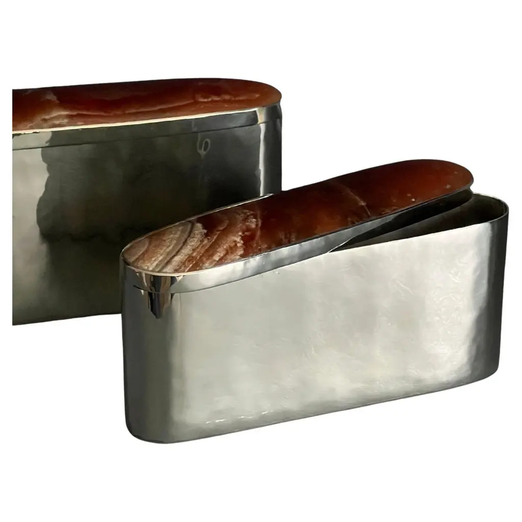 Tafi oval box, it is made entirely by hand in alpaca metal and onyx stone. It comes in three different sizes and you can choose between four different onyx stone colors: black, white/cream, blue or bordeauxOur pieces are made by hand. One of a kind.All natural stones may vary in color.About AIREDELSUR:With its rustic chic personality and the elegant designs of Marcelo Lucini, AIREDELSUR combines the exquisite character of Argentina and its talented craftsmen. AIREDELSUR presents exclusive collections for the home. AIREDELSUR’s products reflect a native concept that has been refined in such a way that elegance is present in every object of home décor. 100% handmade, AIREDELSUR works with alpaca silver; a variety of rich woods; cow, goat and deer horns; natural cow and horsehide leathers; and semi-precious onyx and agate.
