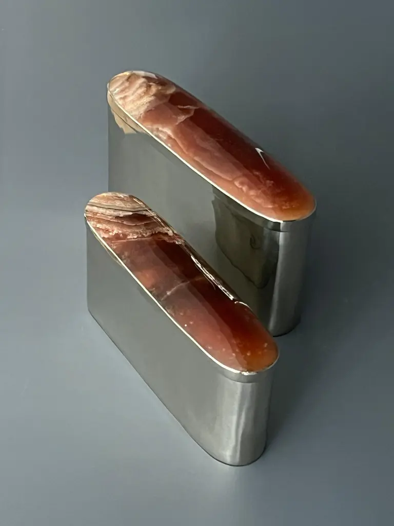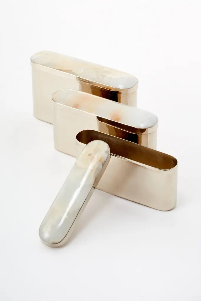 Tafi oval box, it is made entirely by hand in alpaca metal and onyx stone. It comes in three different sizes and you can choose between four different onyx stone colors: black, white/cream, blue or bordeauxOur pieces are made by hand. One of a kind.All natural stones may vary in color.About AIREDELSUR:With its rustic chic personality and the elegant designs of Marcelo Lucini, AIREDELSUR combines the exquisite character of Argentina and its talented craftsmen. AIREDELSUR presents exclusive collections for the home. AIREDELSUR’s products reflect a native concept that has been refined in such a way that elegance is present in every object of home décor. 100% handmade, AIREDELSUR works with alpaca silver; a variety of rich woods; cow, goat and deer horns; natural cow and horsehide leathers; and semi-precious onyx and agate.