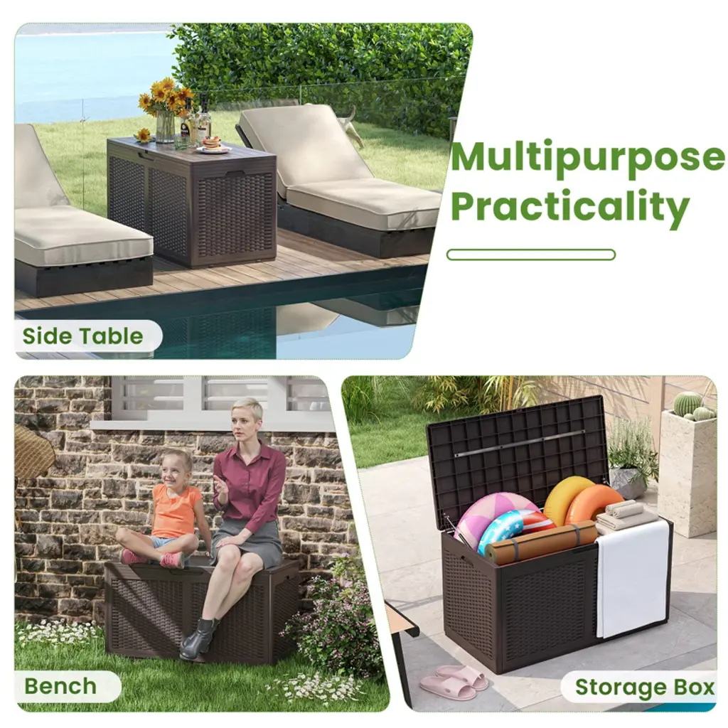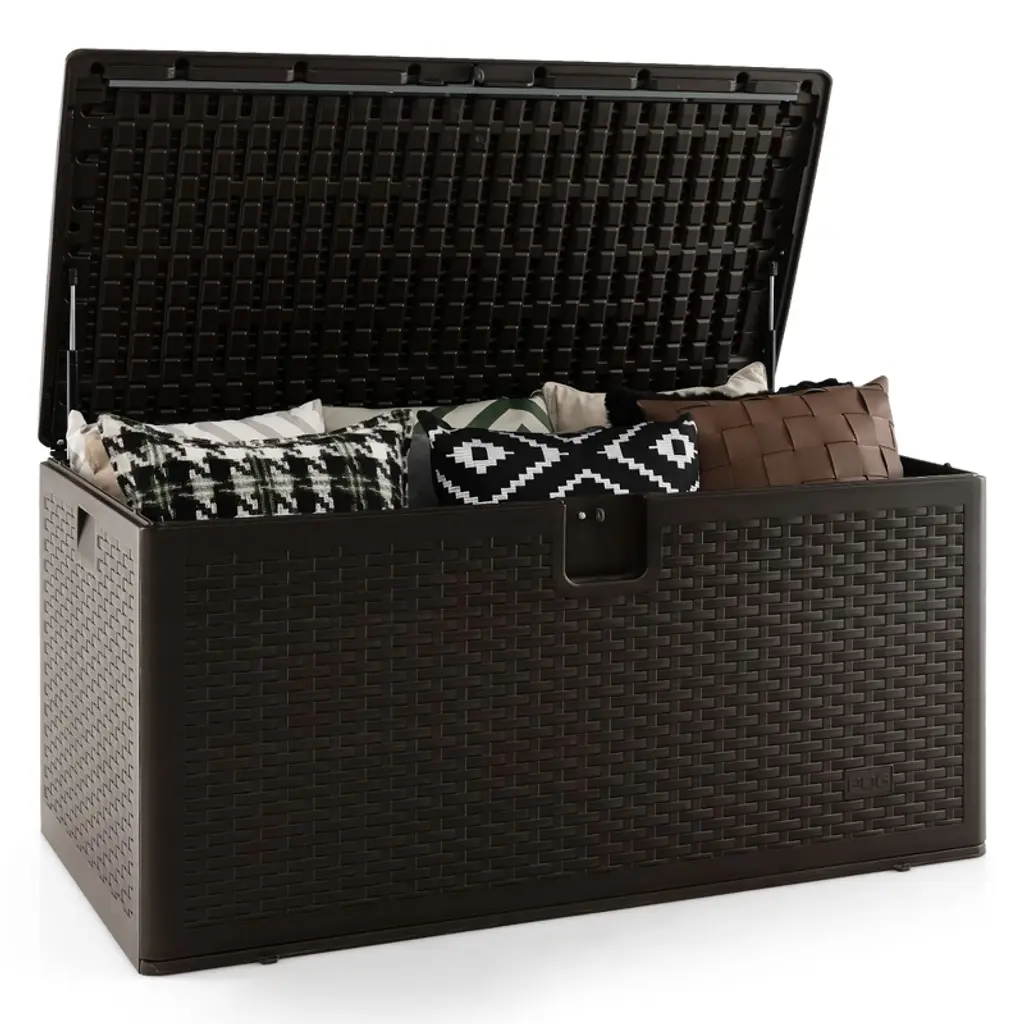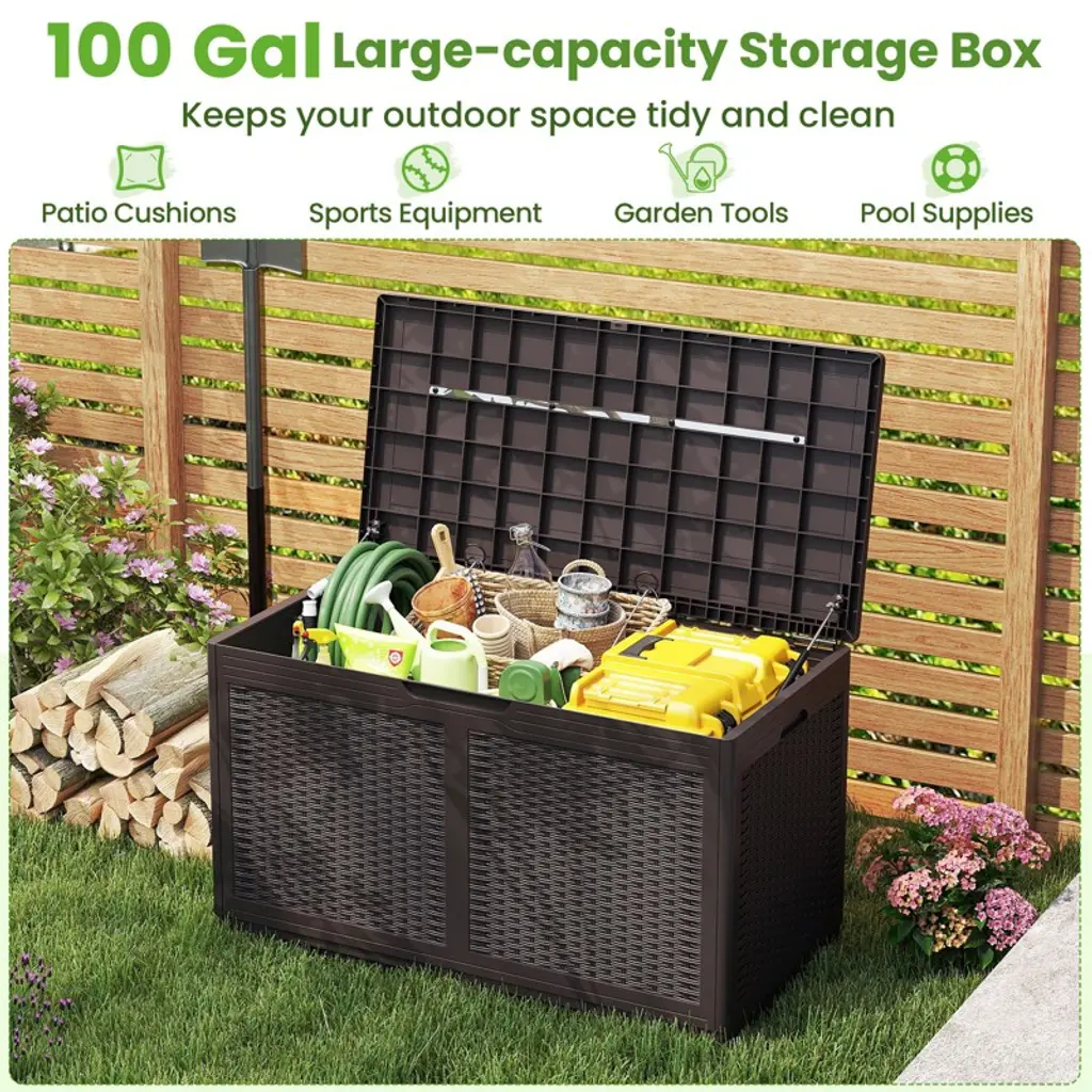 Maximize your outdoor space with our versatile 100-gallon resin deck box! This storage solution effortlessly combines style and functionality, with a sturdy and weather-resistant construction that can hold everything from patio cushions to sports equipment. The elegant rattan design seamlessly blends into any outdoor decoration, while this storage box can even double as a bench or side table. The thoughtfully crafted details including the reliable gas struts and a lock hole enhance security. Plus, with convenient side handles and transport wheels, moving this deck box around your patio or garden is a breeze. Upgrade your outdoor storage game with this space-saving wonder today!FeaturesCan be used as a storage box, bench or side table100 Gal large-capacity storage box keeps your outdoor space tidy and clean2 transport wheels and built-in side handles for effortless movement Reliable gas struts are robust and effort-saving for safe opening and closingA lock hole design ensures the items stored inside remain secureWaterproof PP surface is easy-to-clean and built-to-lastReinforced metal crossbar enhance durability and stabilityElegant rattan-like texture adds aesthetic appealSmooth rounded edges prevent accidental bumpsApplicable to various occasions, like the backyard, poolside or gardenSpecifications: Color: Brown/Black/Grey Material: PP, Metal Overall Dimensions: 44" x 22" x 24" (L x W x H) Capacity: 100 Gal Weight Capacity of Lid: 440 lbs Net Weight: 25 lbs Package Includes: 1 x Storage Box 1 x User Manual