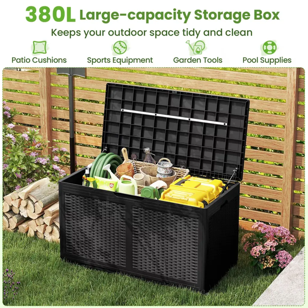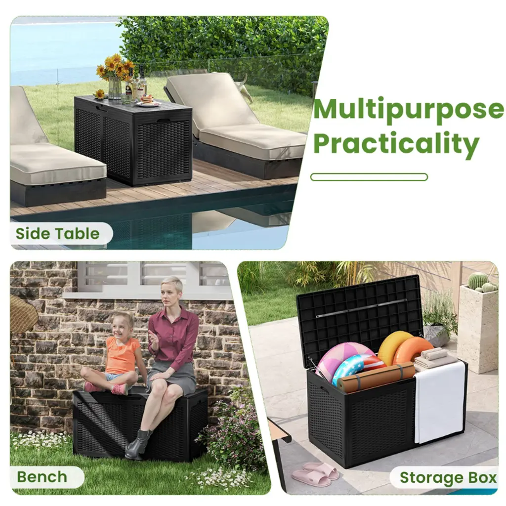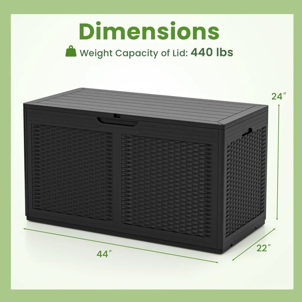 Maximize your outdoor space with our versatile 100-gallon resin deck box! This storage solution effortlessly combines style and functionality, with a sturdy and weather-resistant construction that can hold everything from patio cushions to sports equipment. The elegant rattan design seamlessly blends into any outdoor decoration, while this storage box can even double as a bench or side table. The thoughtfully crafted details including the reliable gas struts and a lock hole enhance security. Plus, with convenient side handles and transport wheels, moving this deck box around your patio or garden is a breeze. Upgrade your outdoor storage game with this space-saving wonder today!FeaturesCan be used as a storage box, bench or side table100 Gal large-capacity storage box keeps your outdoor space tidy and clean2 transport wheels and built-in side handles for effortless movement Reliable gas struts are robust and effort-saving for safe opening and closingA lock hole design ensures the items stored inside remain secureWaterproof PP surface is easy-to-clean and built-to-lastReinforced metal crossbar enhance durability and stabilityElegant rattan-like texture adds aesthetic appealSmooth rounded edges prevent accidental bumpsApplicable to various occasions, like the backyard, poolside or gardenSpecifications: Color: Brown/Black/Grey Material: PP, Metal Overall Dimensions: 44" x 22" x 24" (L x W x H) Capacity: 100 Gal Weight Capacity of Lid: 440 lbs Net Weight: 25 lbs Package Includes: 1 x Storage Box 1 x User Manual