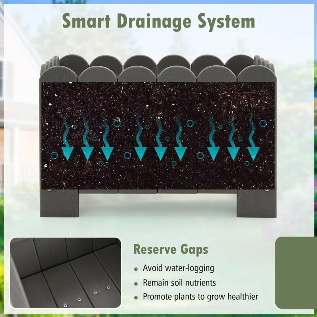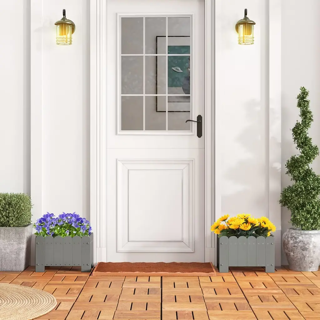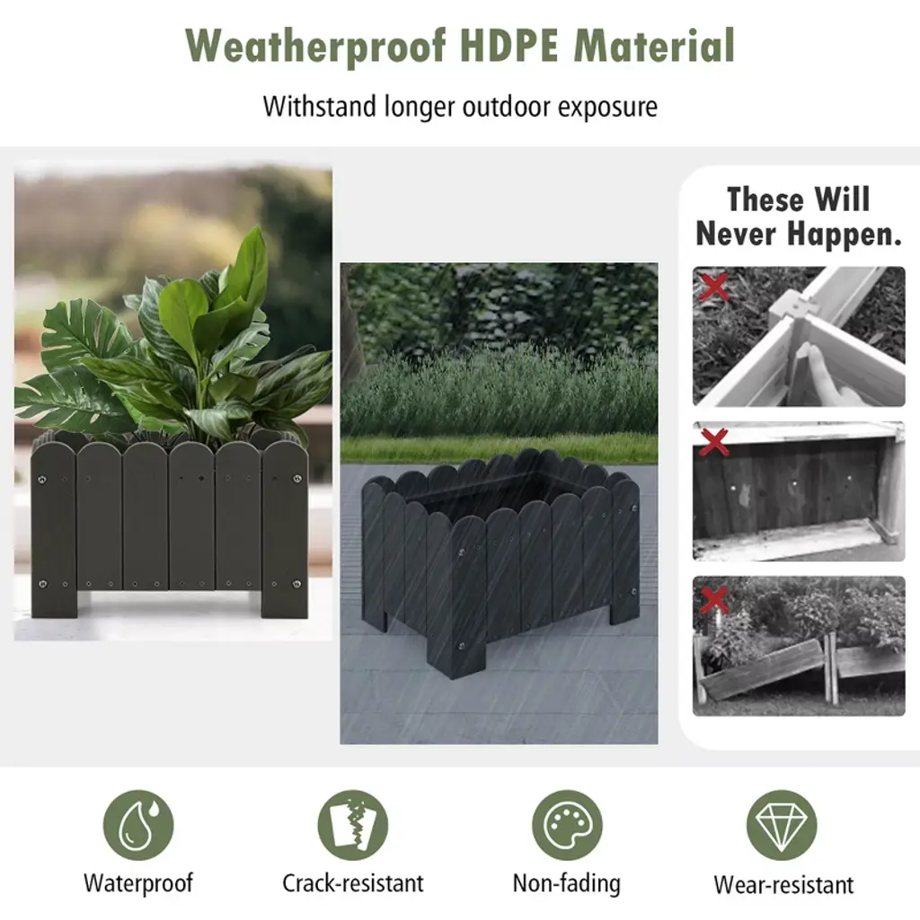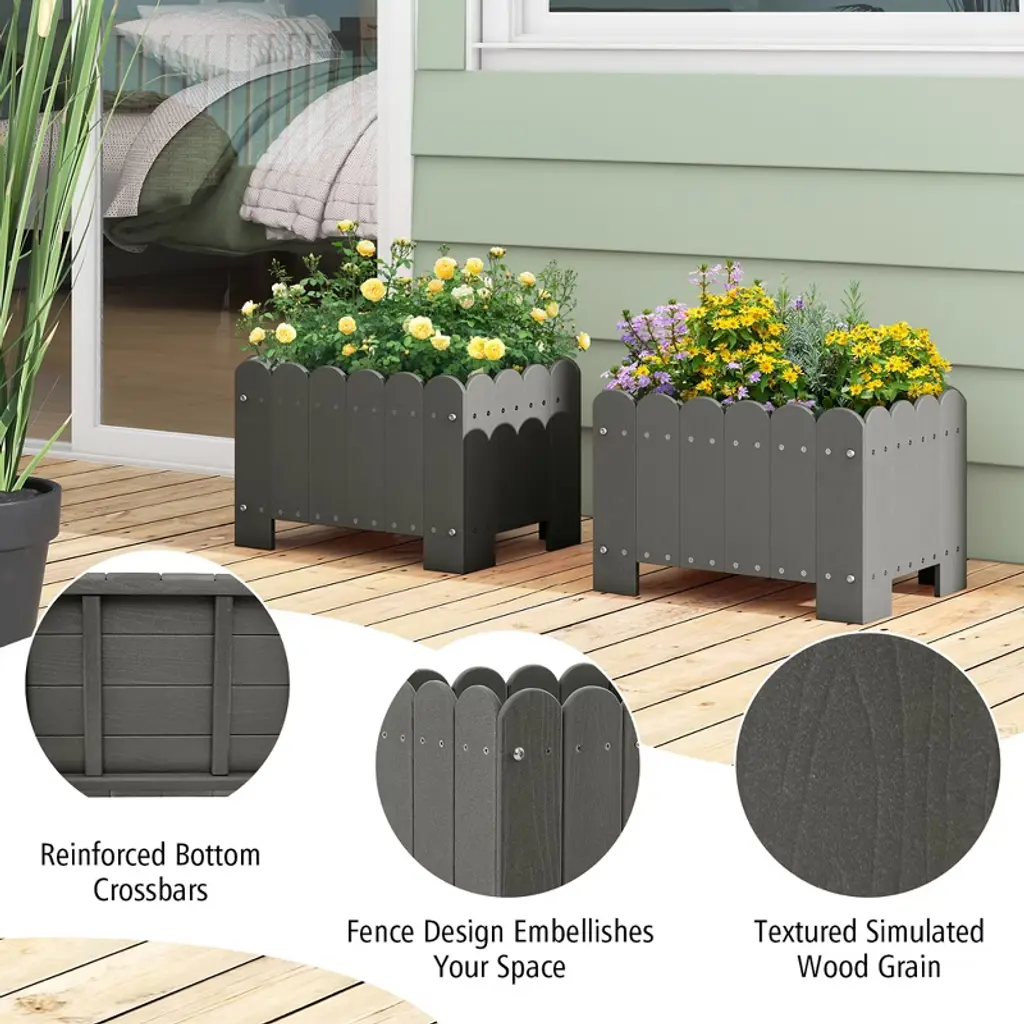 Unleash you green thumb with our innovative garden bed. The outdoor plastic plant boxes will unleash your gardening imagination, which are perfect for showcasing your favorite potted plants, flowers, and herbs. Crafted with premium HDPE, these planter boxes are built to withstand the outdoor elements, making them a reliable choice for your gardening needs. Each set includes 2 planter boxes, allowing you to create a perfectly coordinated garden display. The simulated wood grain and fence design complement any outdoor setting and provides a rustic yet sophisticated look. Our planter boxes are expertly crafted, featuring a strong bottom base to ensure stability. The smart drainage system prevents water accumulation, promoting healthy root development.FeaturesTextured simulated wood grain adds natural beauty Easy to assemble with detailed instruction Suitable for various types of plantsSpecifications:Color: Grey / Orange Material: HDPE Overall Dimension: 18" x 12.5" x 12" (L x W x H) Interior Dimension: 17" x 11.5" x 8.5" (L x W x H) Max Load Capacity: 66 lbs Net Weight: 22 lbs